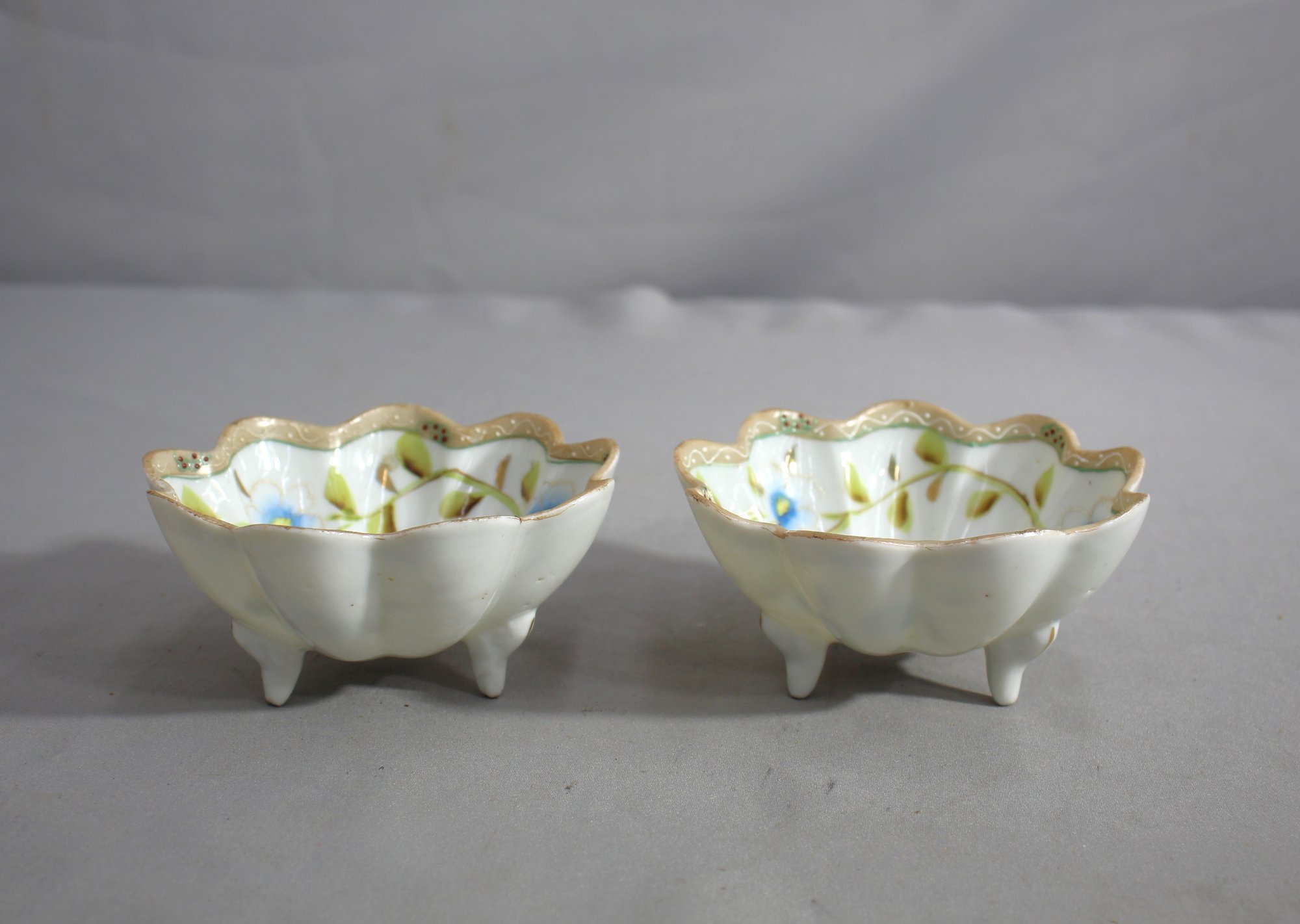 Each bowl is crafted with a gentle scalloped edge and stands on three dainty feet, creating an elevated presentation that is both elegant and functional. The exterior's creamy backdrop is adorned with delicate blue flowers, their petals and leaves painted with a softness that evokes a serene garden scene.