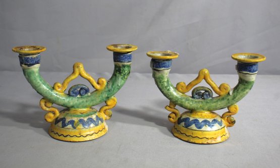 These candle holders exude the quintessential charm of majolica pottery, known for its rich colors and detailed glazing techniques.