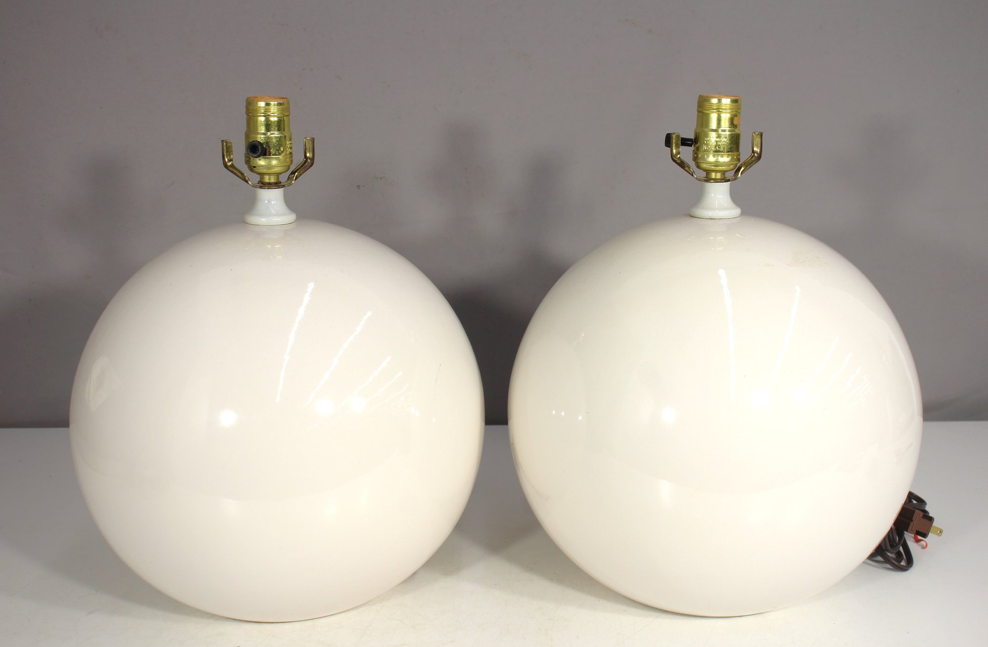Enhance your space with this stunning pair of vintage mid-century modern white globe table lamps. Their sleek, spherical design offers a timeless and minimalist aesthetic, perfect for modern, retro, or contemporary interiors.