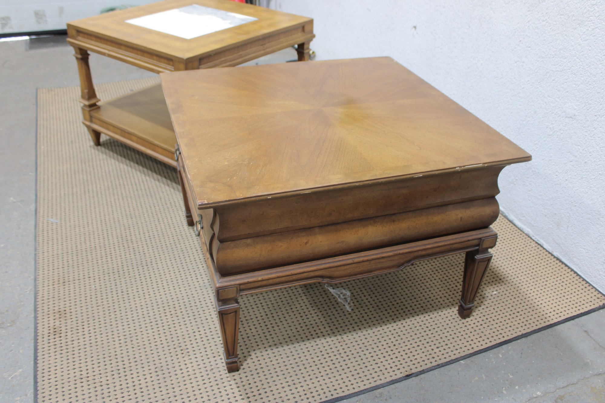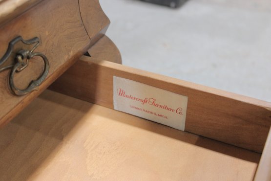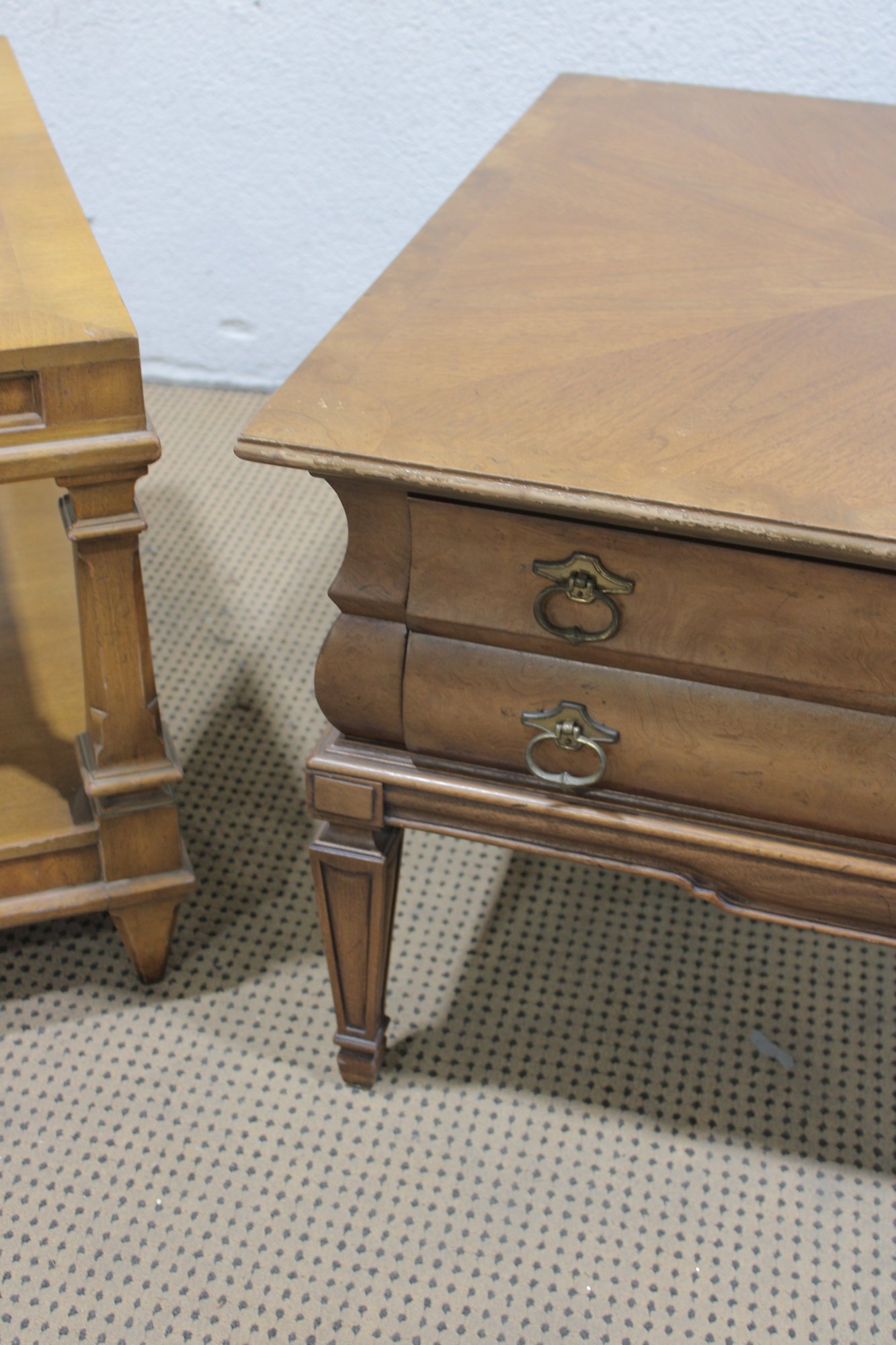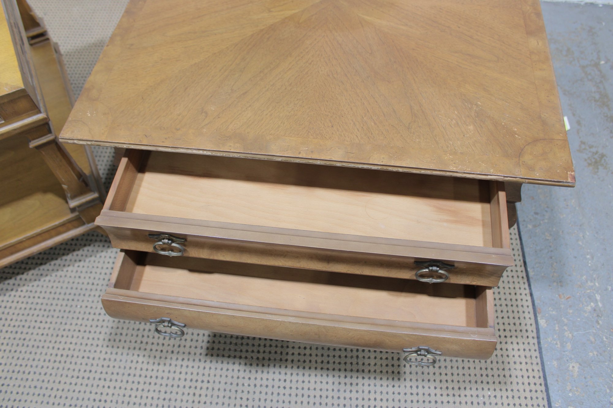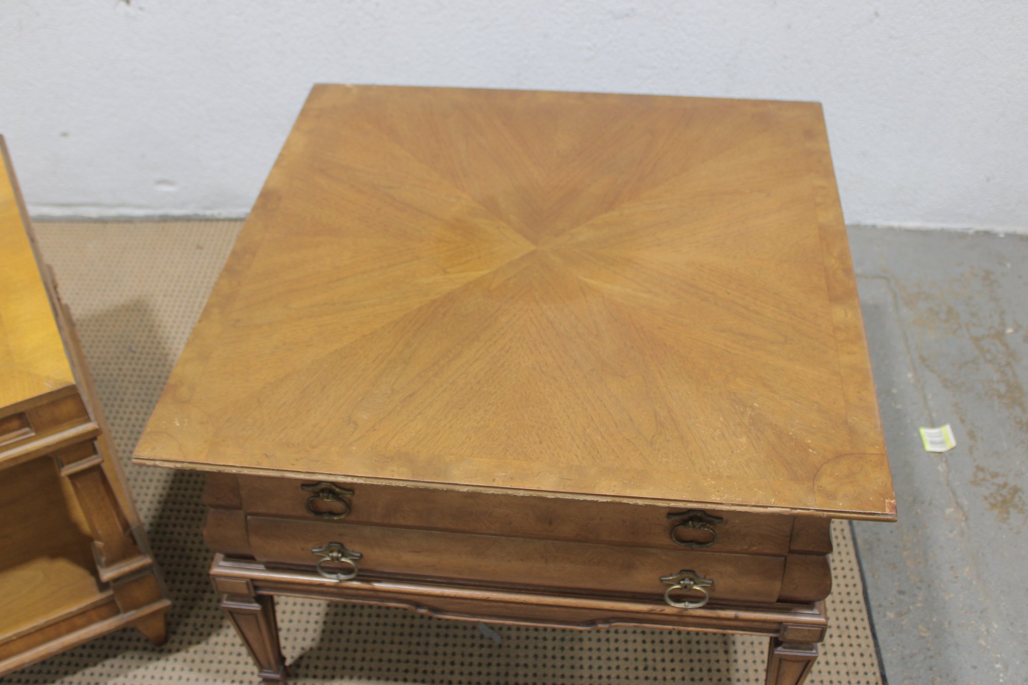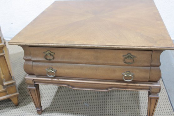 Quality two-drawer end table by Heritage Furniture, showcasing classic craftsmanship and a beautifully grained wood top with subtle geometric patterning. The gently curved apron, traditional hardware, and tapered legs give this piece an elegant, timeless profile.