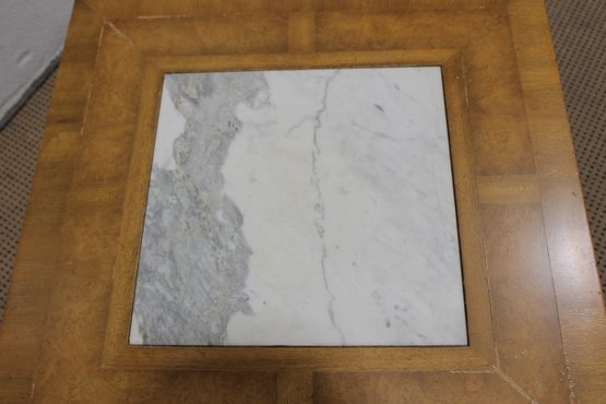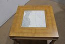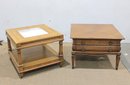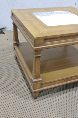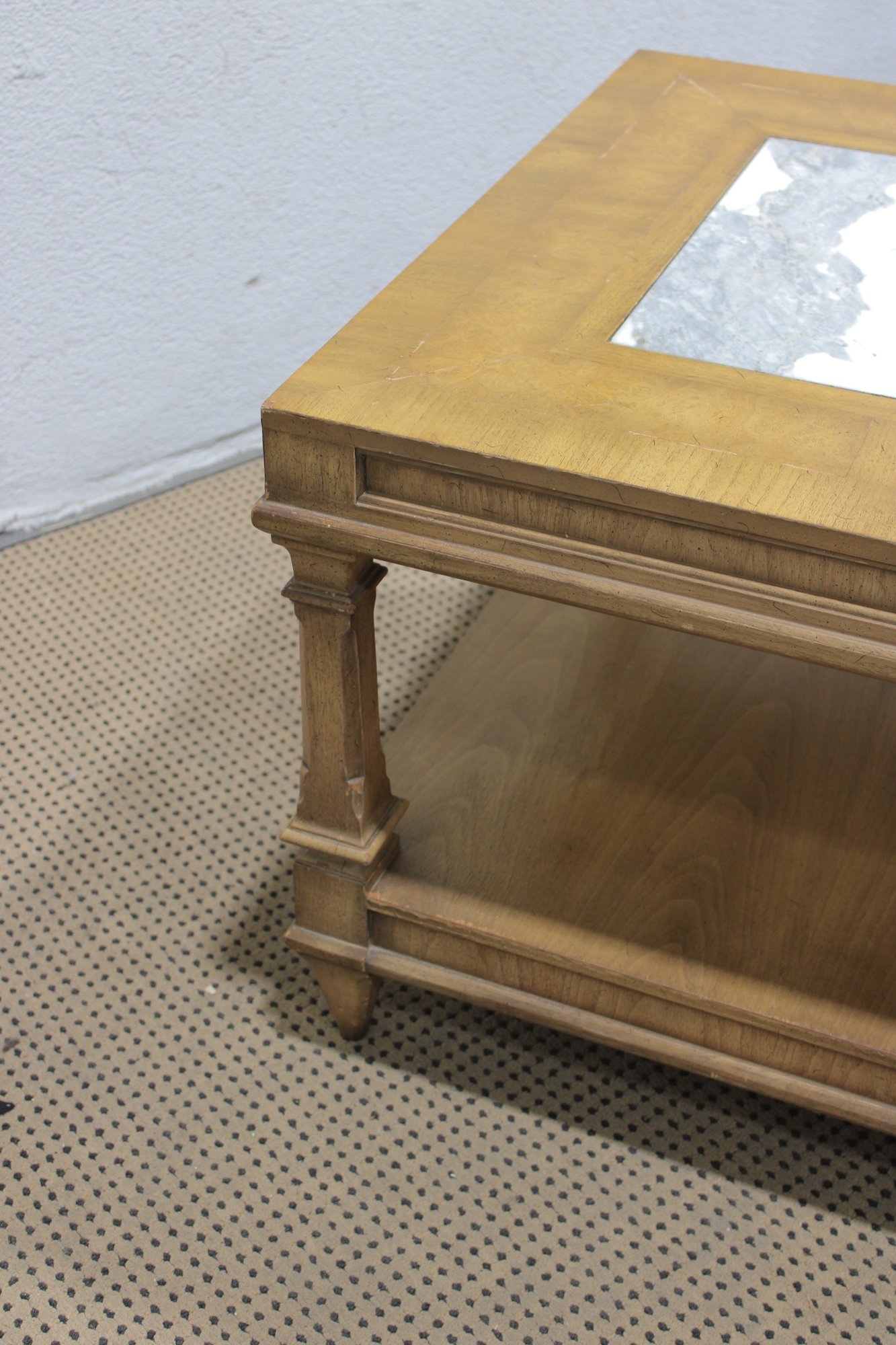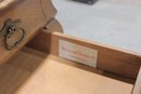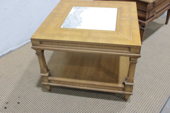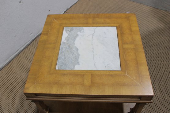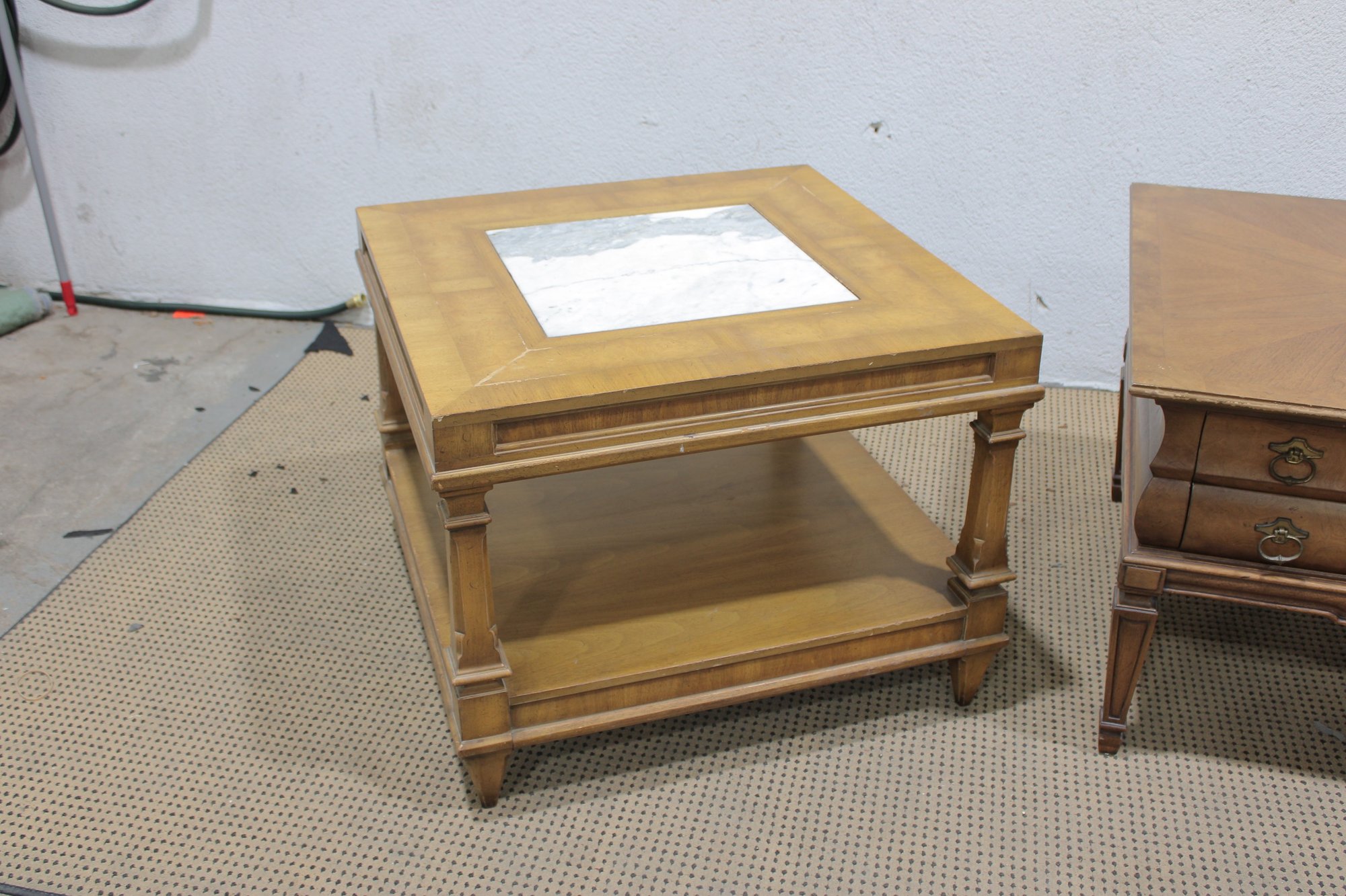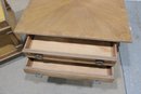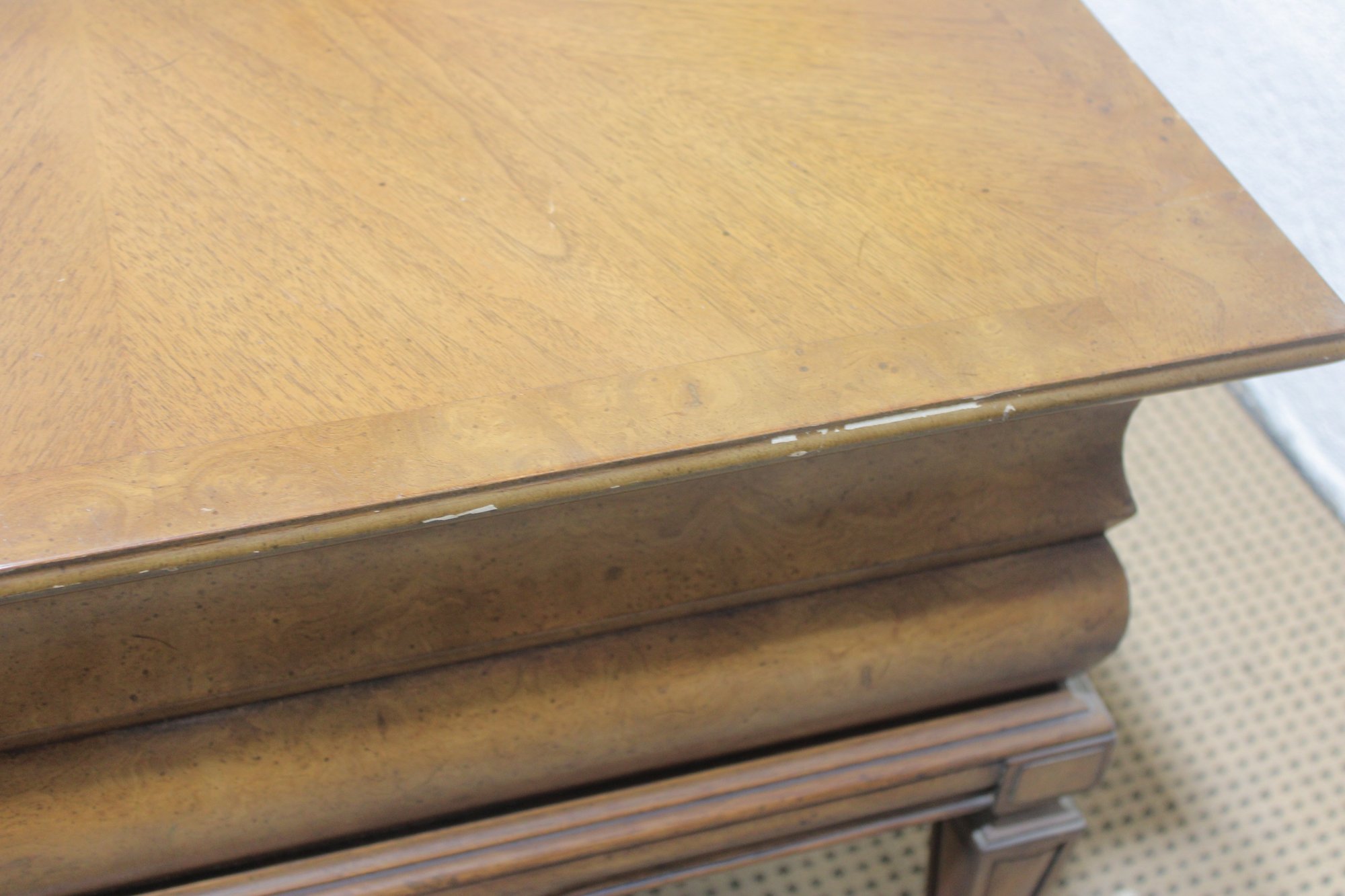Quality two-drawer end table by Heritage Furniture, showcasing classic craftsmanship and a beautifully grained wood top with subtle geometric patterning. The gently curved apron, traditional hardware, and tapered legs give this piece an elegant, timeless profile.