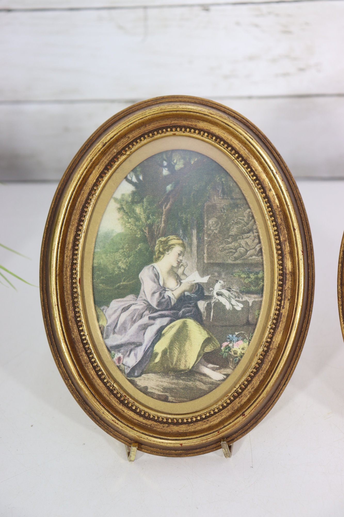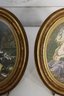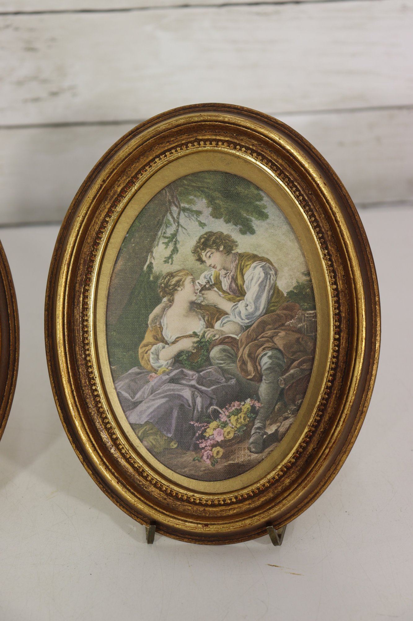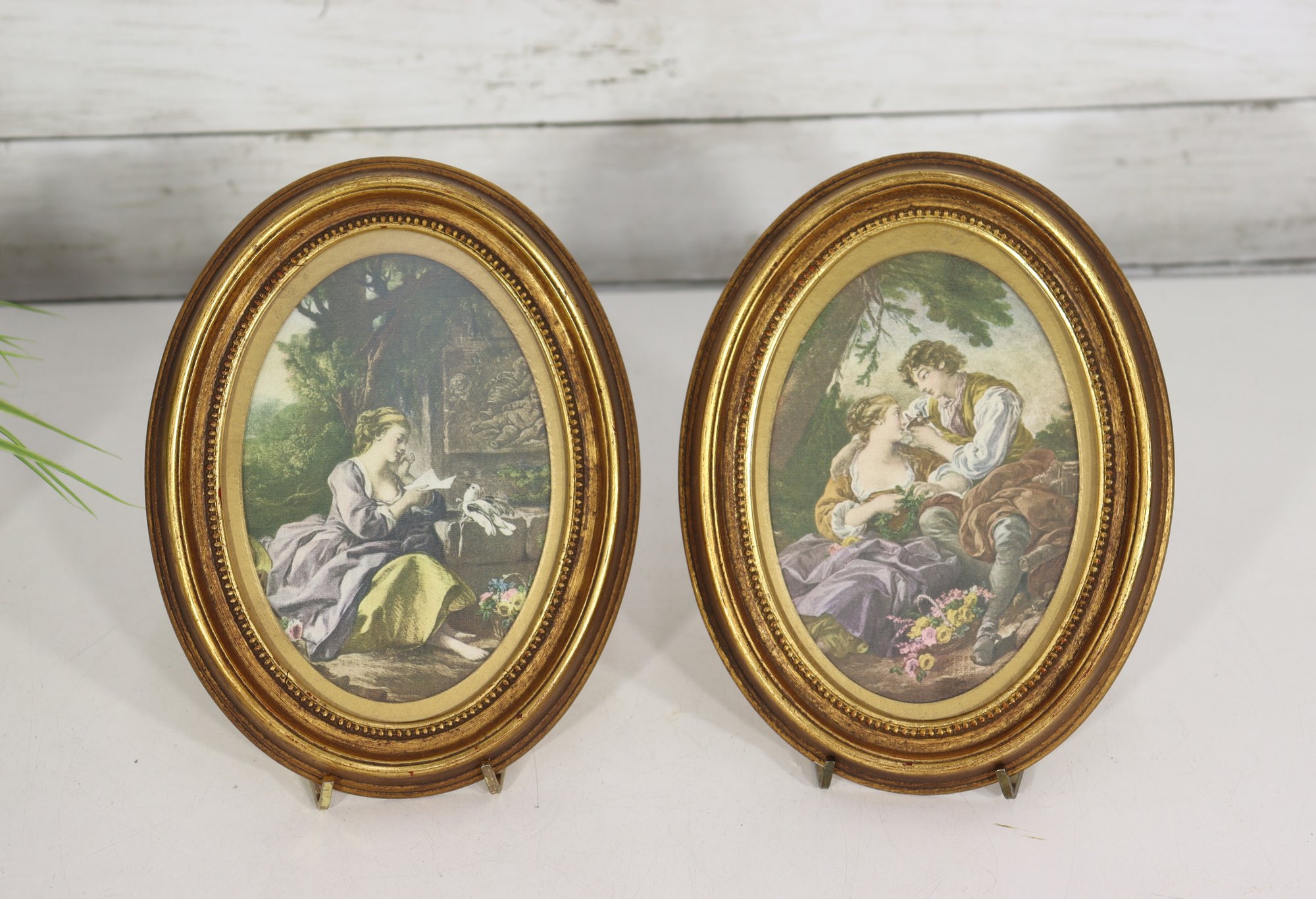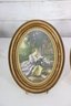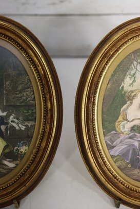 Beautiful pair of vintage oval framed romantic prints featuring classic Victorian style pastoral courting scenes. Each print is set inside an ornate gold toned oval frame with beaded detailing. Lovely soft color palette with great period charm.