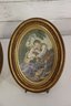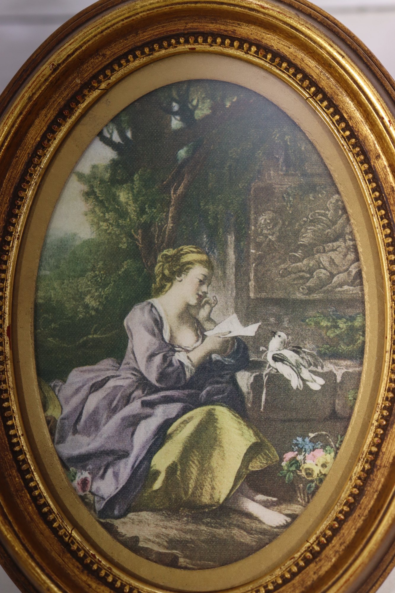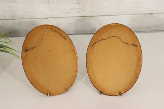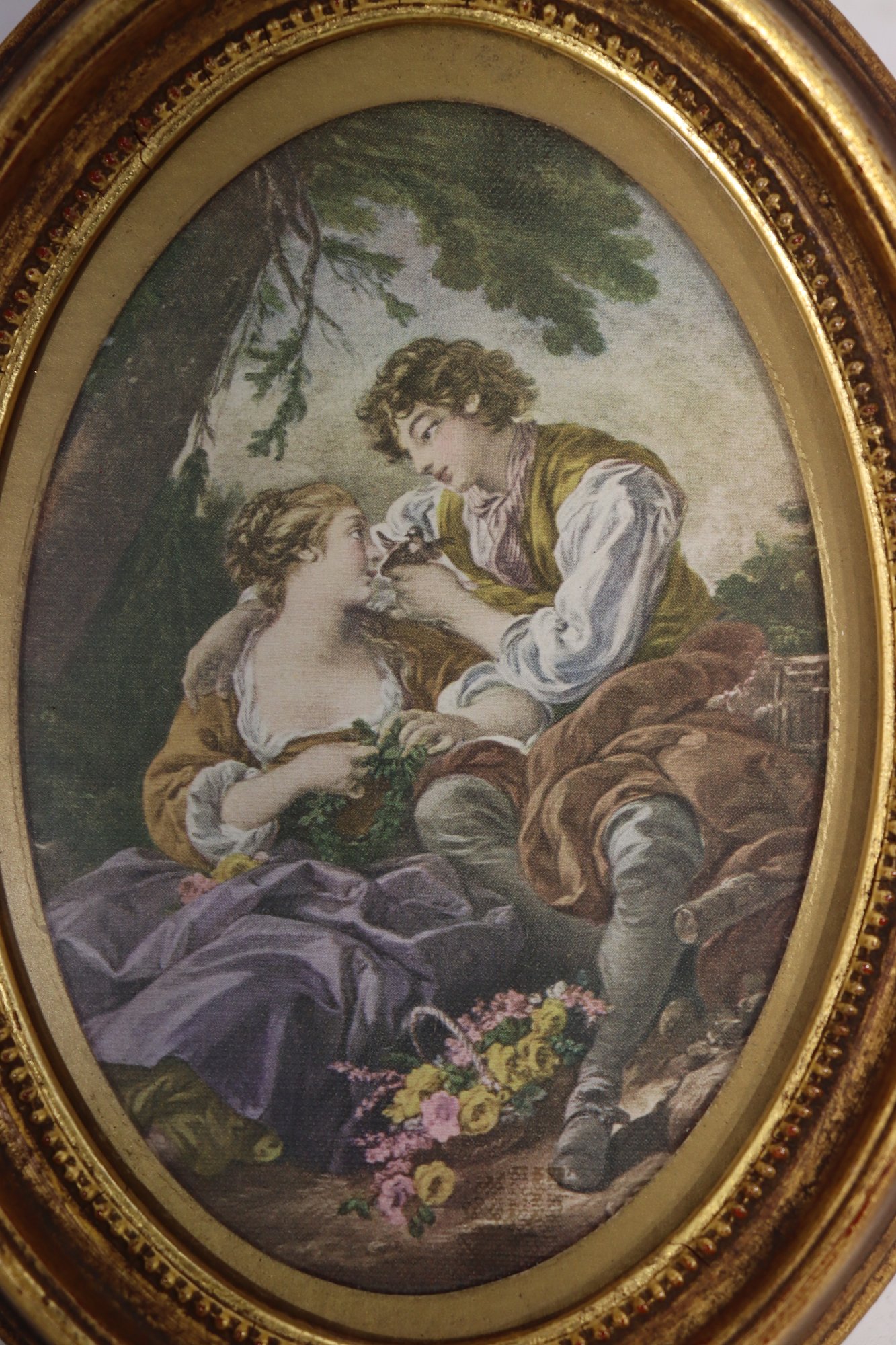 Beautiful pair of vintage oval framed romantic prints featuring classic Victorian style pastoral courting scenes. Each print is set inside an ornate gold toned oval frame with beaded detailing. Lovely soft color palette with great period charm.