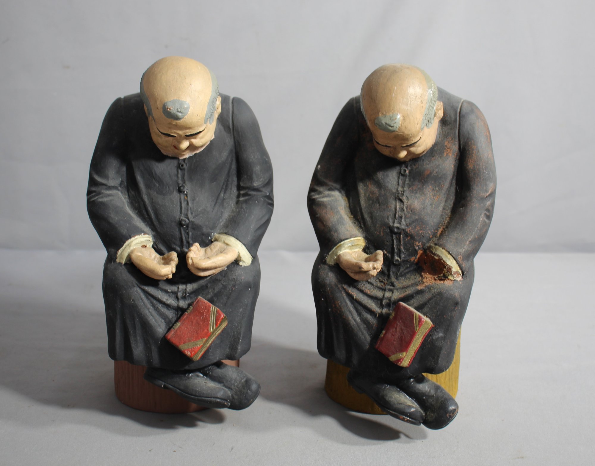 Each figure is seated, donned in traditional black robes with subtle golden accents at the cuffs, and engrossed in reading a red book. One of the figures, however, has experienced the passage of time more acutely, as evidenced by the missing hand,These characterful statuettes stand on wooden bases