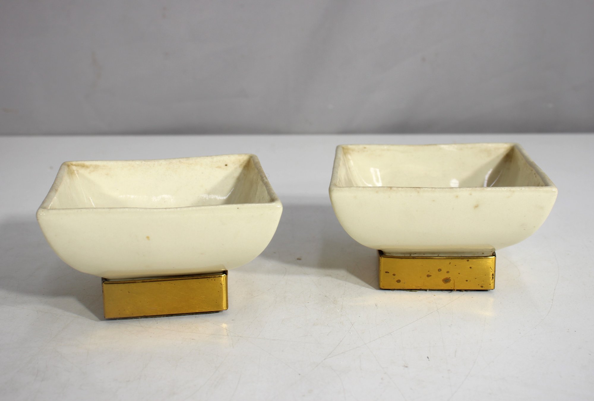 pair of vintage square ceramic bowls features a cream-colored glaze with a minimalist design, resting on solid brass bases for a touch of sophistication. The unique square shape and raised platform base make them perfect for decorative display, trinket storage, or as stylish serving pieces.