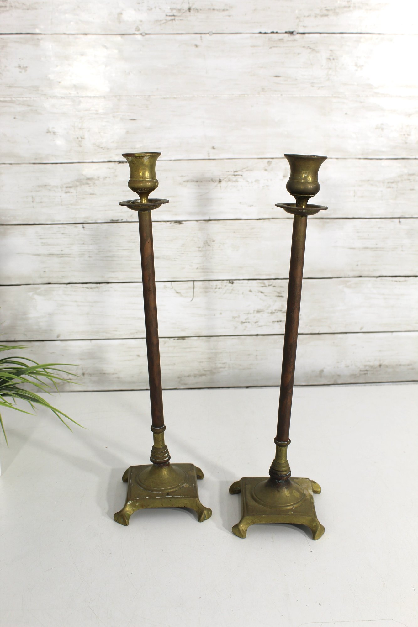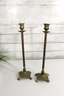 pair of vintage brass candlestick holders, featuring tall slender stems and decorative footed bases. Their elegant form and aged patina add timeless character, perfect for both traditional and eclectic interiors.