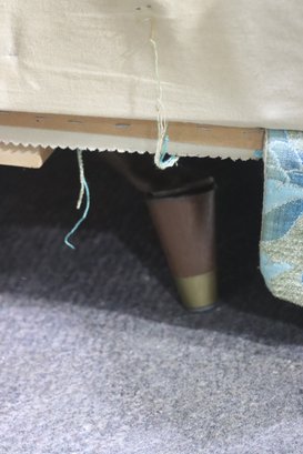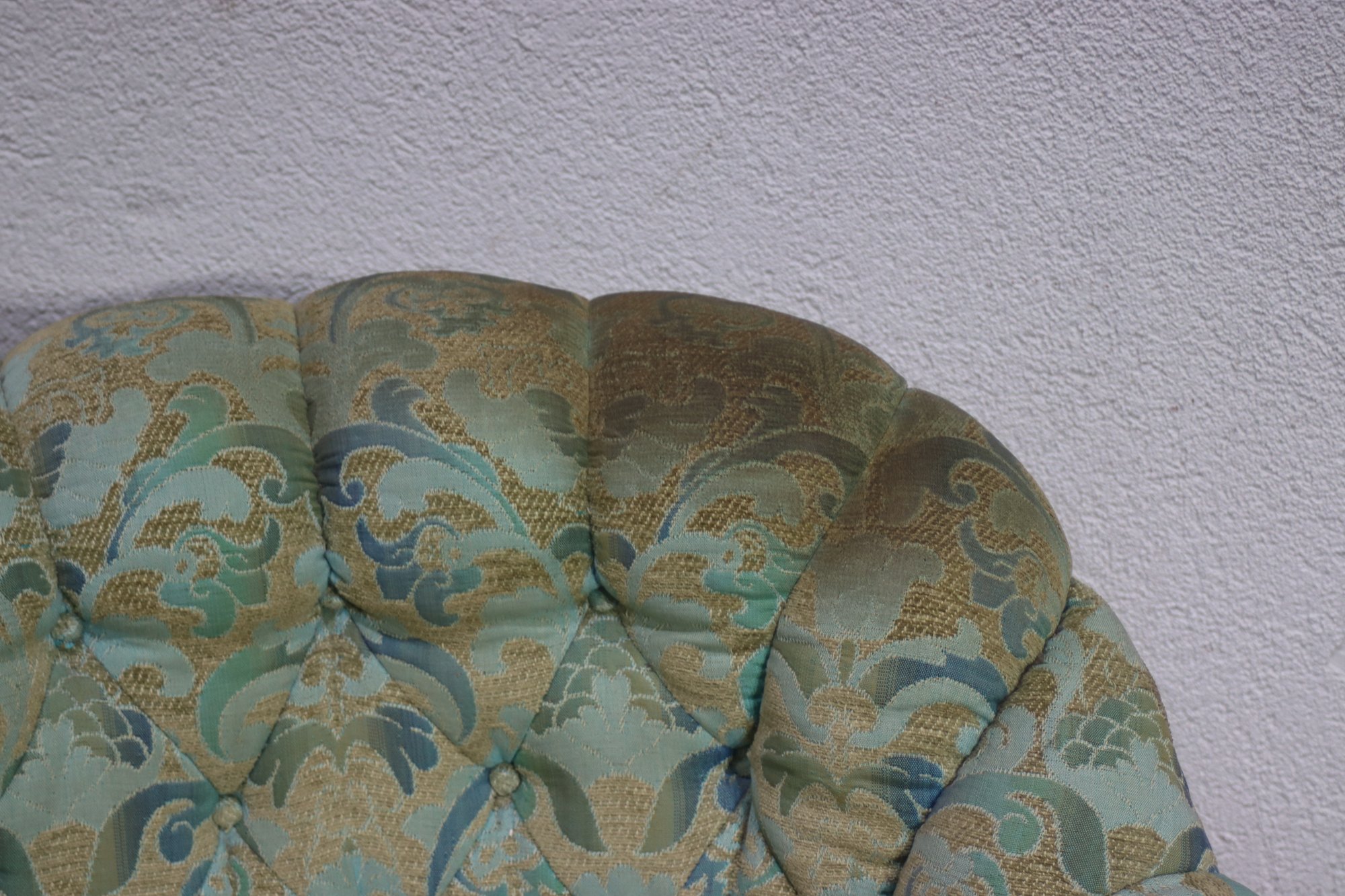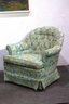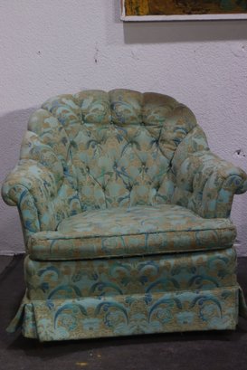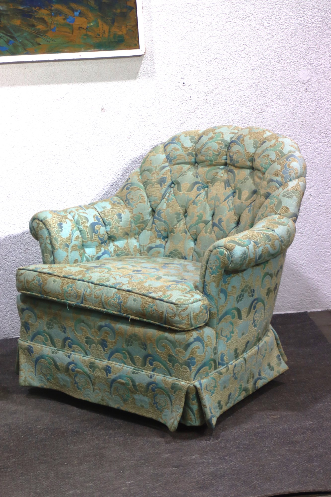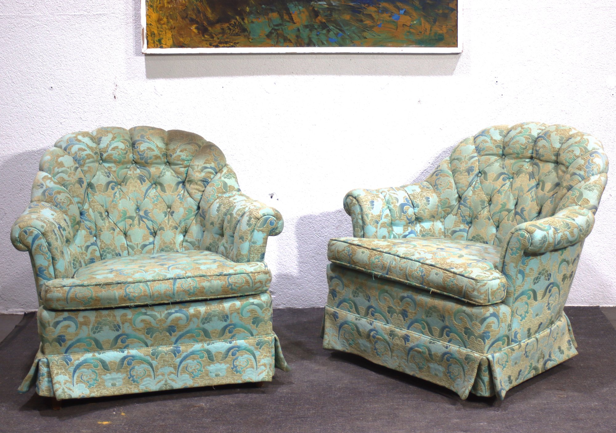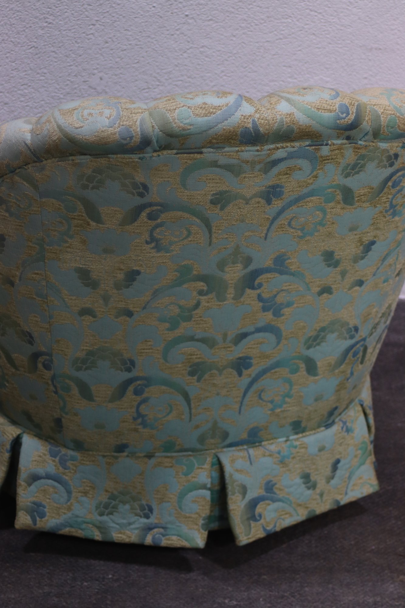 Bring a touch of vintage elegance to your home with this gorgeous pair of tufted club chairs, featuring scalloped backs, plush upholstery, and a skirted base. One chair is a swivel chair with hidden legs, while the other is a stationary armchair with tapered wooden feet. The beautiful aqua and gold damask fabric adds a sophisticated, classic charm to any space.