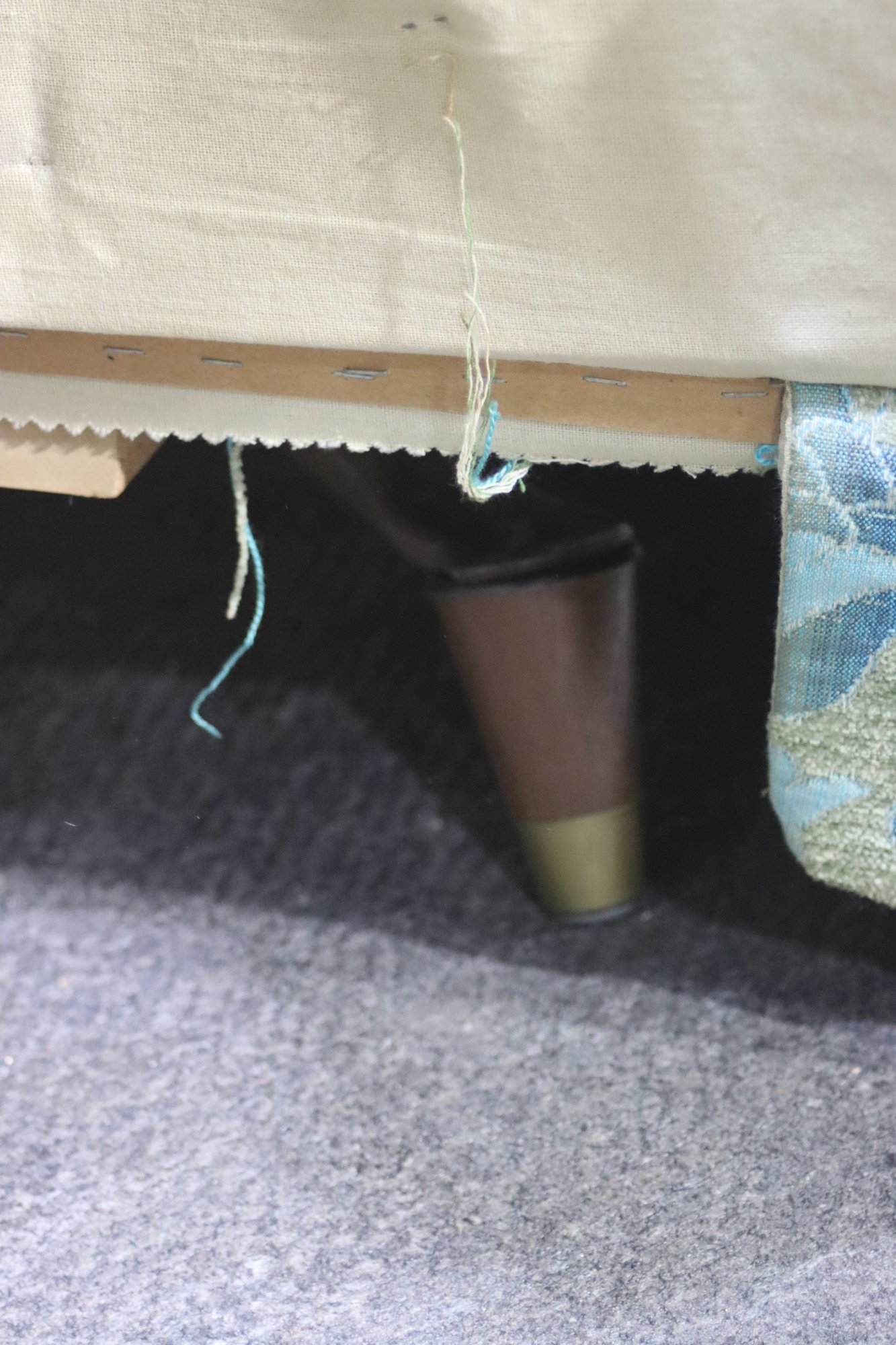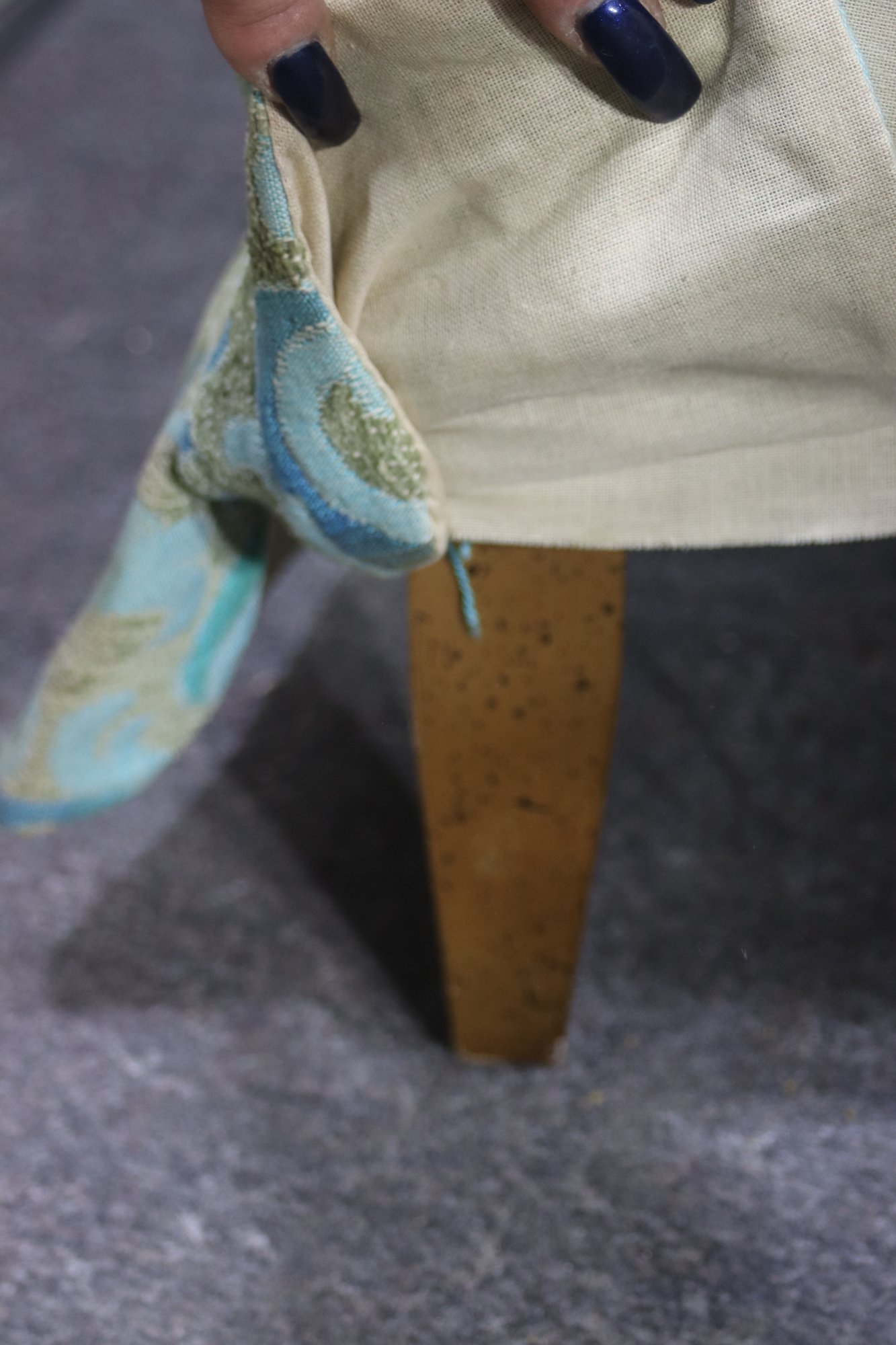 Both chairs are in vintage condition, with visible wear on the upholstery, including some fading and light fabric distress (as shown in photos). The frames remain structurally solid, and the swivel chair rotates smoothly. A fantastic candidate for reupholstery or use as-is for a charming, well-loved vintage look.