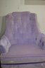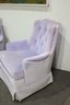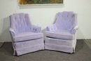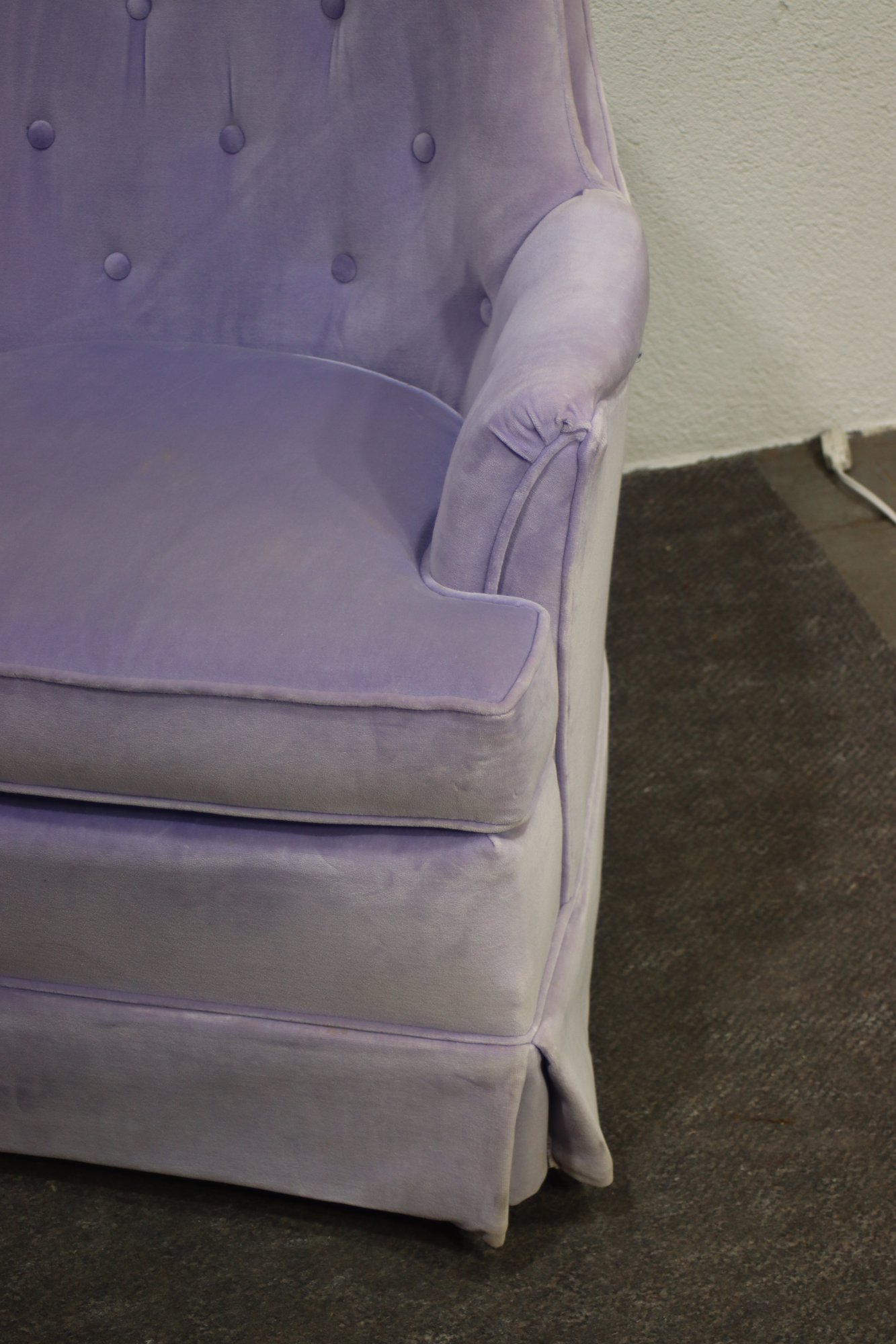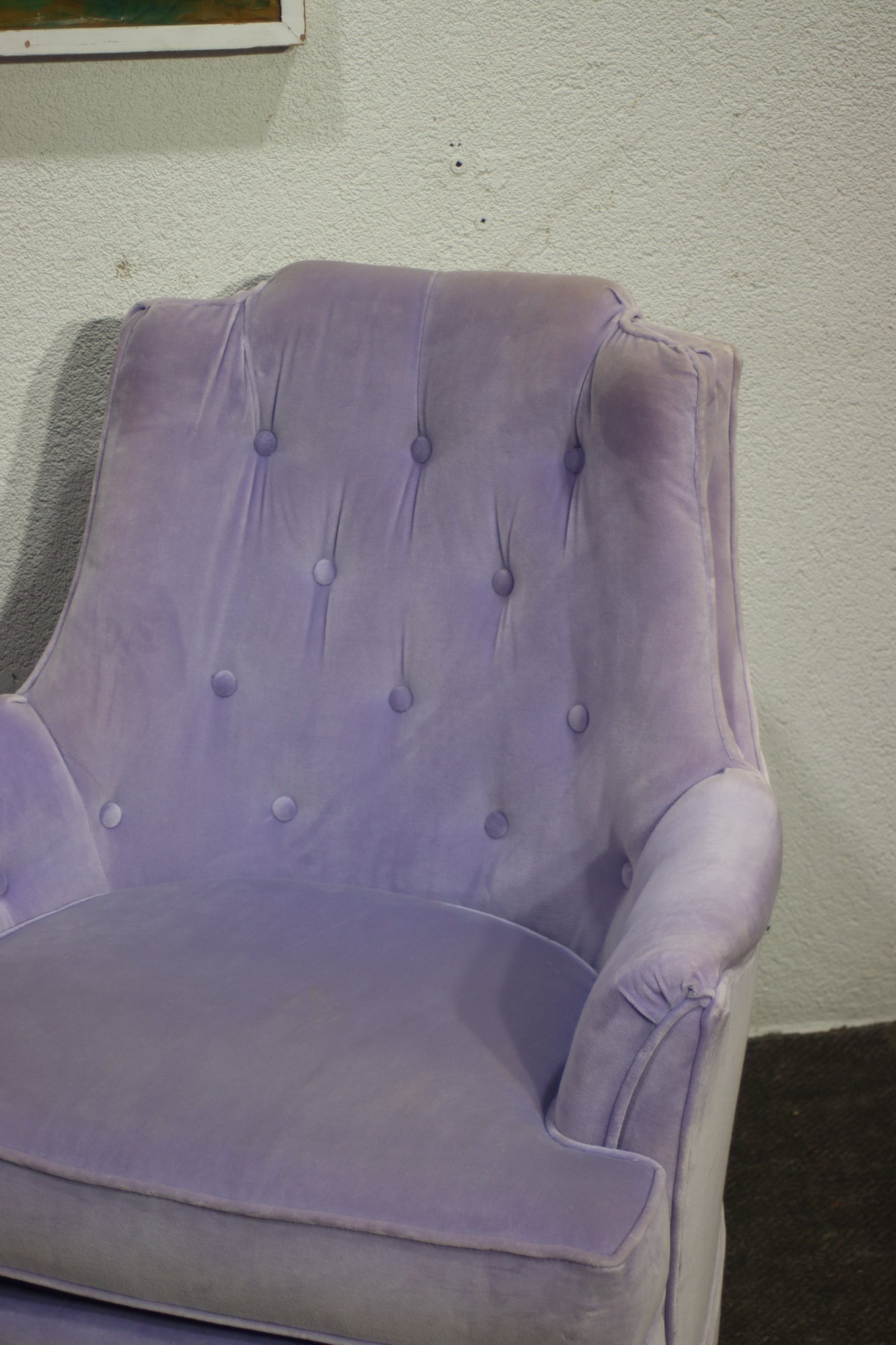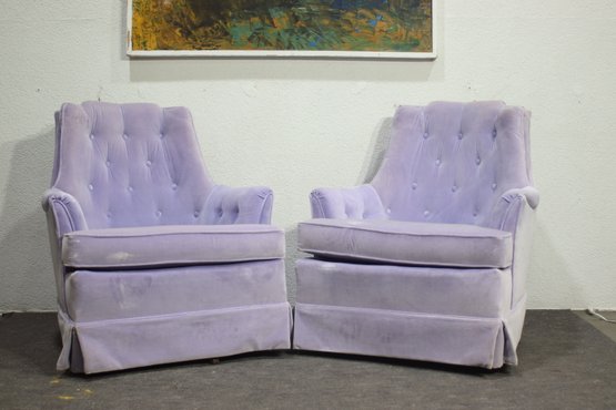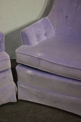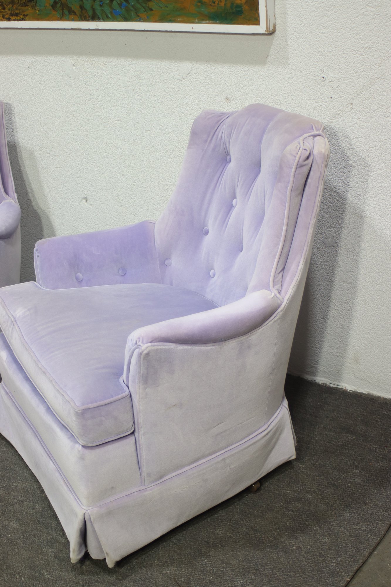 Indulge in vintage luxury with this gorgeous pair of tufted lounge chairs, featuring plush lilac velvet upholstery and a classic Hollywood Regency design. With their elegantly curved backs, deep seating, and tailored skirted base, these chairs bring timeless sophistication to any space.