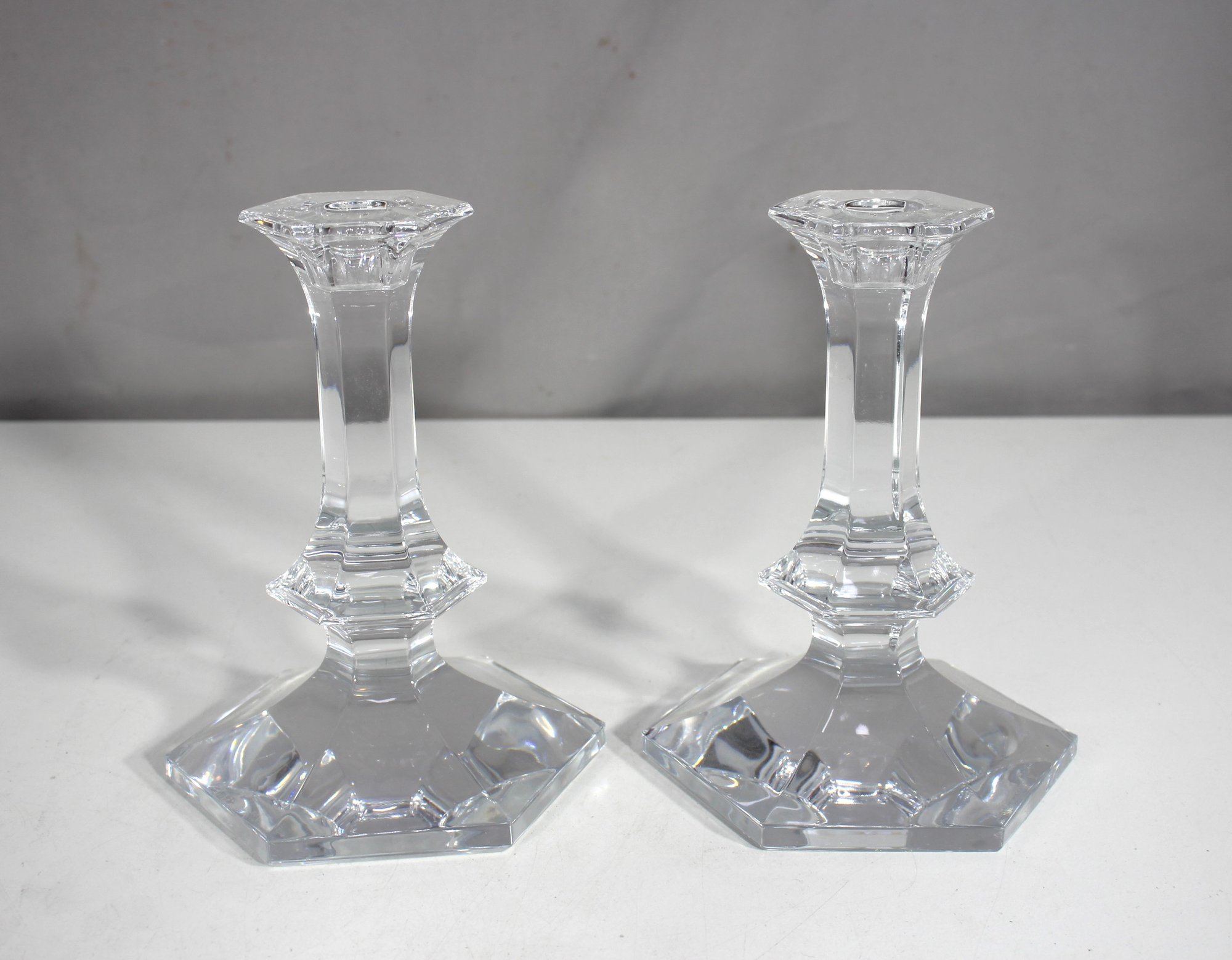 pair of vintage Val St. Lambert full lead crystal candlesticks, each finely crafted with a faceted hexagonal base and classic silhouette. These elegant candle holders stand approximately 7 inches tall and showcase the exceptional clarity and brilliance that define Val St. Lambert’s renowned Belgian craftsmanship.