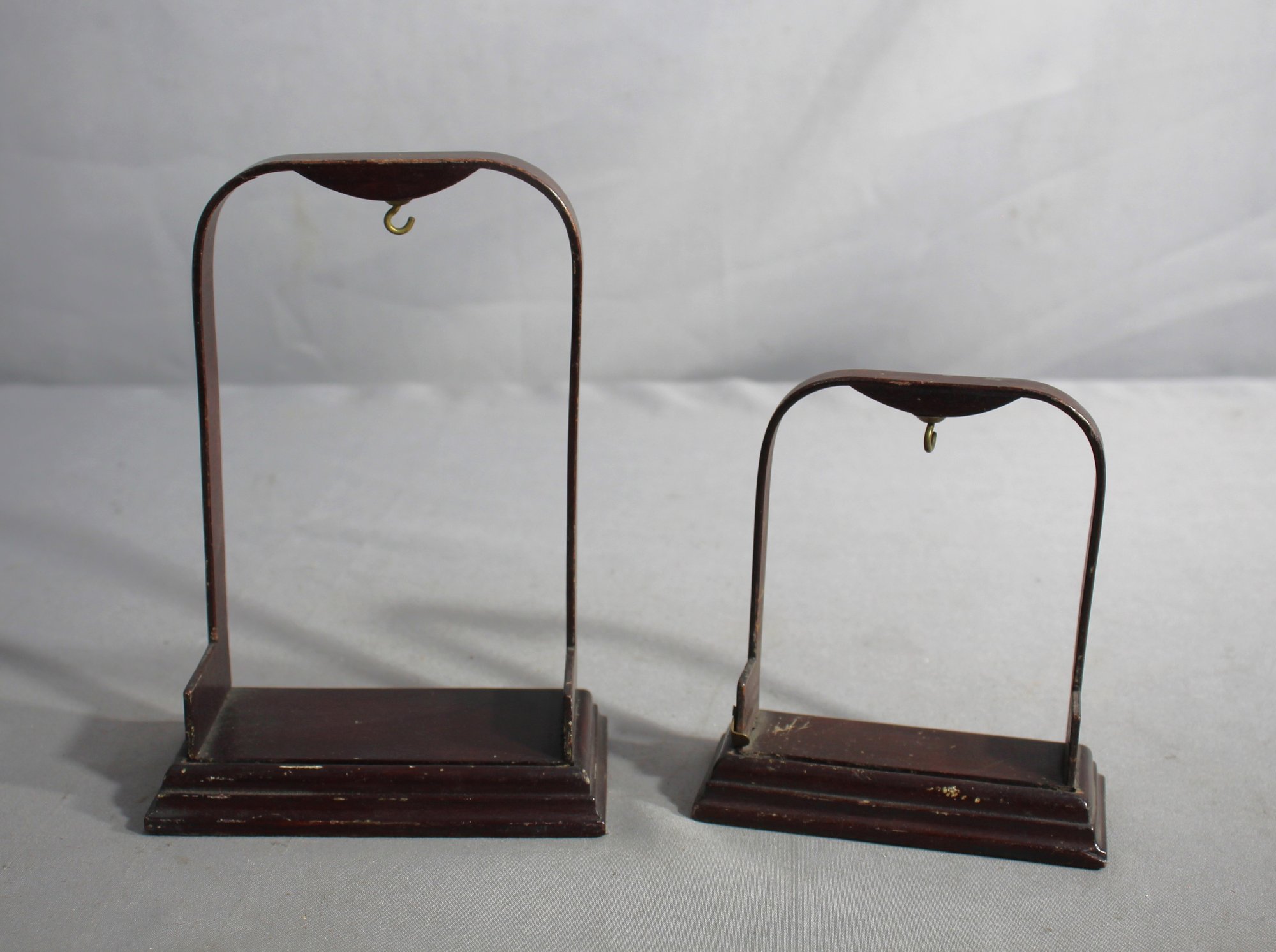 These two stands are designed to securely hold and display treasured timepieces, offering both functionality and a touch of antiquity to any room's decor. Each stand, crafted from richly toned wood, boasts a simple yet elegant arch with a hook to cradle a pocket watch, highlighting the watches' design and craftsmanship when not being carried.