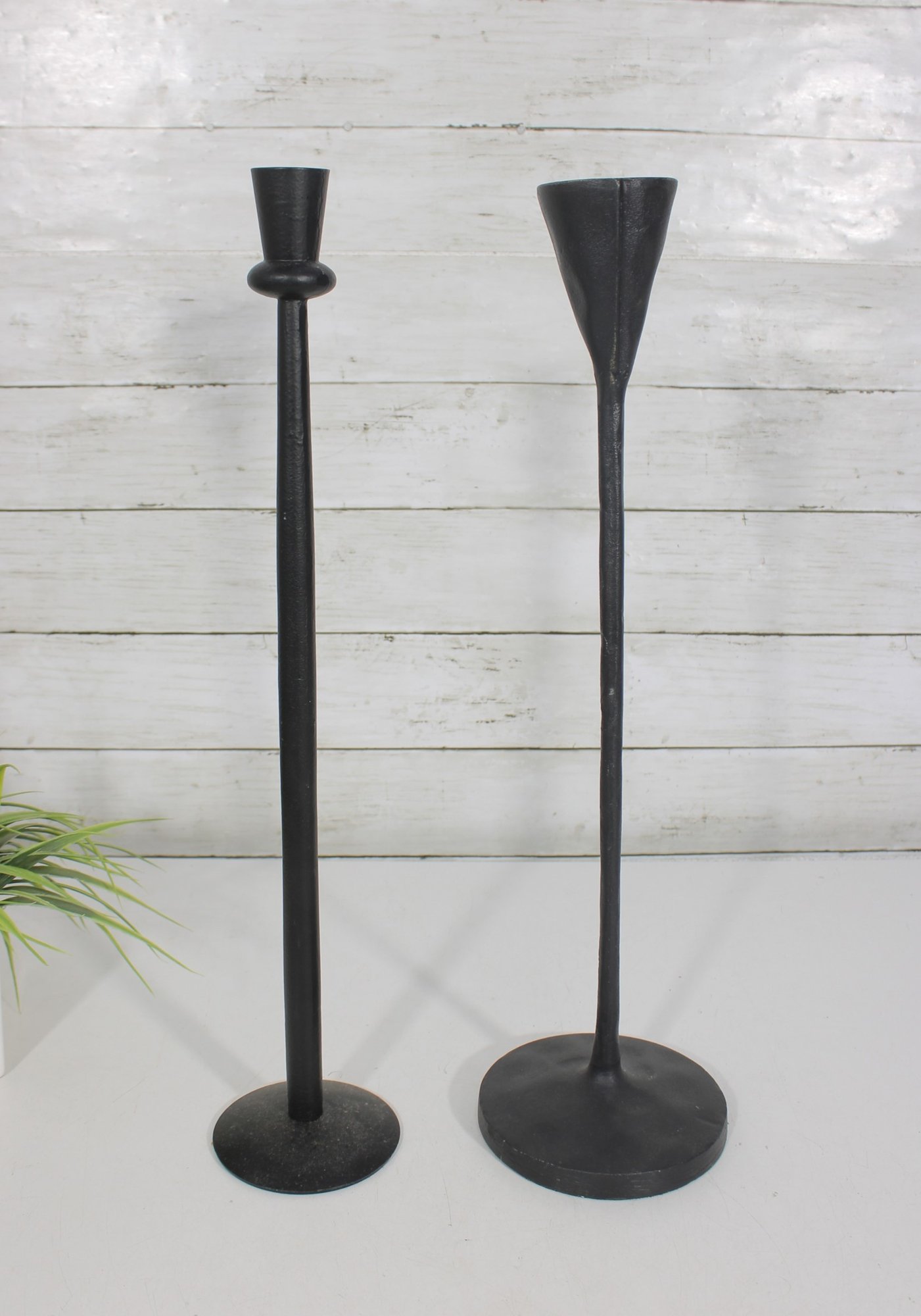 Each candlestick has a slender stem with a sturdy round base, offering both elegance and stability. The two holders feature slightly different cup styles, adding subtle visual interest while maintaining a cohesive look.