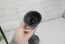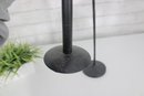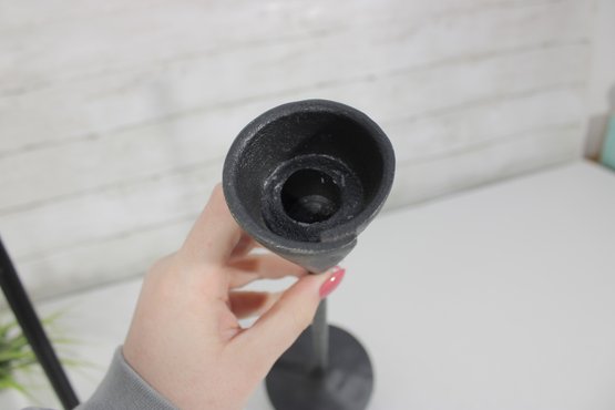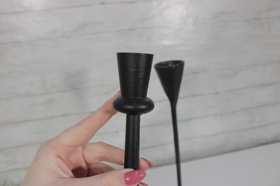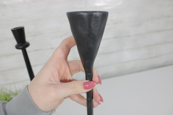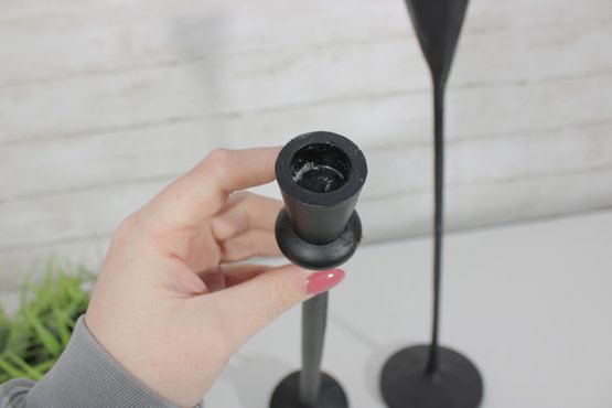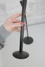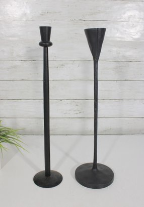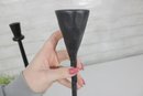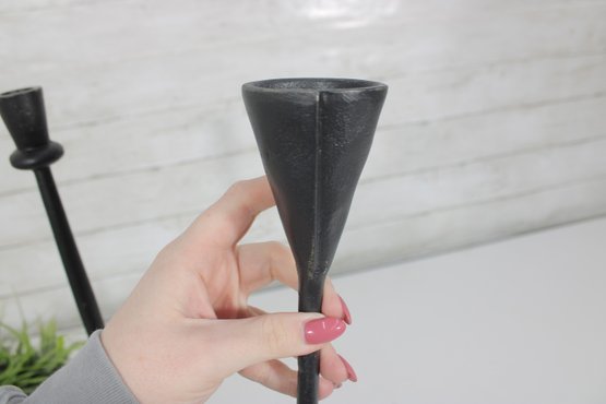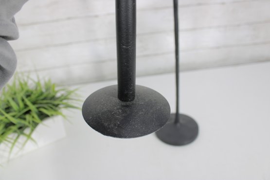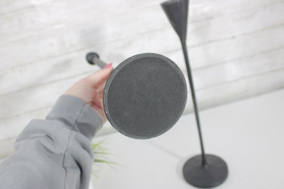 Sleek and stylish pair of tall black metal candlesticks, featuring a minimalist modern design with clean lines and a matte textured finish.