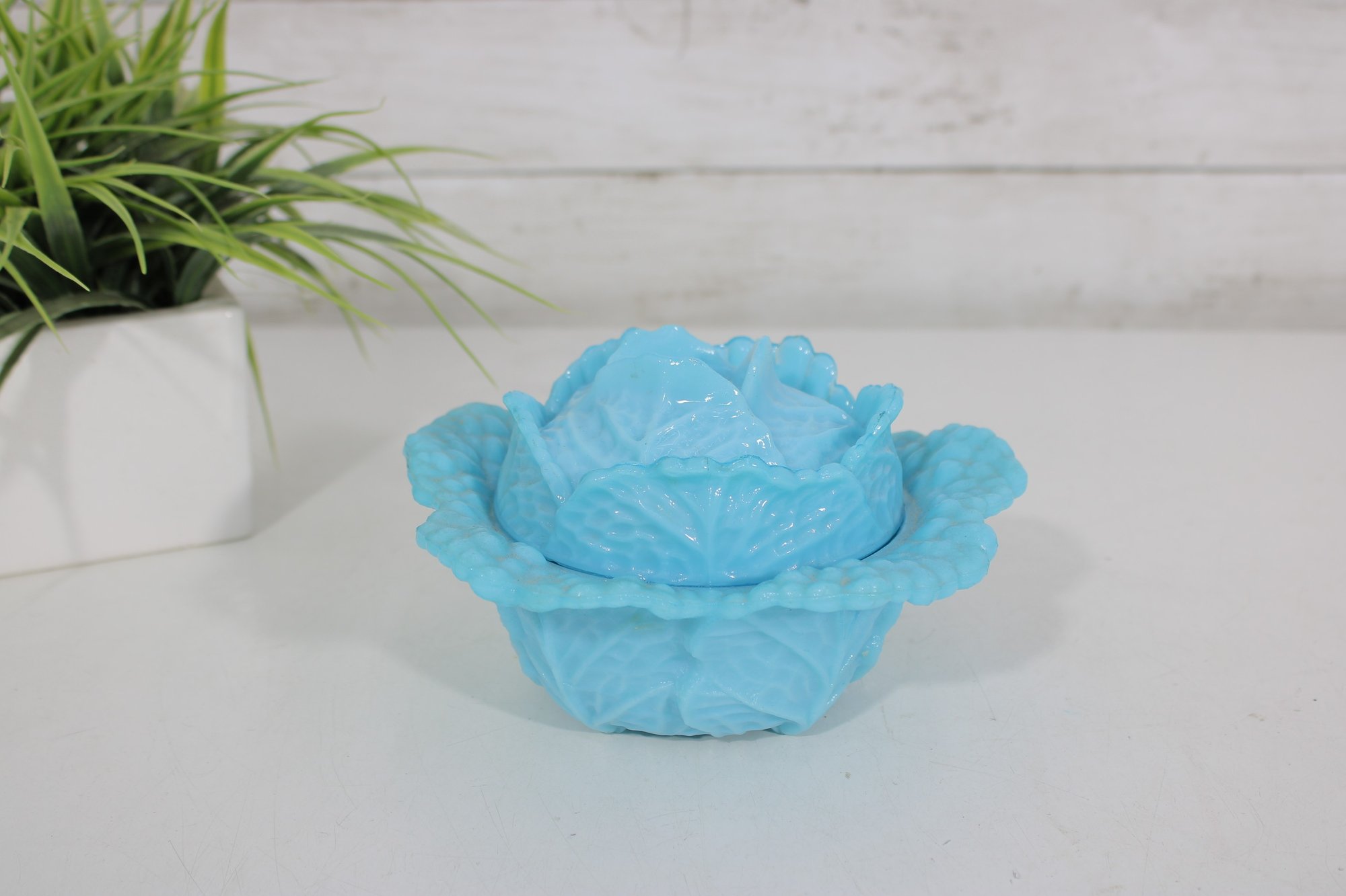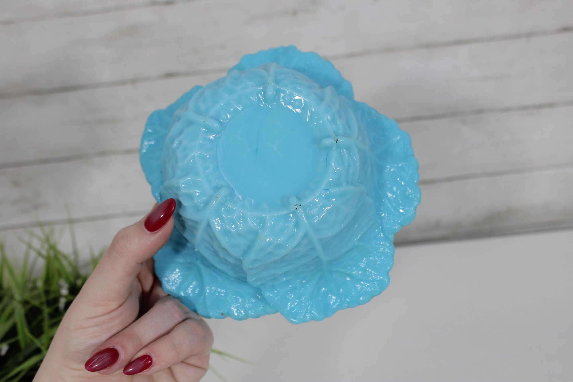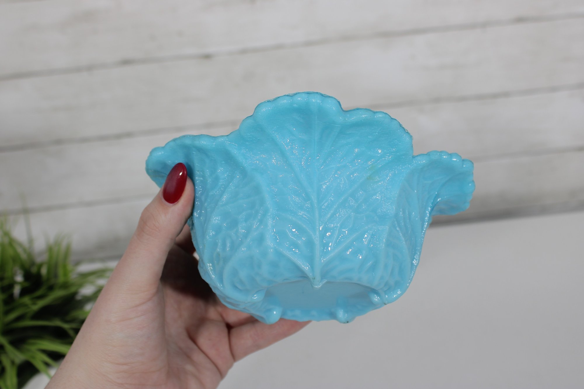 Charming pair of vintage molded glass cabbage bowls, each measuring approximately 4" tall by 6.5" in diameter. This set includes one vibrant turquoise blue bowl and one classic milk glass example, both featuring detailed cabbage leaf forms with textured veining and layered petal-like edges.