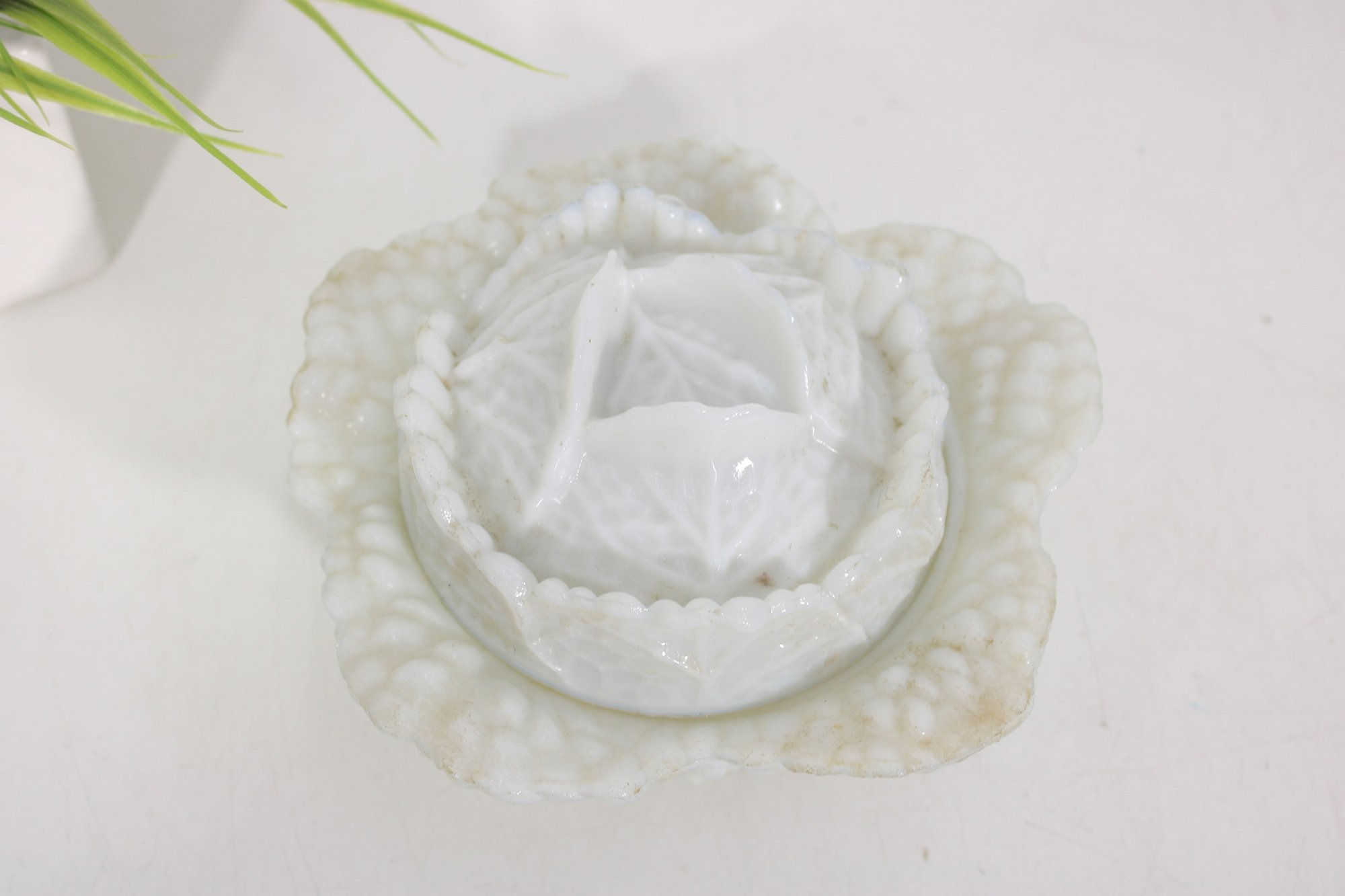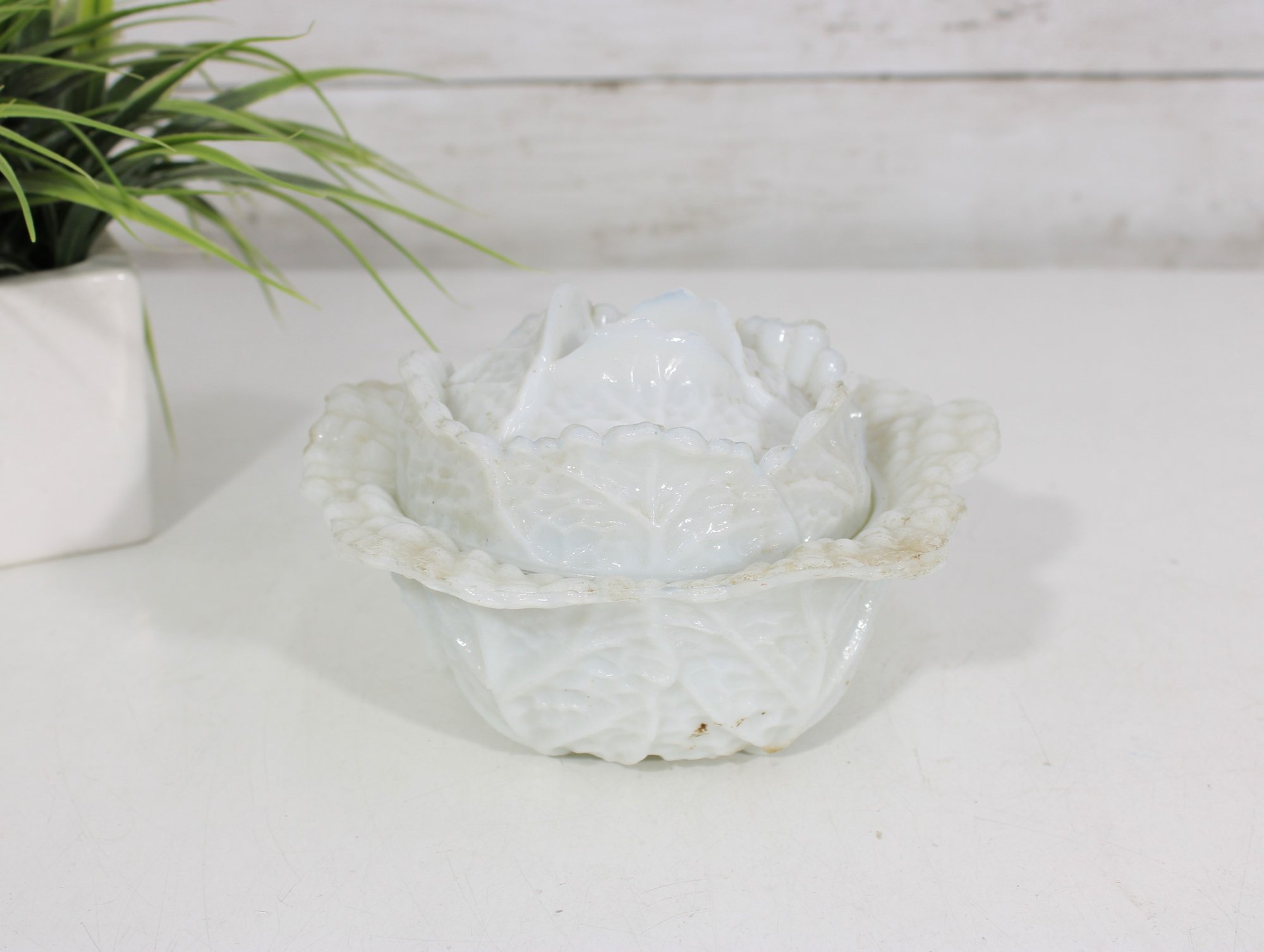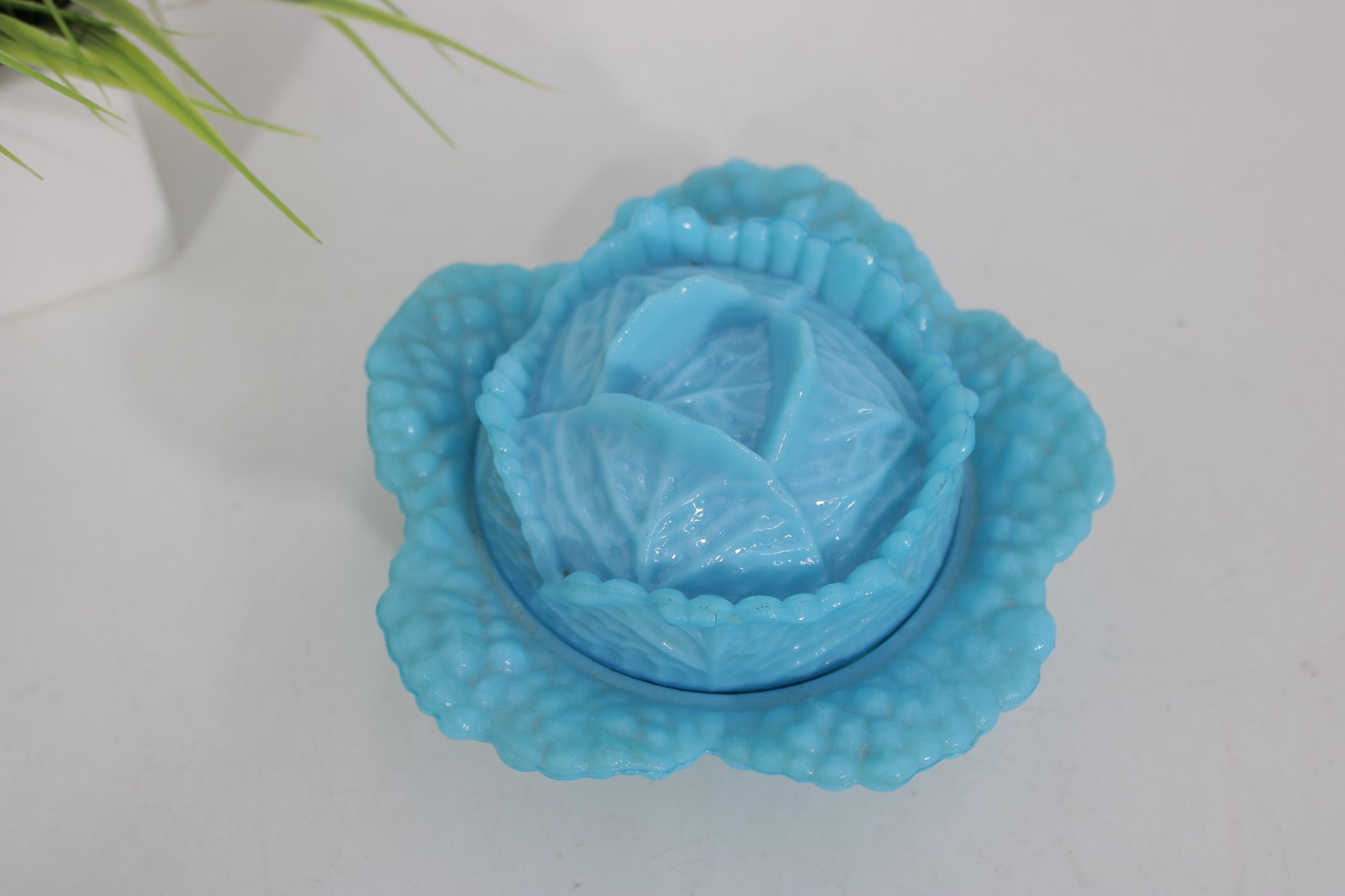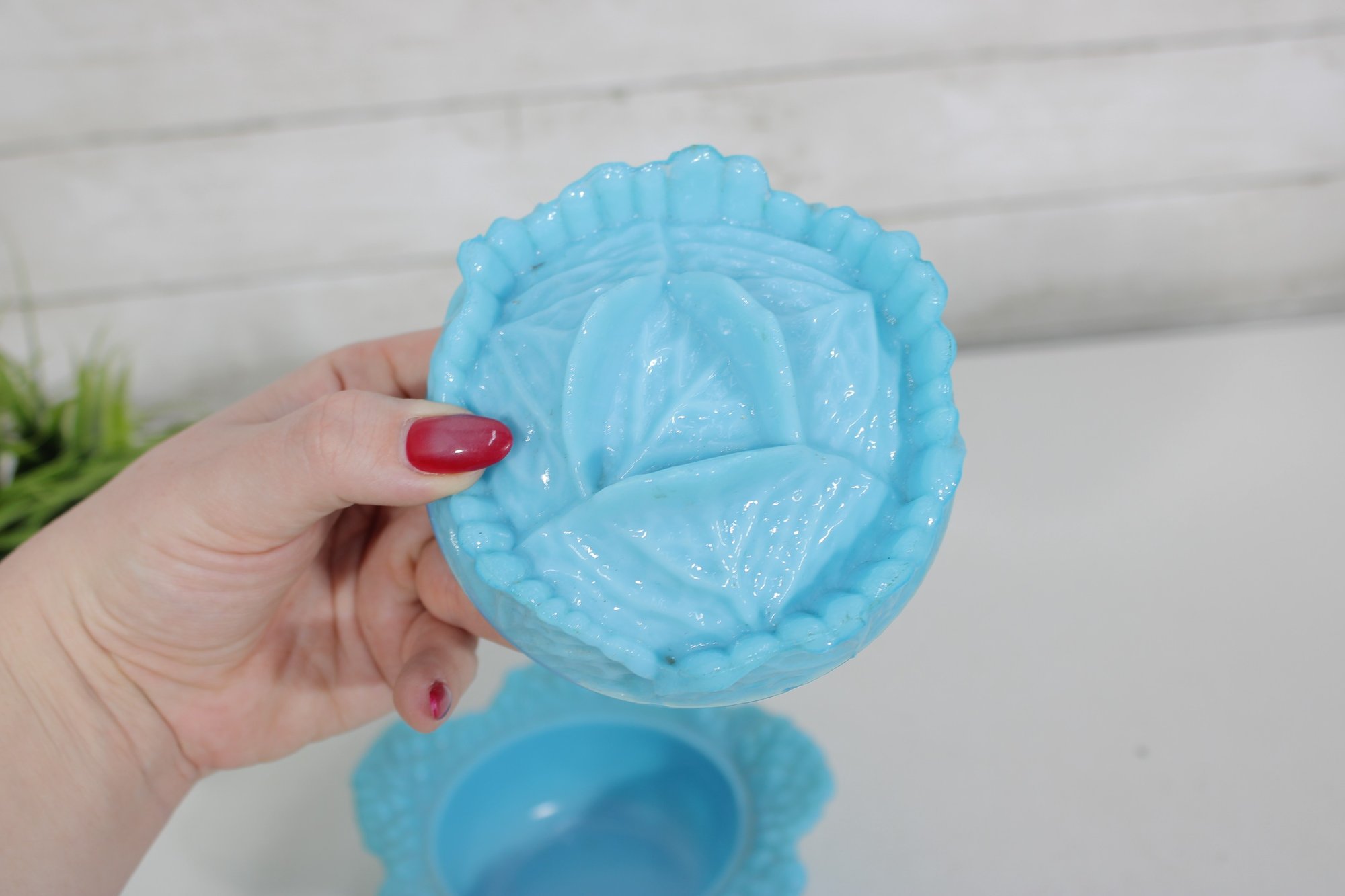 Charming pair of vintage molded glass cabbage bowls, each measuring approximately 4" tall by 6.5" in diameter. This set includes one vibrant turquoise blue bowl and one classic milk glass example, both featuring detailed cabbage leaf forms with textured veining and layered petal-like edges.