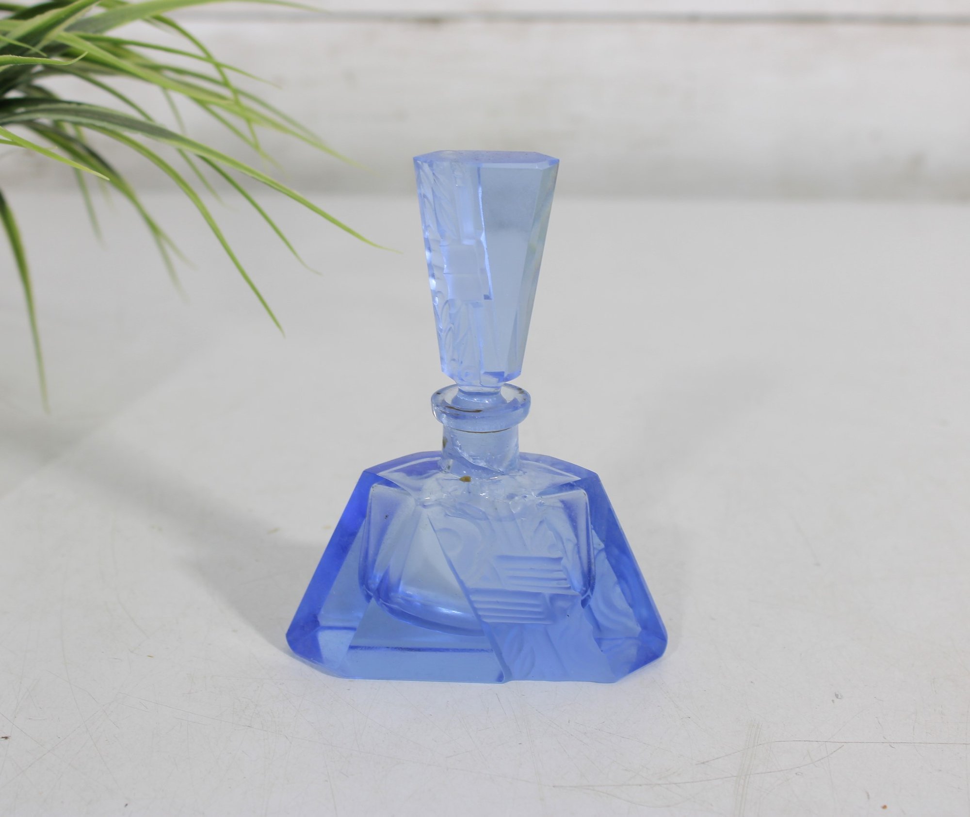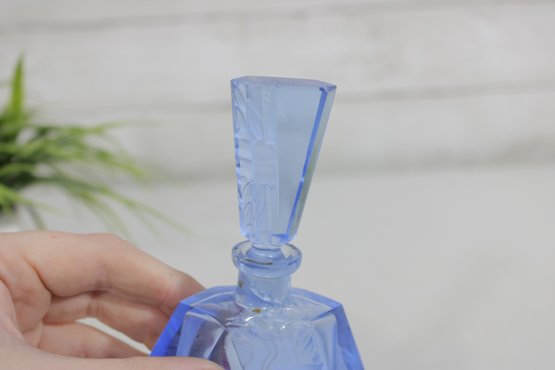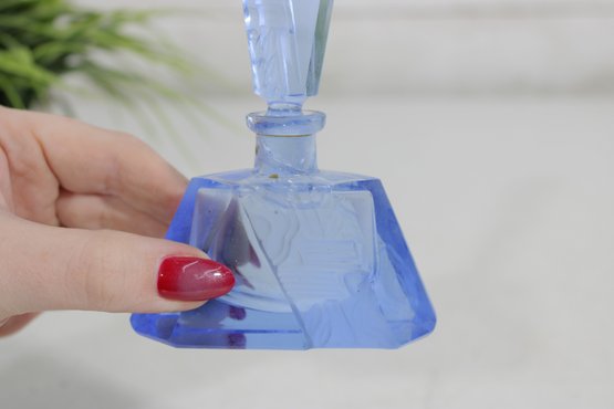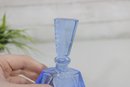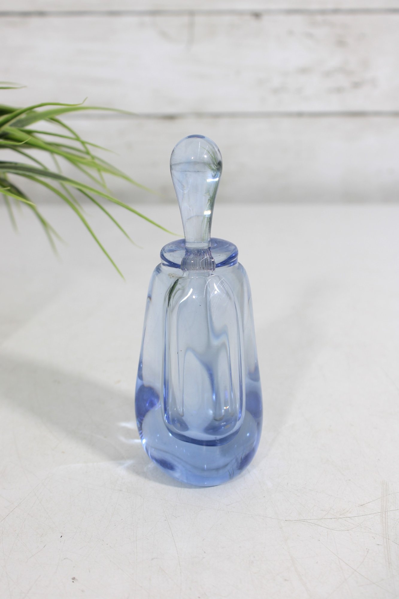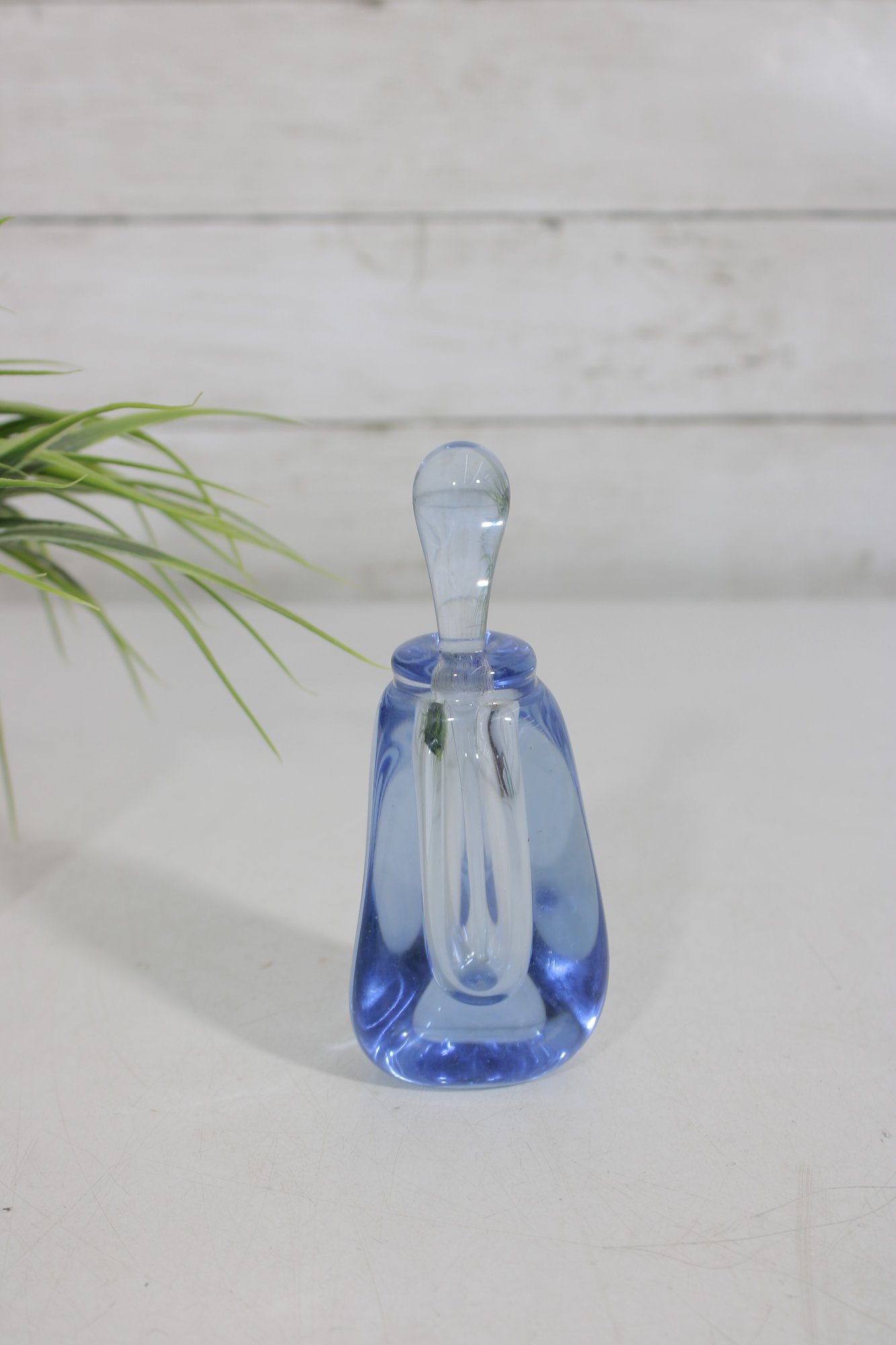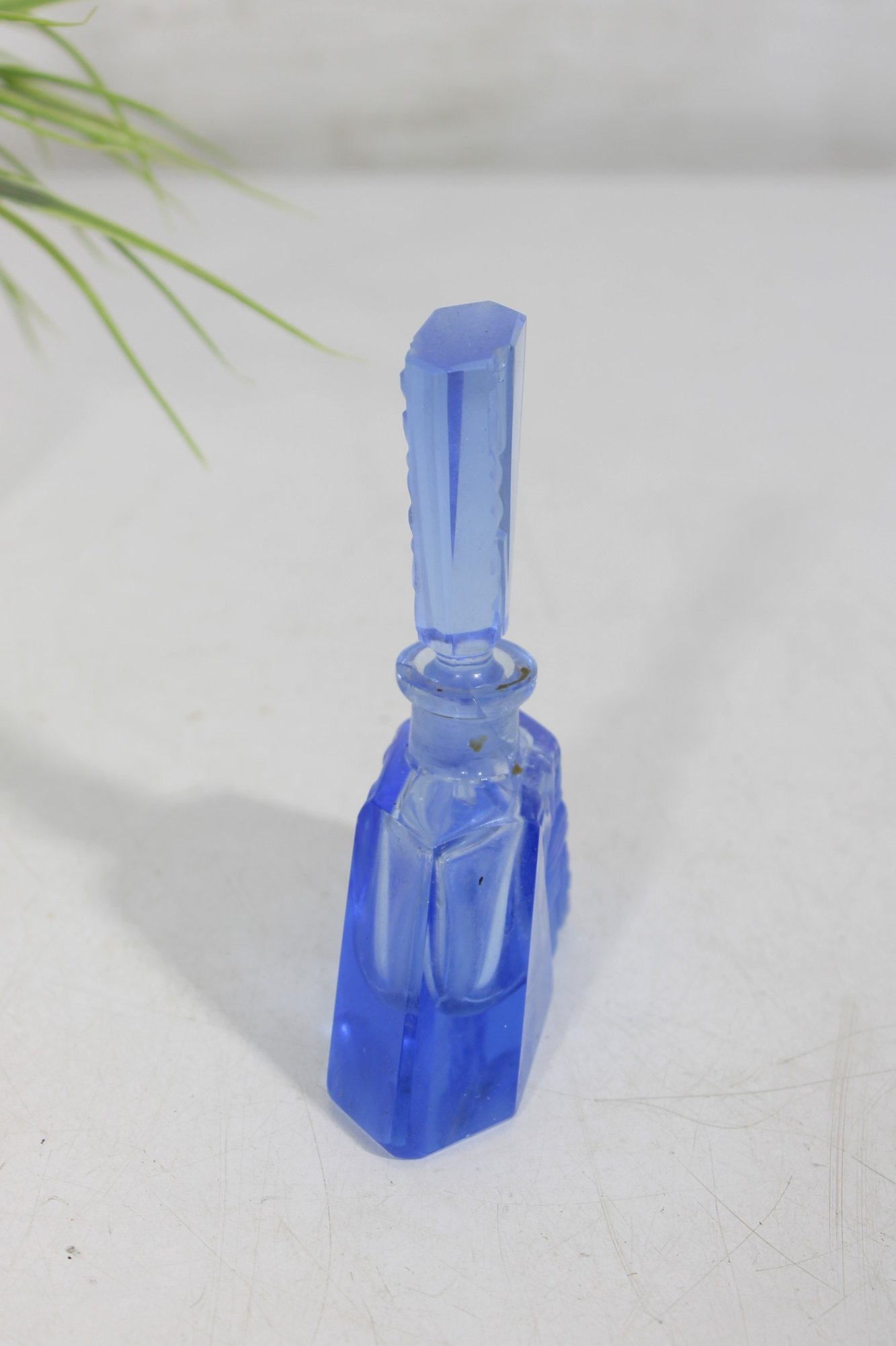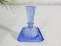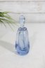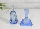Attractive pair of vintage blue art glass perfume bottles, each featuring unique shapes and elegant stopper designs. One bottle has a rounded, softly faceted form with a long teardrop stopper, while the other features a more angular, geometric base with a matching faceted stopper.