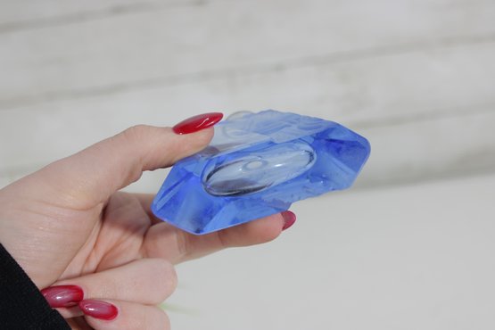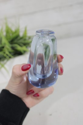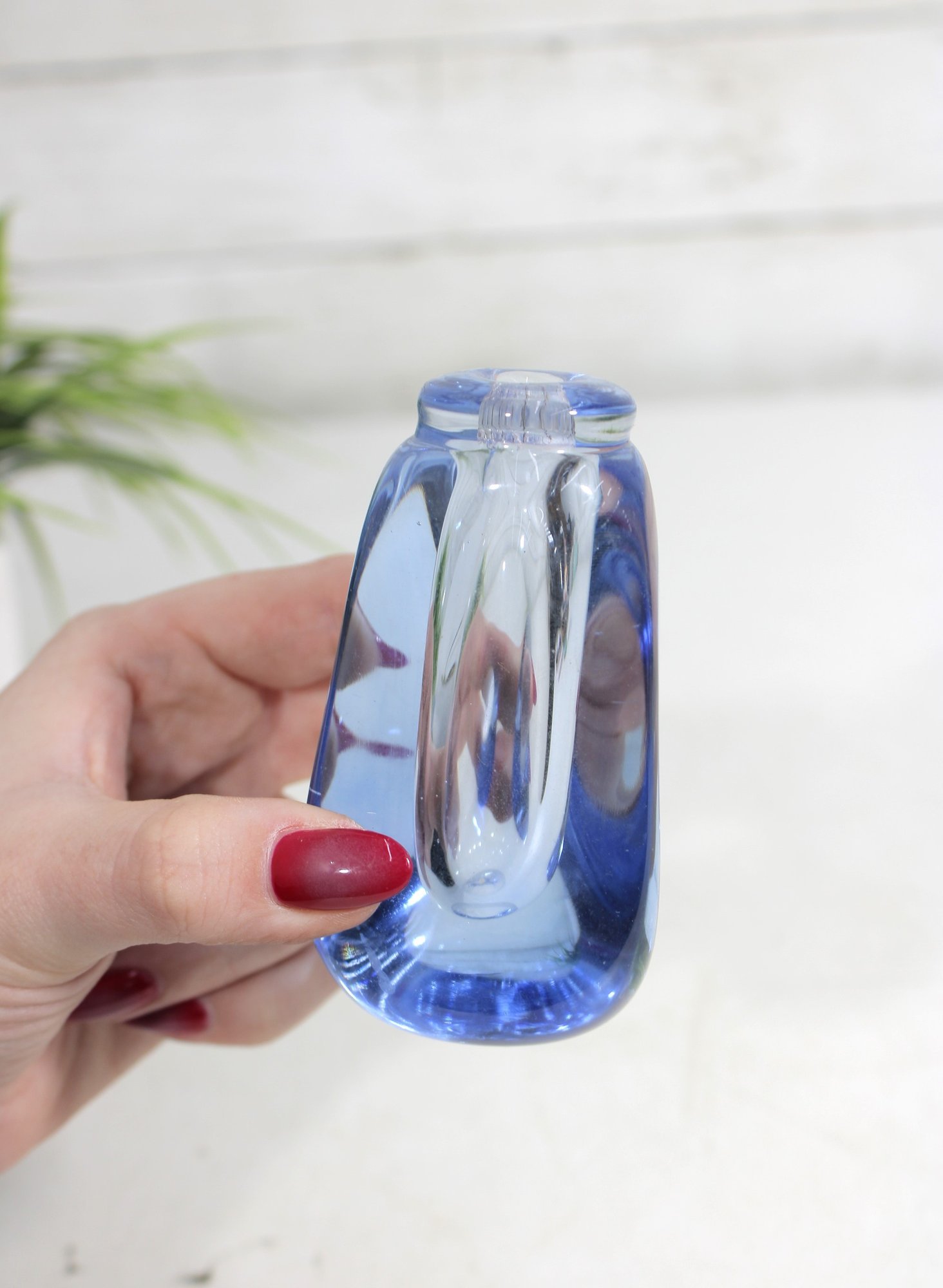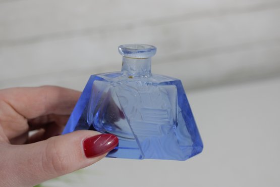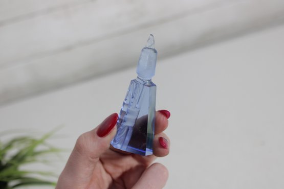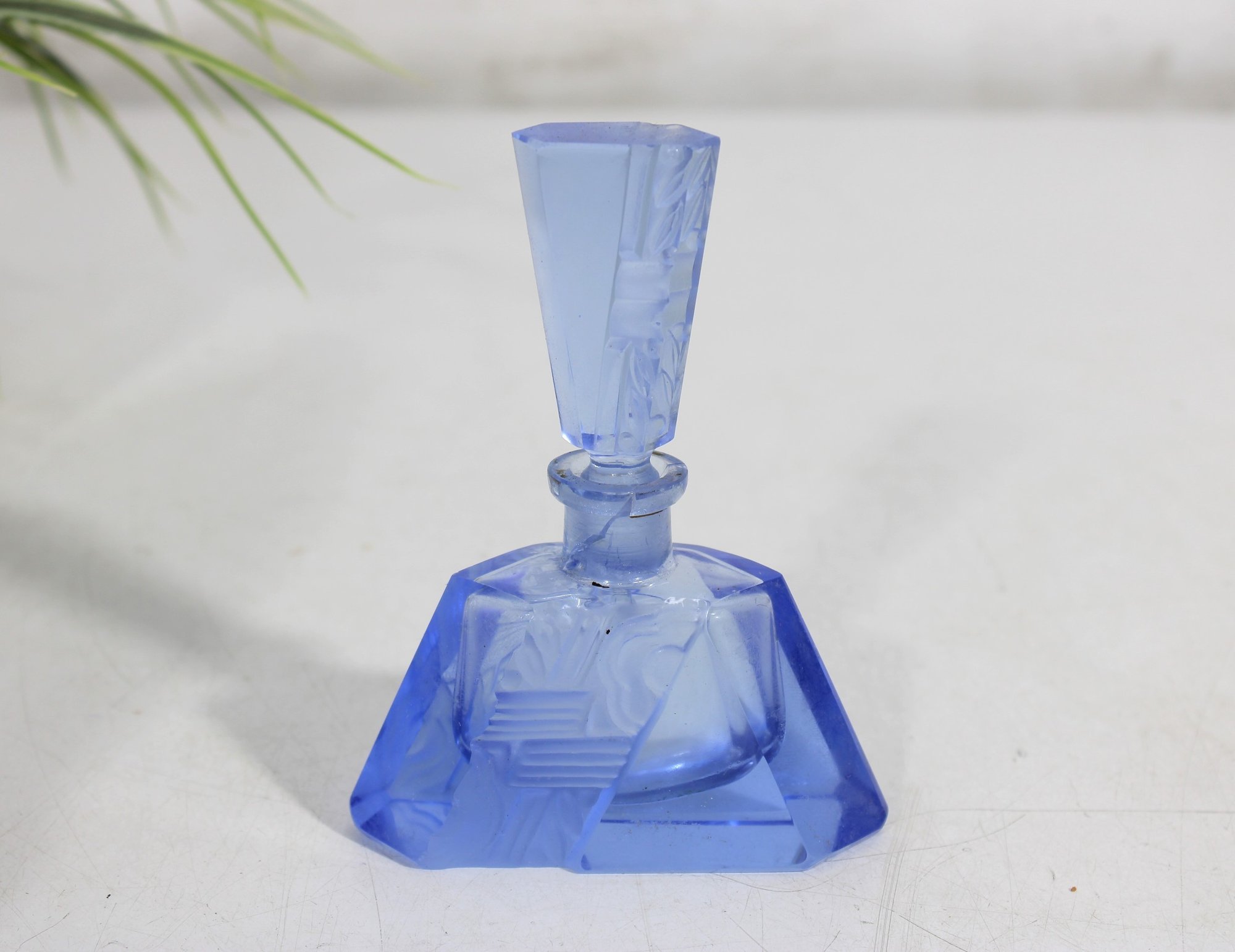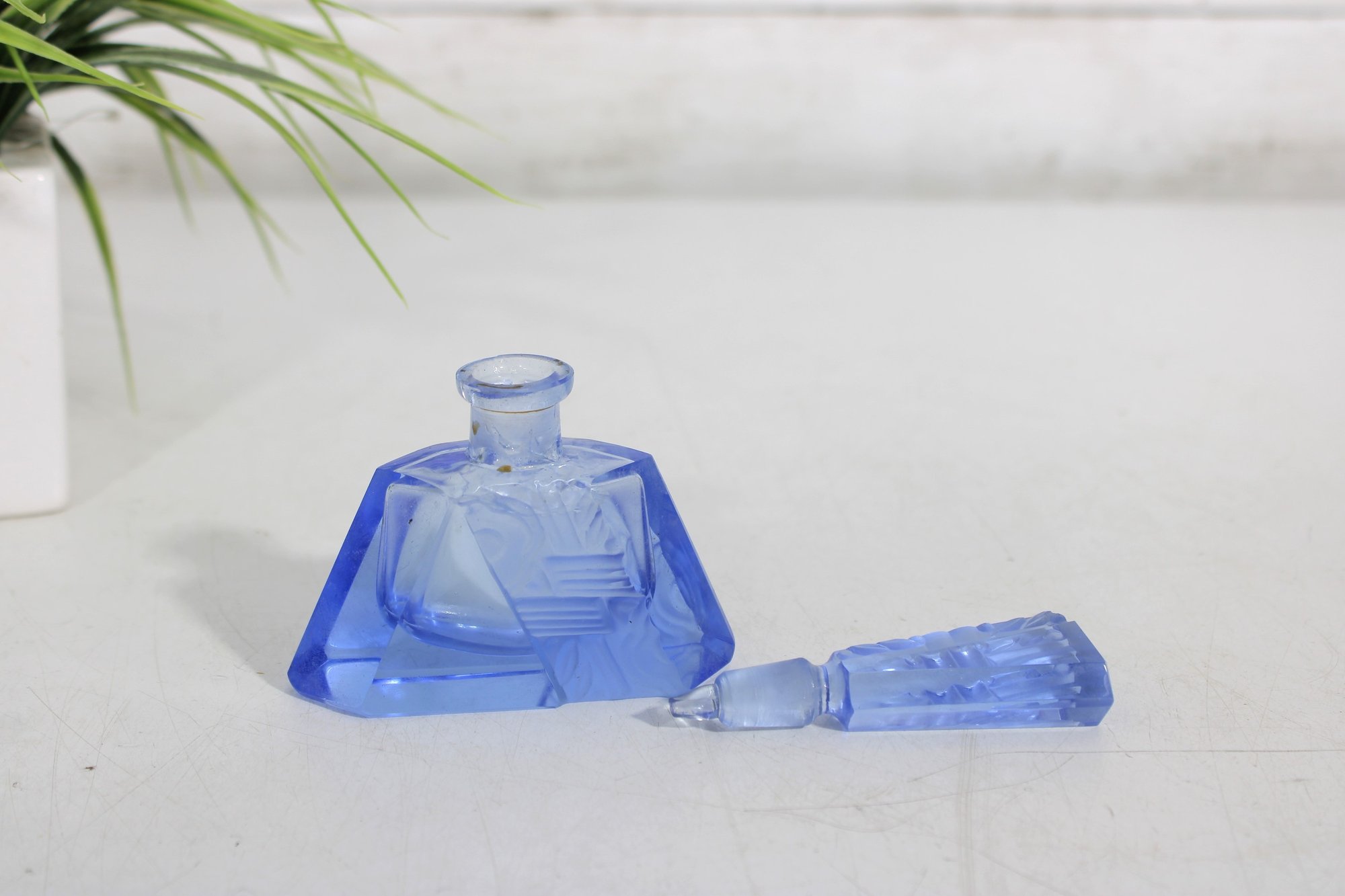 Attractive pair of vintage blue art glass perfume bottles, each featuring unique shapes and elegant stopper designs. One bottle has a rounded, softly faceted form with a long teardrop stopper, while the other features a more angular, geometric base with a matching faceted stopper.