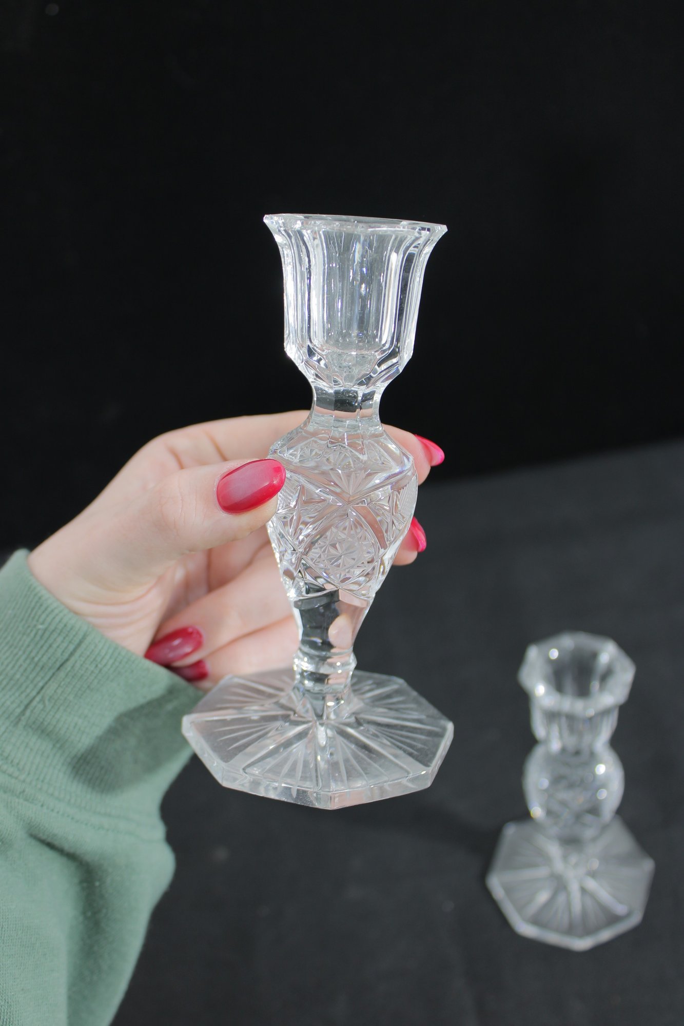 The classic silhouette includes a flared candle cup, decorative baluster stem, and a wide, faceted base for stability. Their timeless design makes them perfect for formal dining settings, special occasions, or as refined decorative accents.