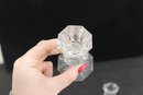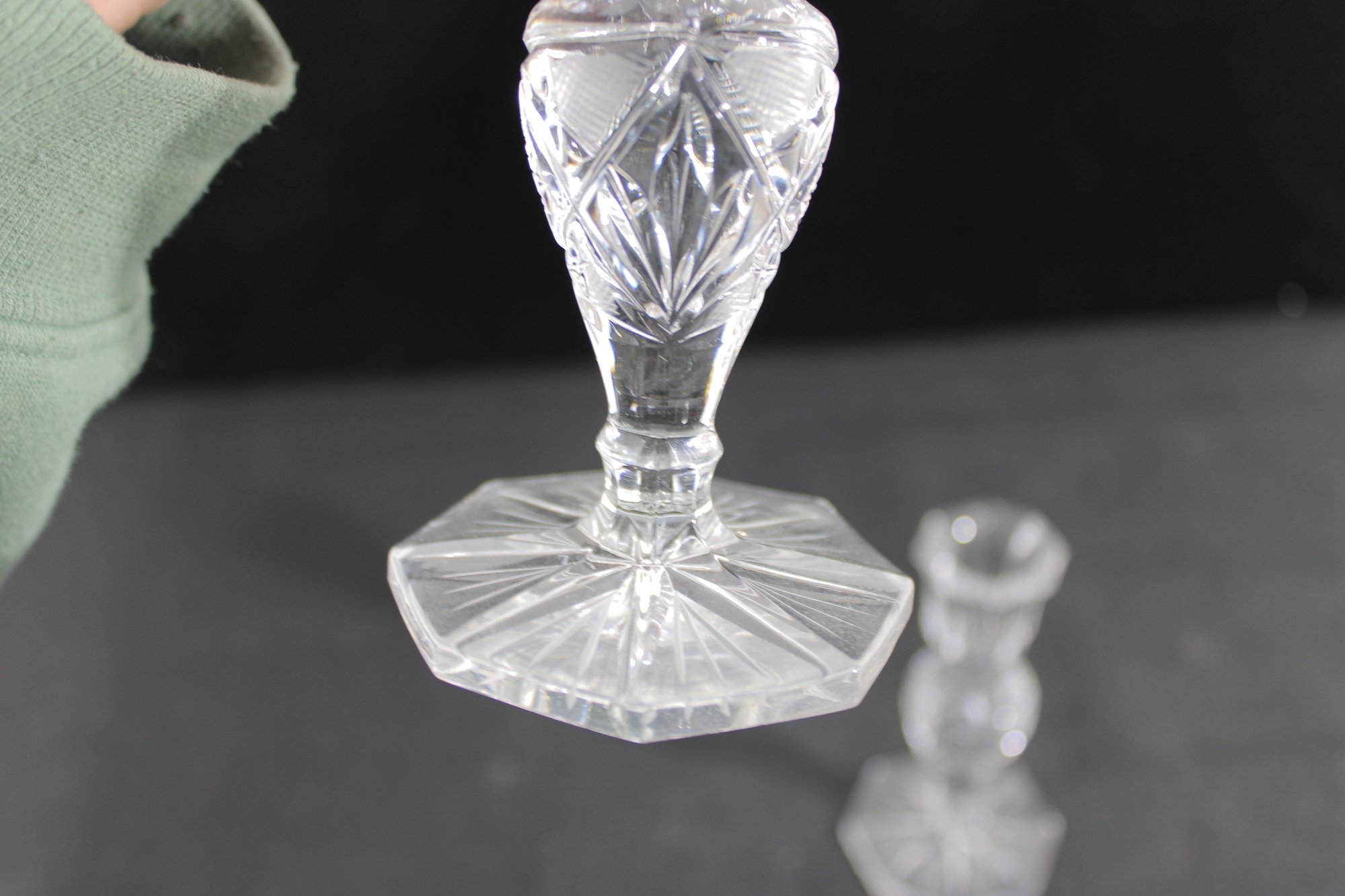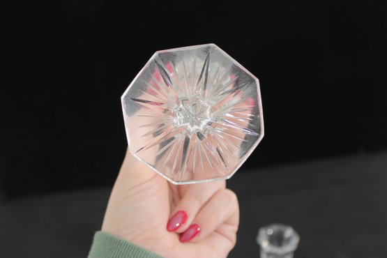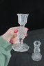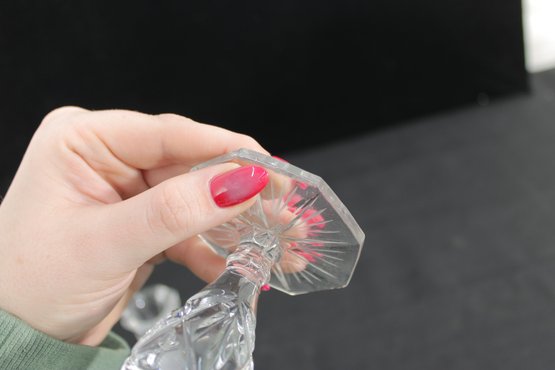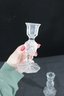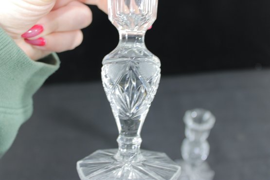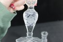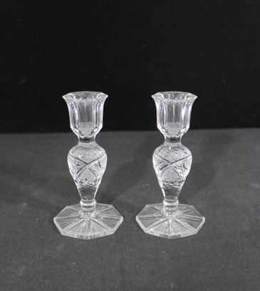 A beautiful pair of vintage clear glass candlesticks featuring an elegant cut crystal-style design. Each piece showcases intricate geometric and starburst patterns along the stem and base, creating a brilliant light-catching effect.
