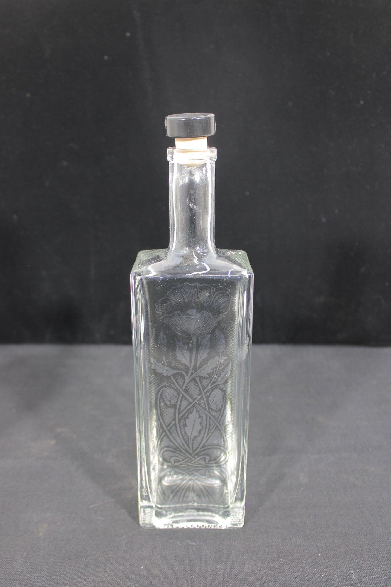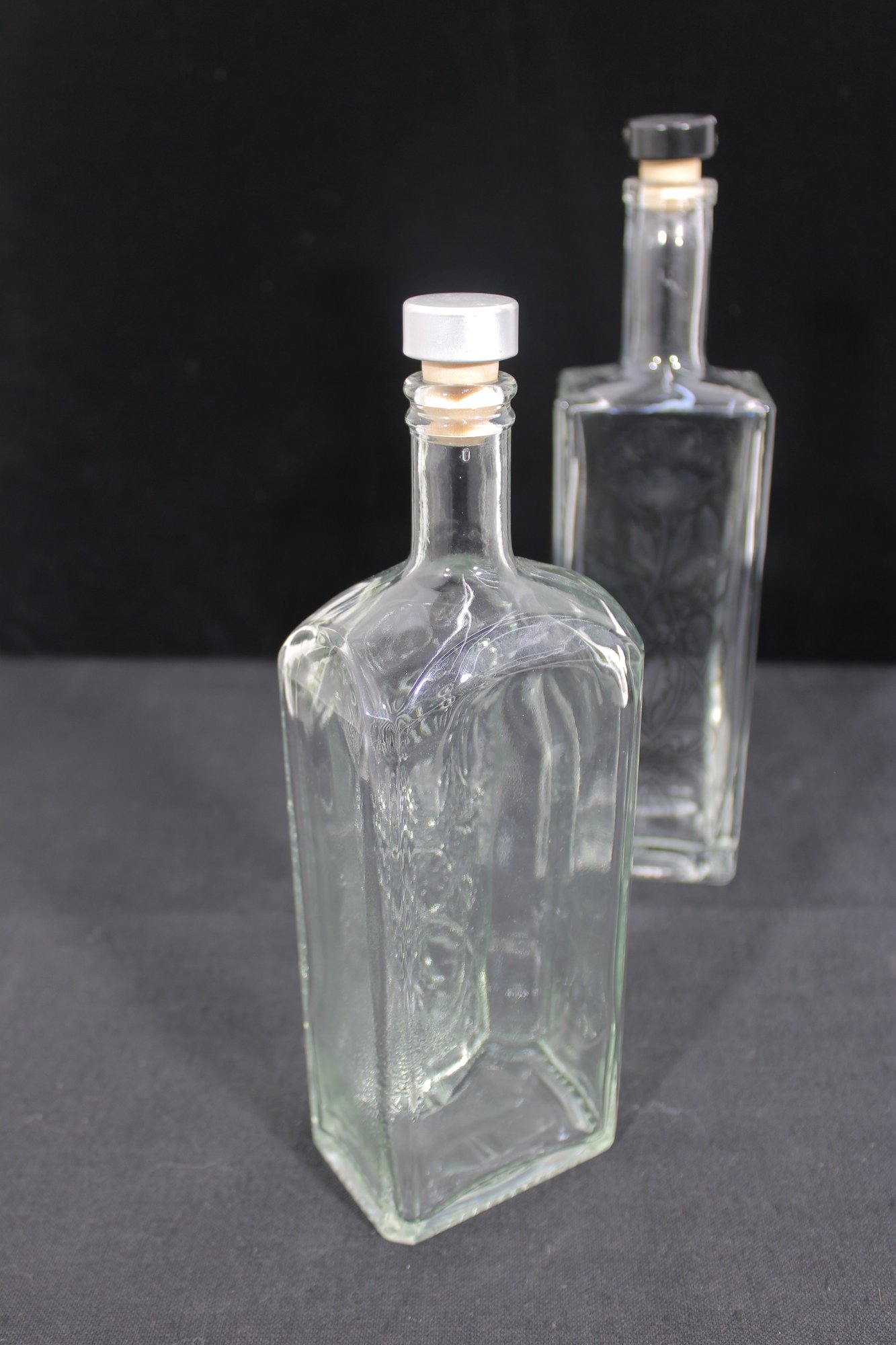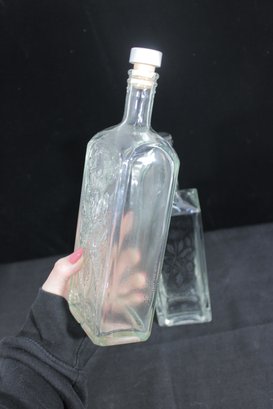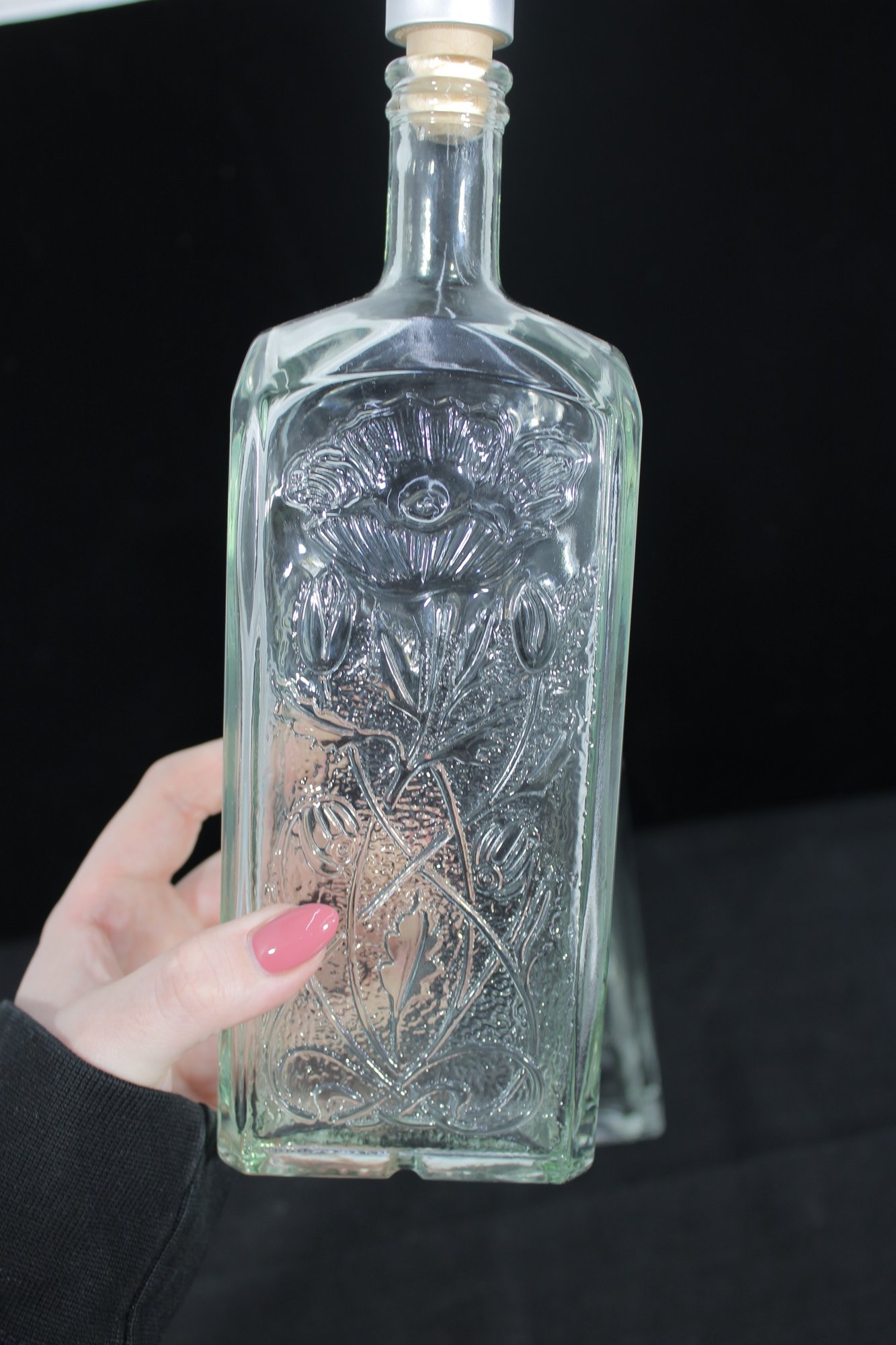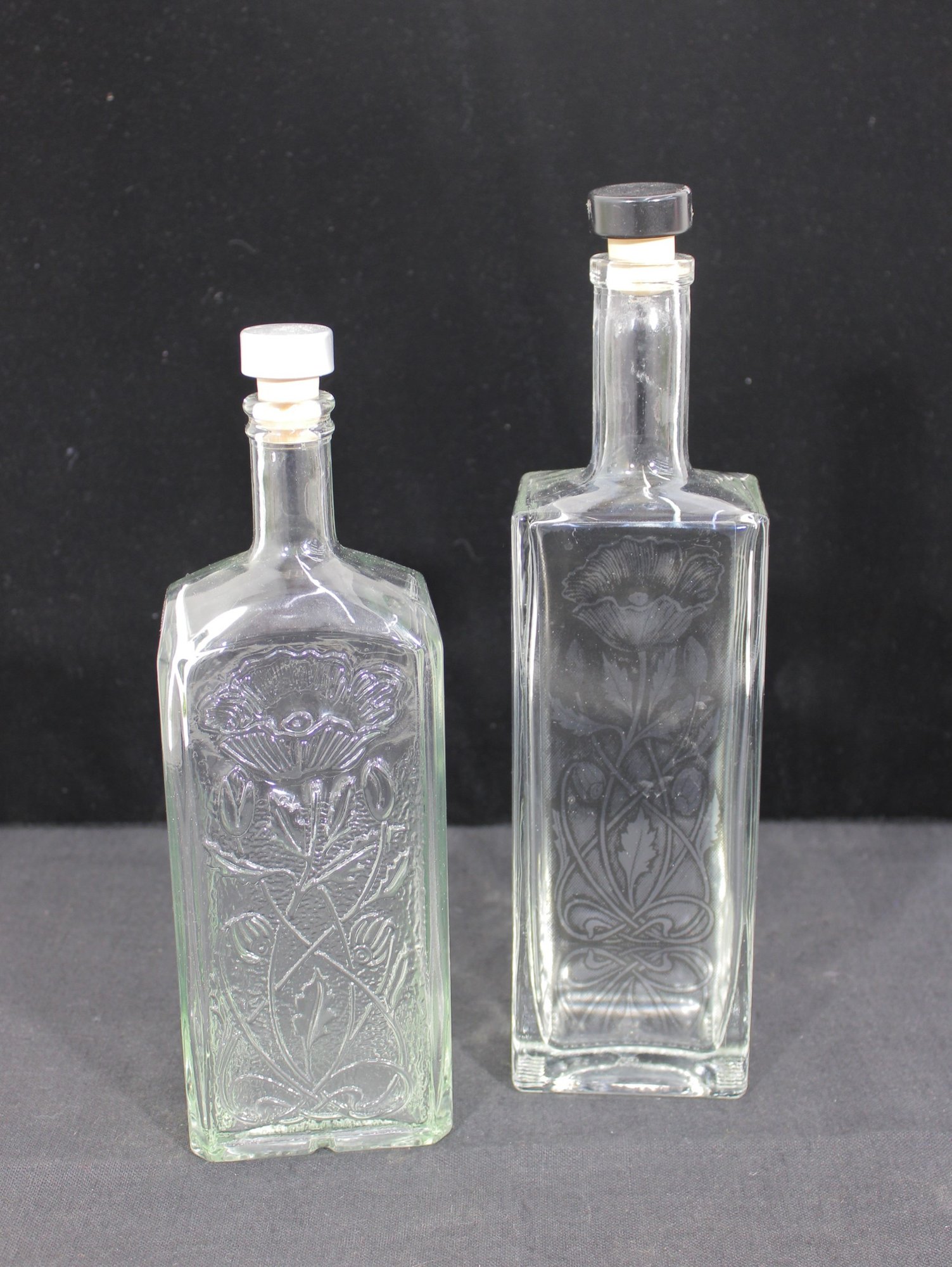 Pair Vintage Glass Liquor Bottles / Decanters Embossed Floral 10.5" & 12"