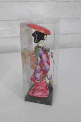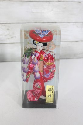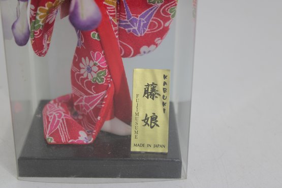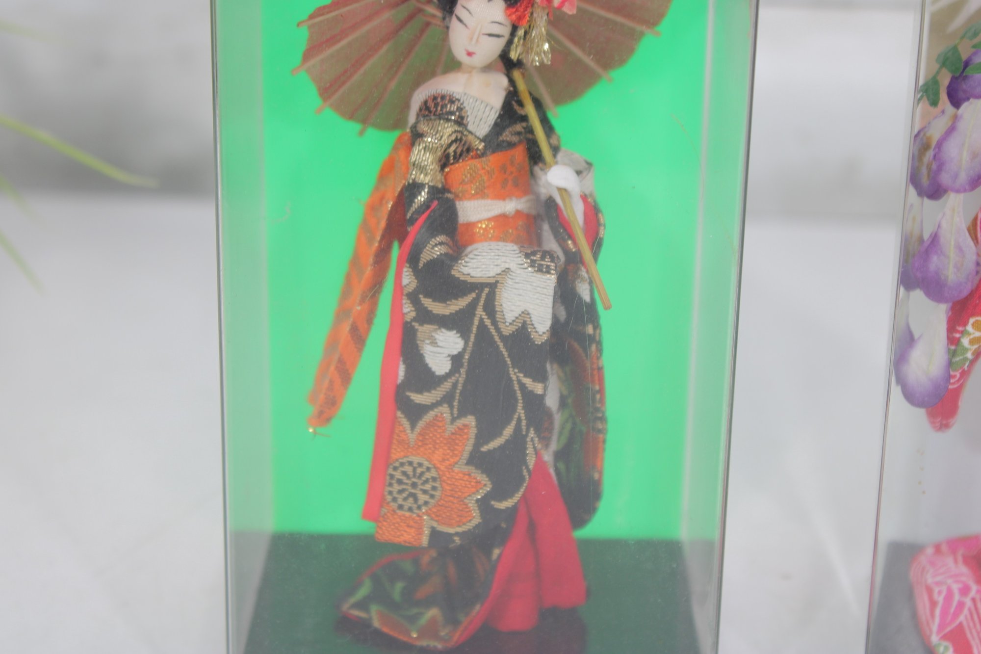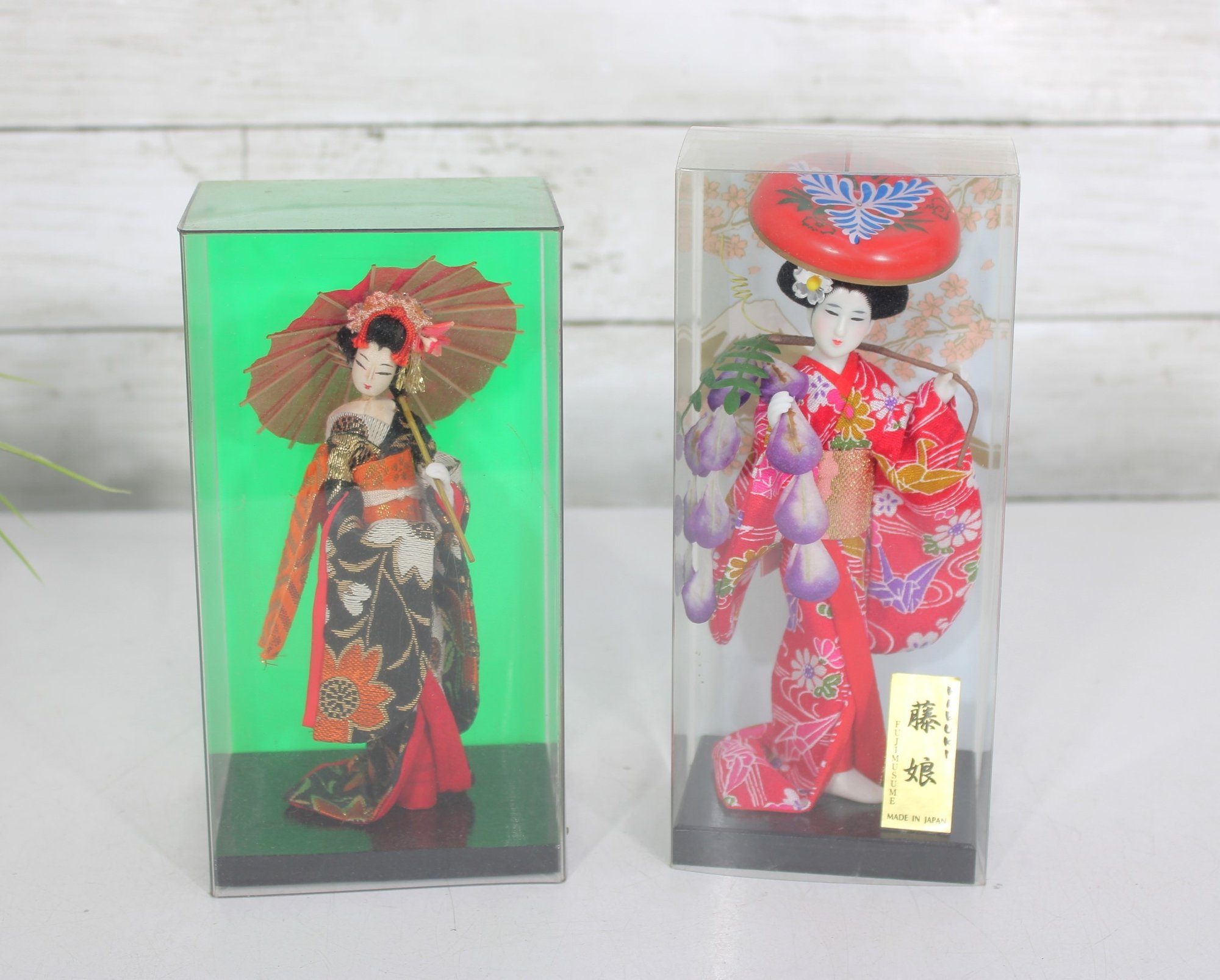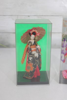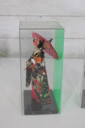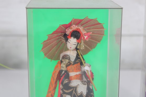 Beautiful pair of vintage Japanese Geisha dolls, each housed in its original clear display case. These elegant figures are finely detailed and showcase traditional kimono styling with vibrant colors and delicate accessories.