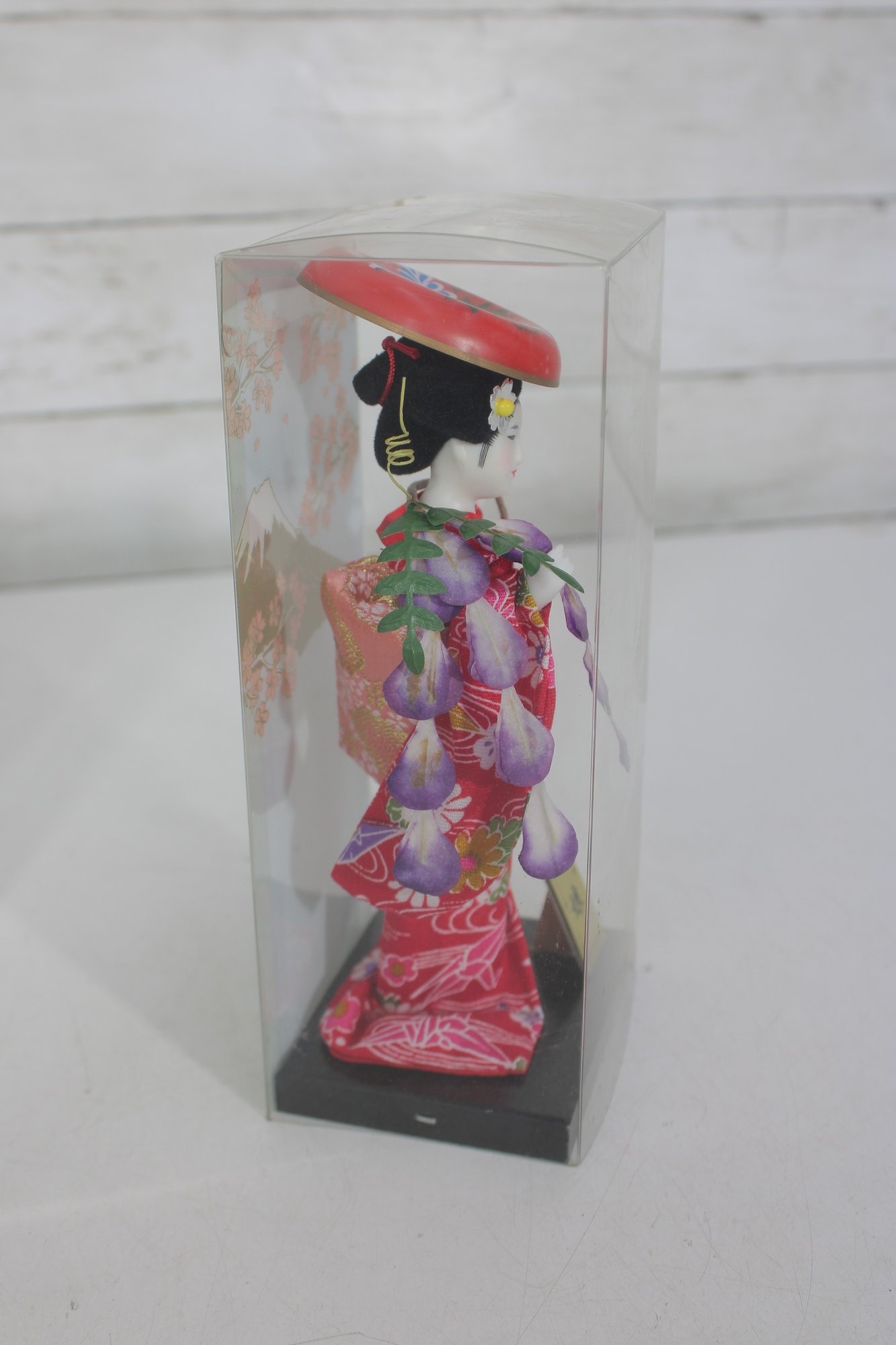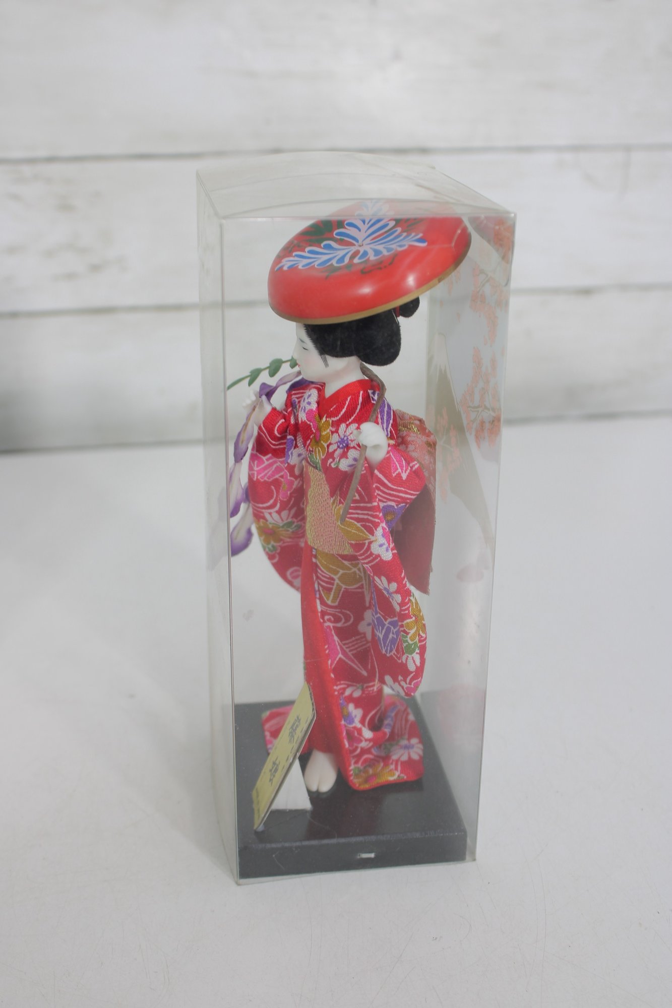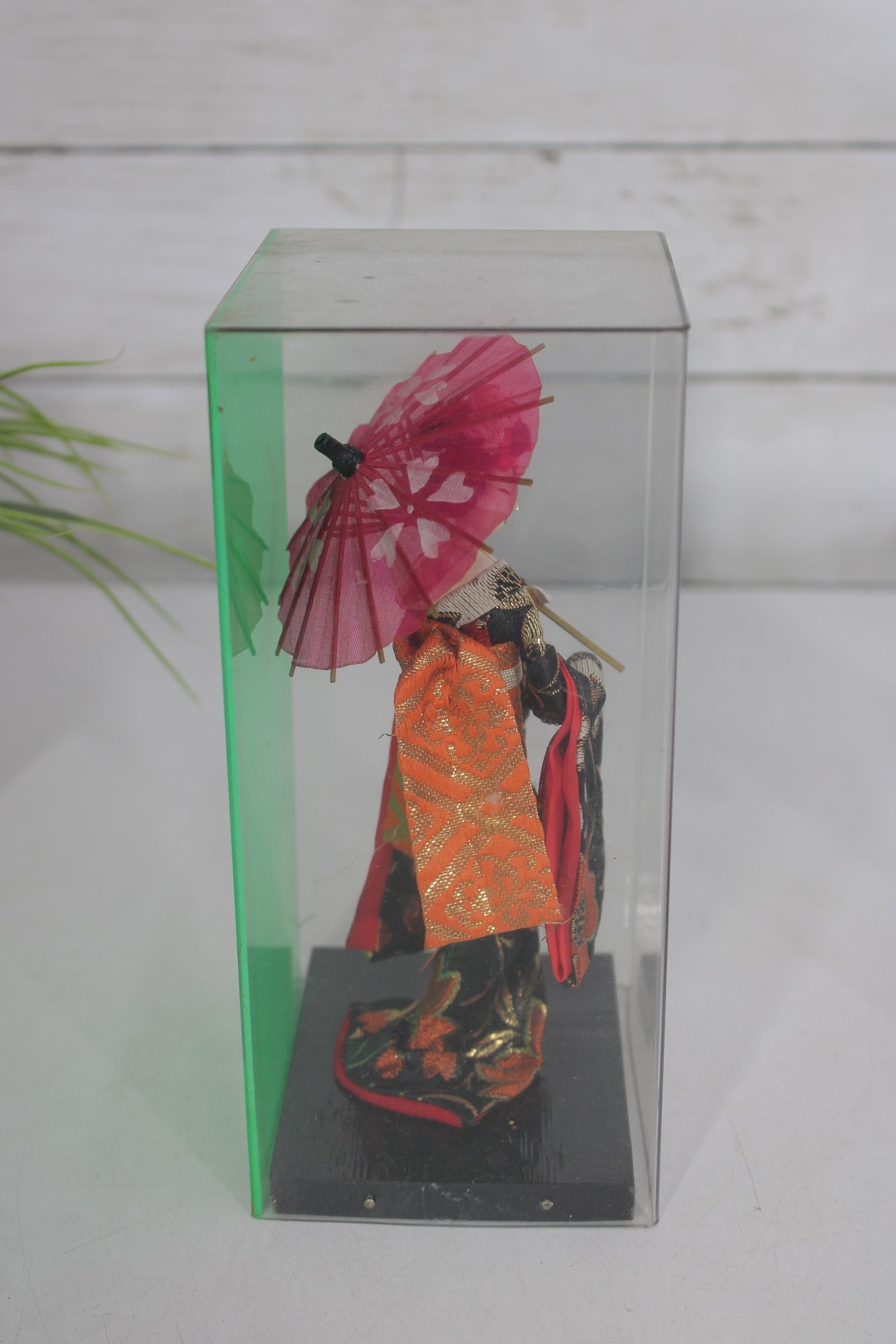Beautiful pair of vintage Japanese Geisha dolls, each housed in its original clear display case. These elegant figures are finely detailed and showcase traditional kimono styling with vibrant colors and delicate accessories.