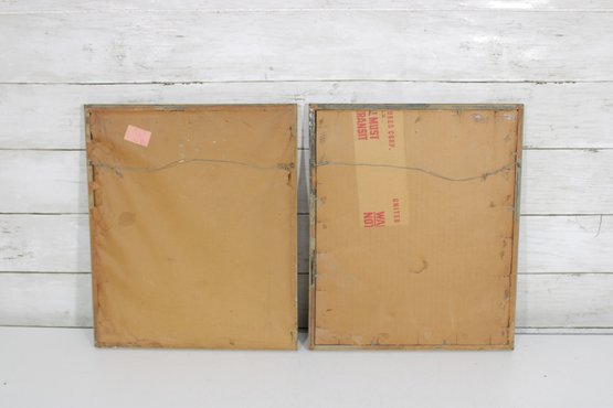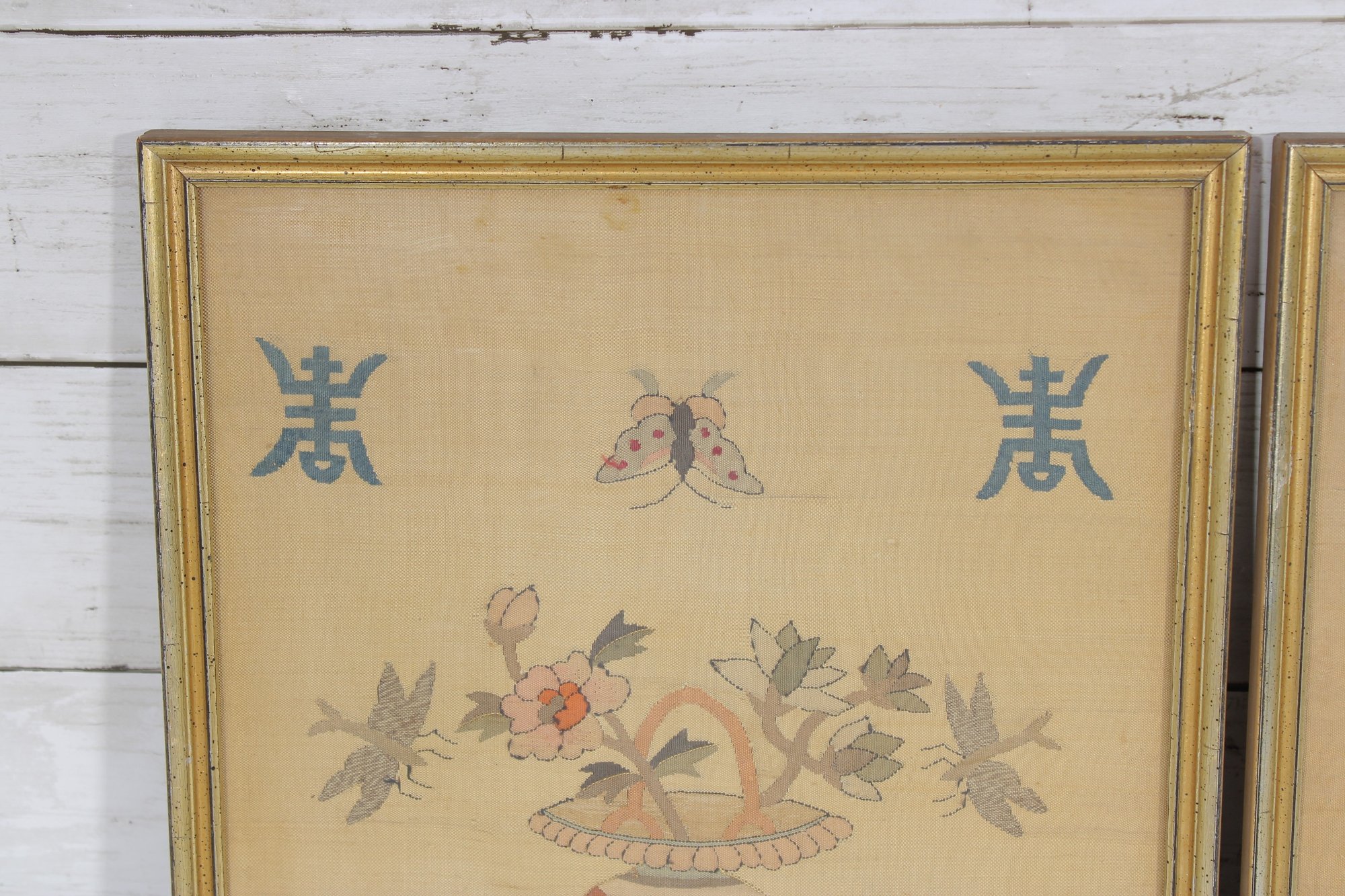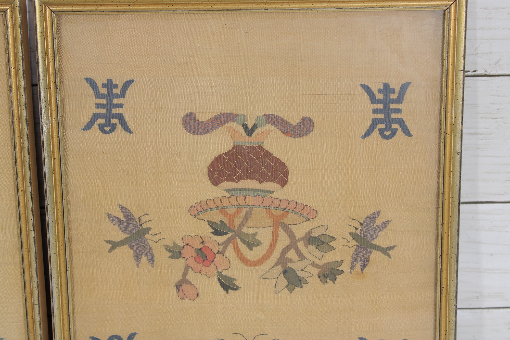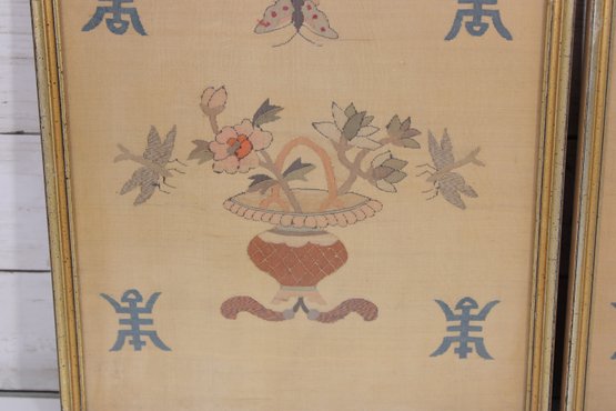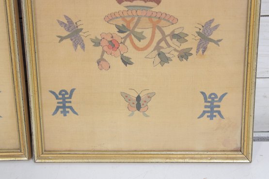 The needlework is finely stitched and mounted within matching gold-tone frames, making this a cohesive set ready for display.