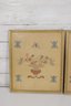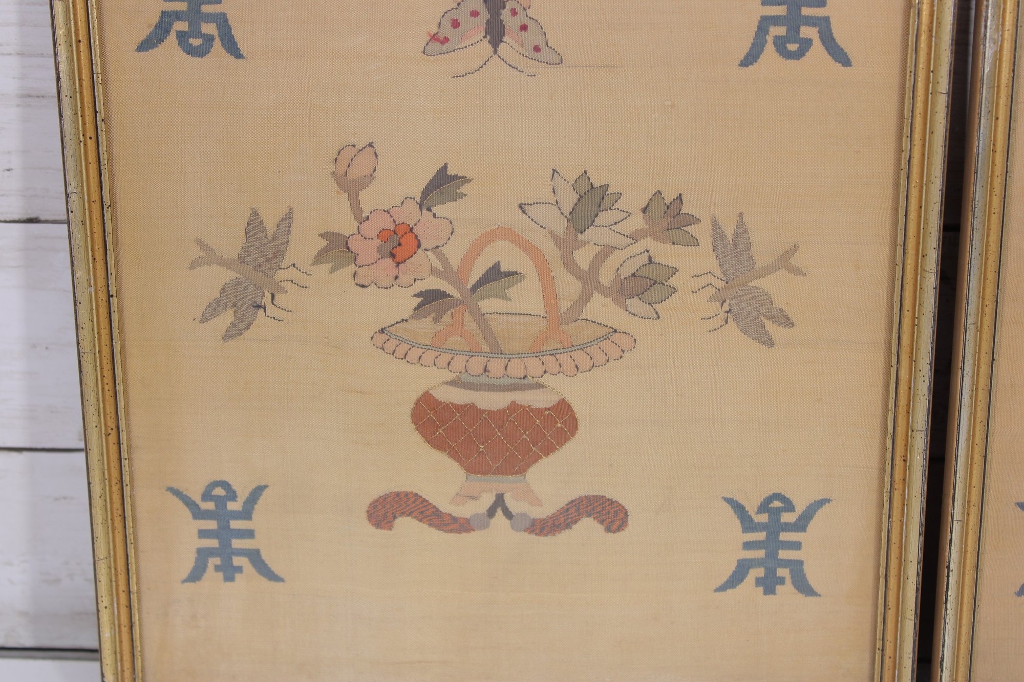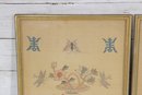 a lovely pair of vintage needlepoint wall art panels, featuring delicate floral basket designs accented with butterflies and decorative motifs.