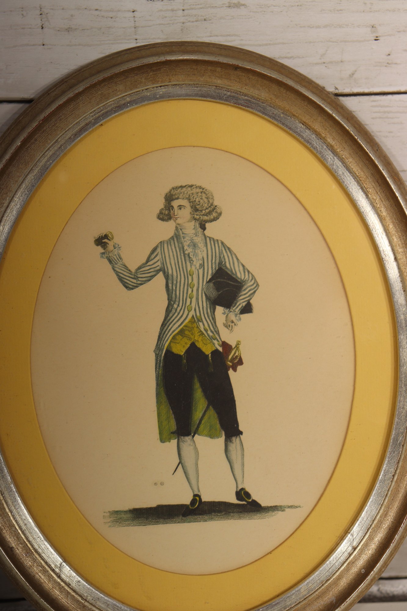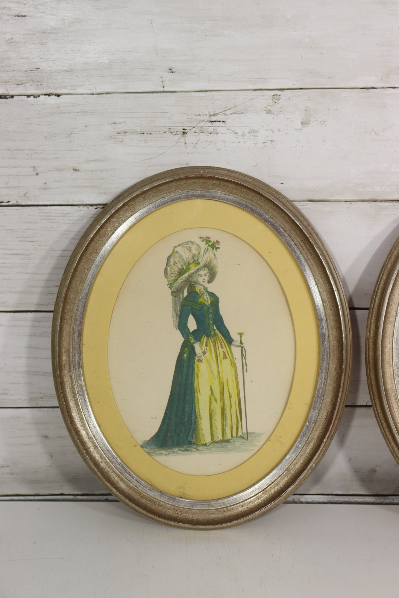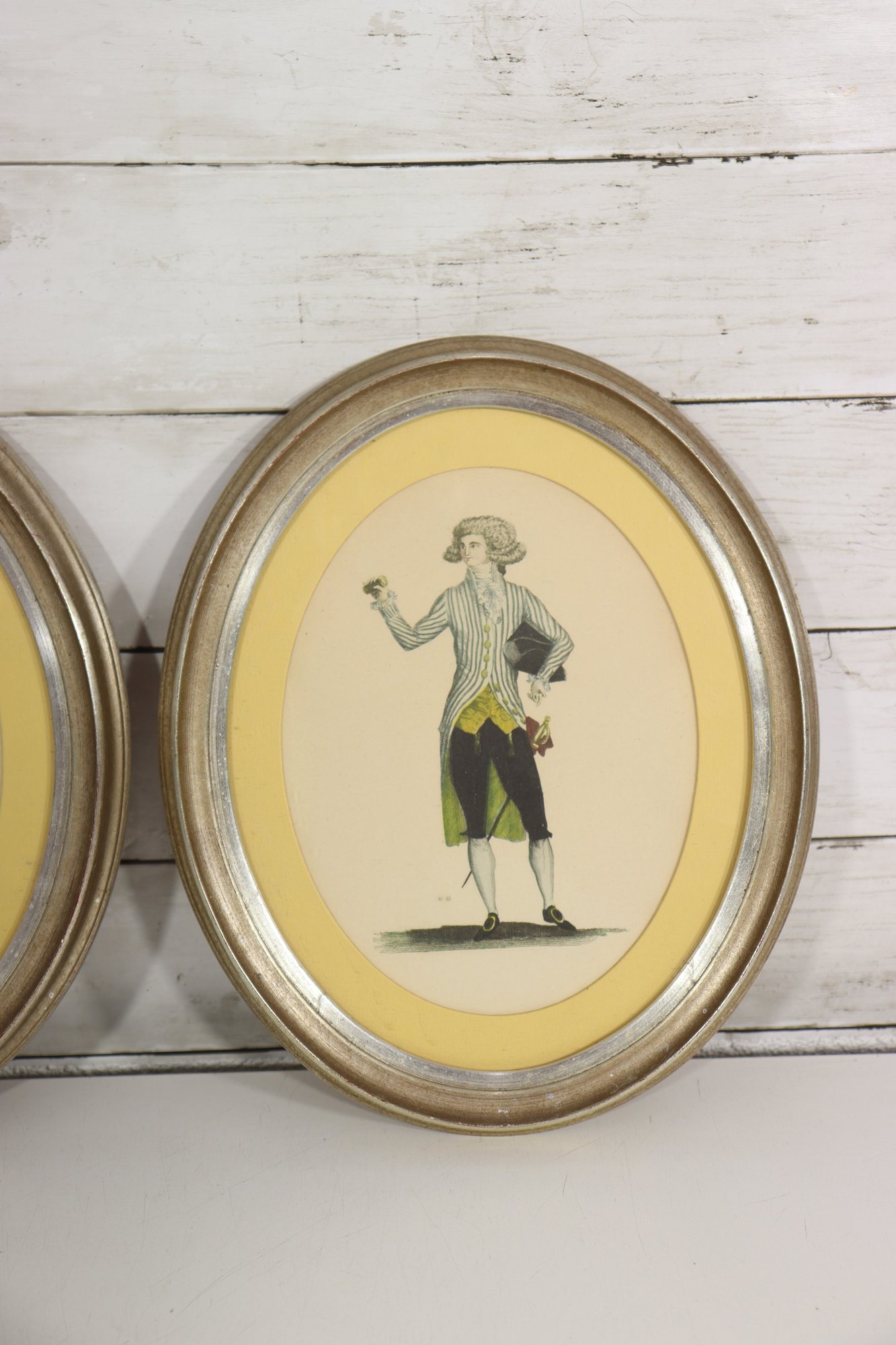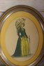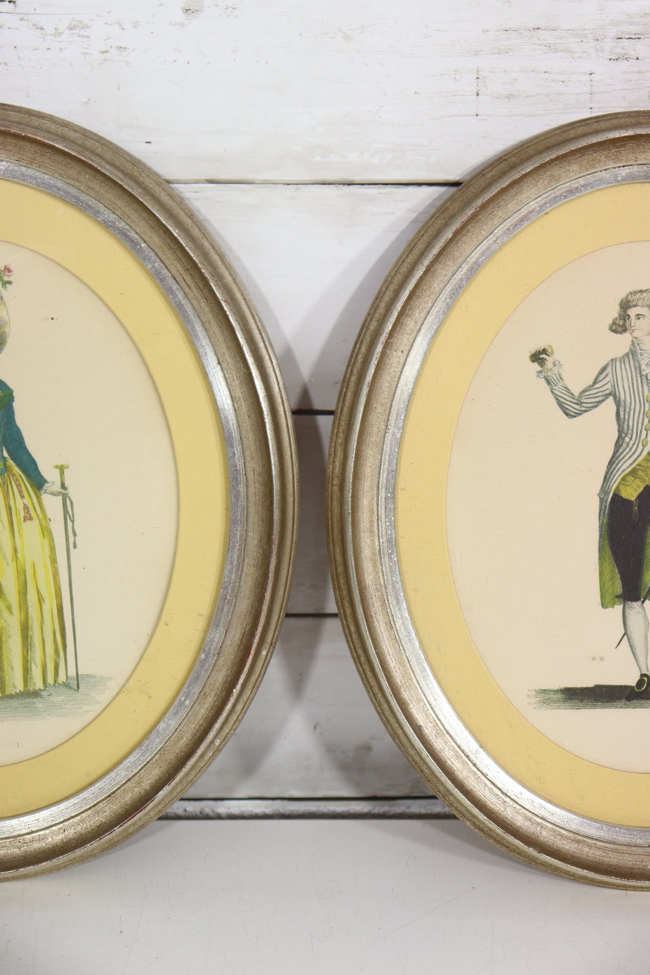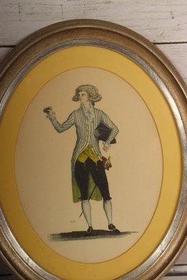 Charming pair of vintage oval framed prints depicting a finely dressed gentleman and lady in Georgian / Regency–era attire. The illustrations showcase elegant period fashion and are beautifully presented with yellow mats and classic gold-tone oval frames.