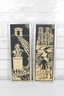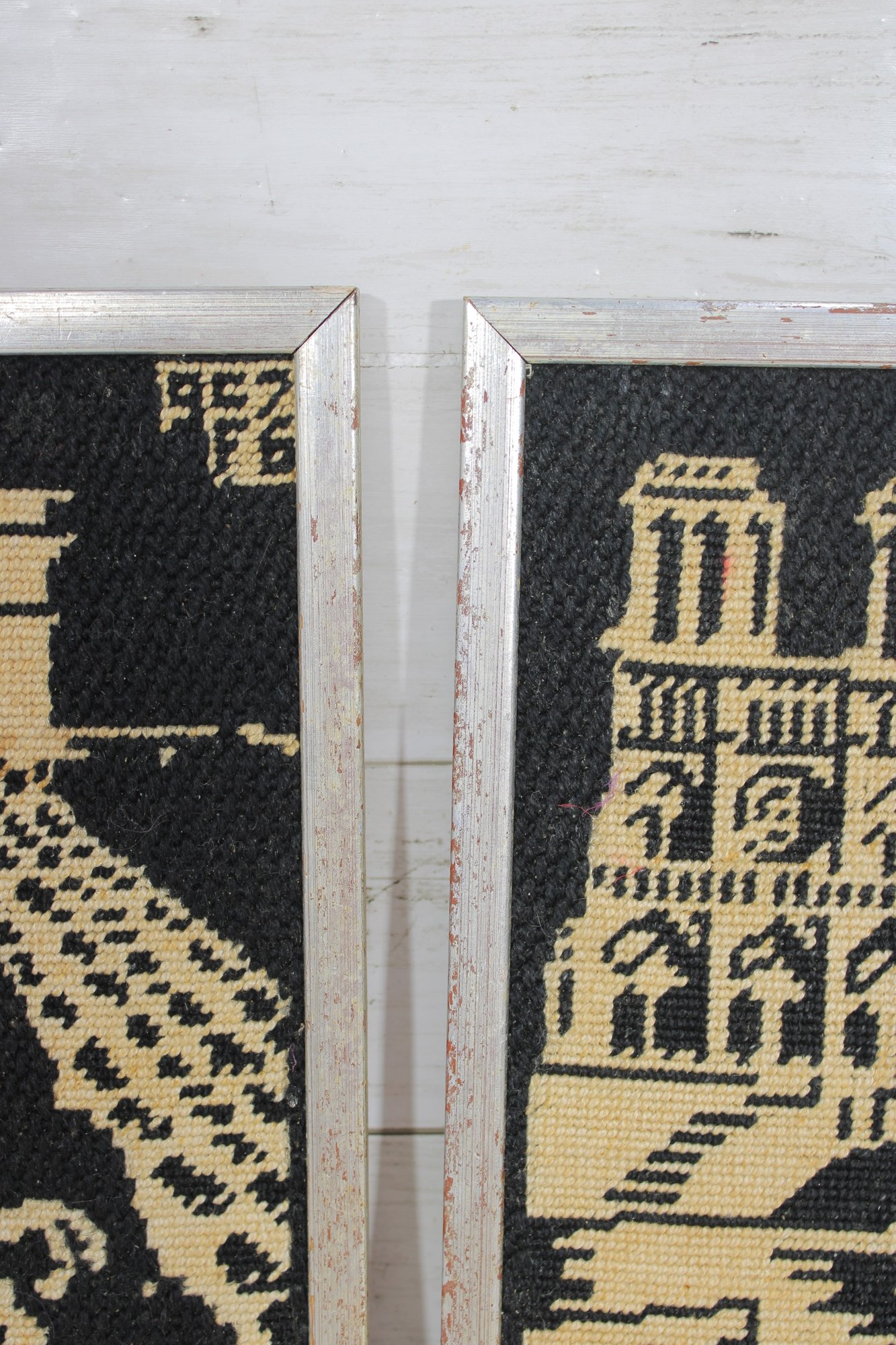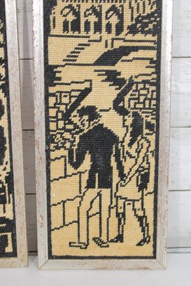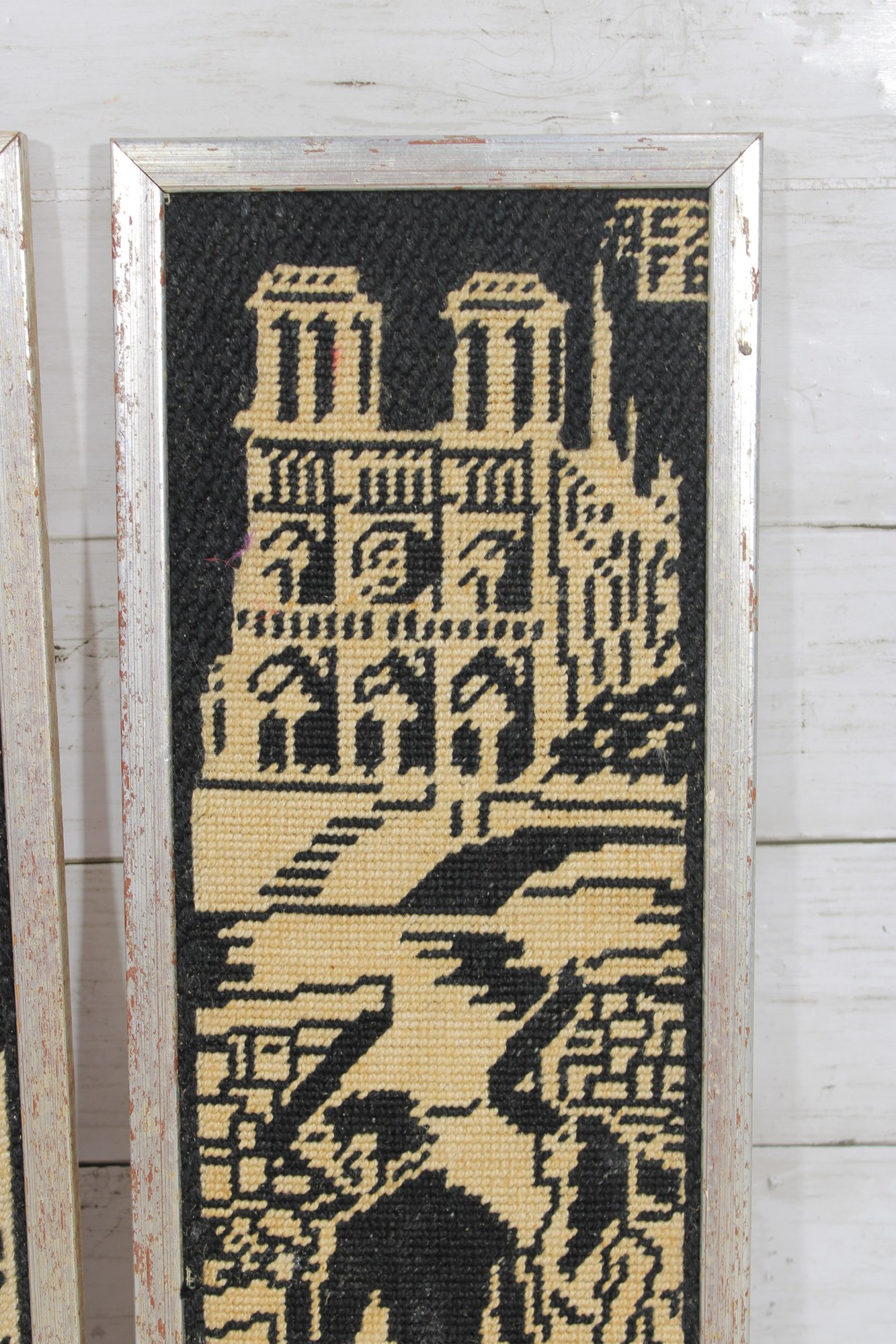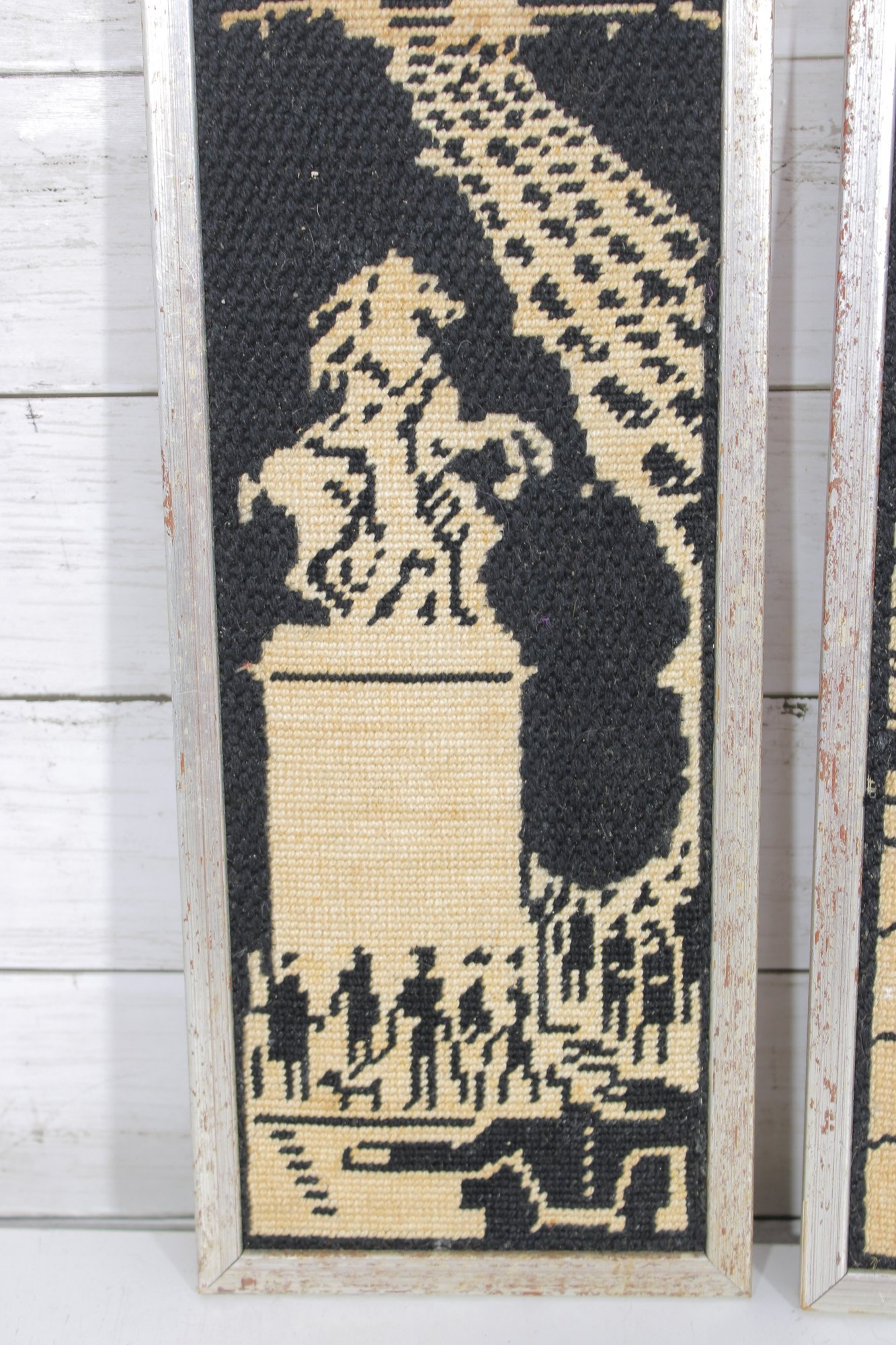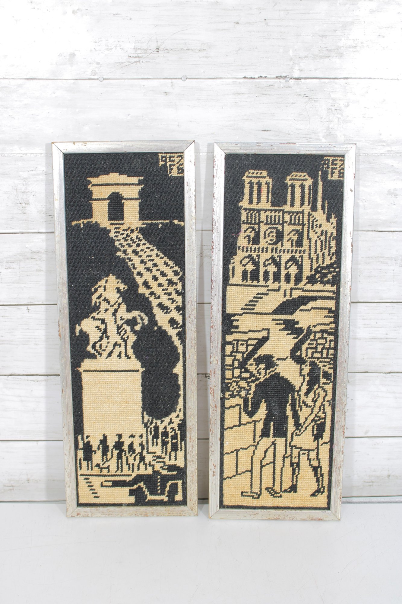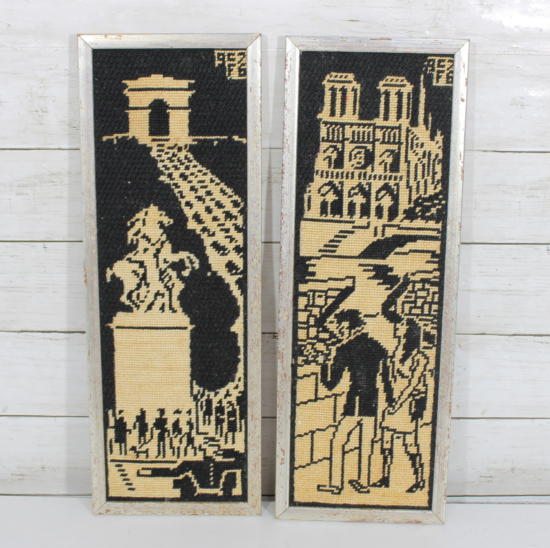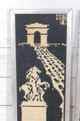 a pair of vintage needlepoint wall panels depicting iconic Paris landmarks in a striking black and cream color palette.