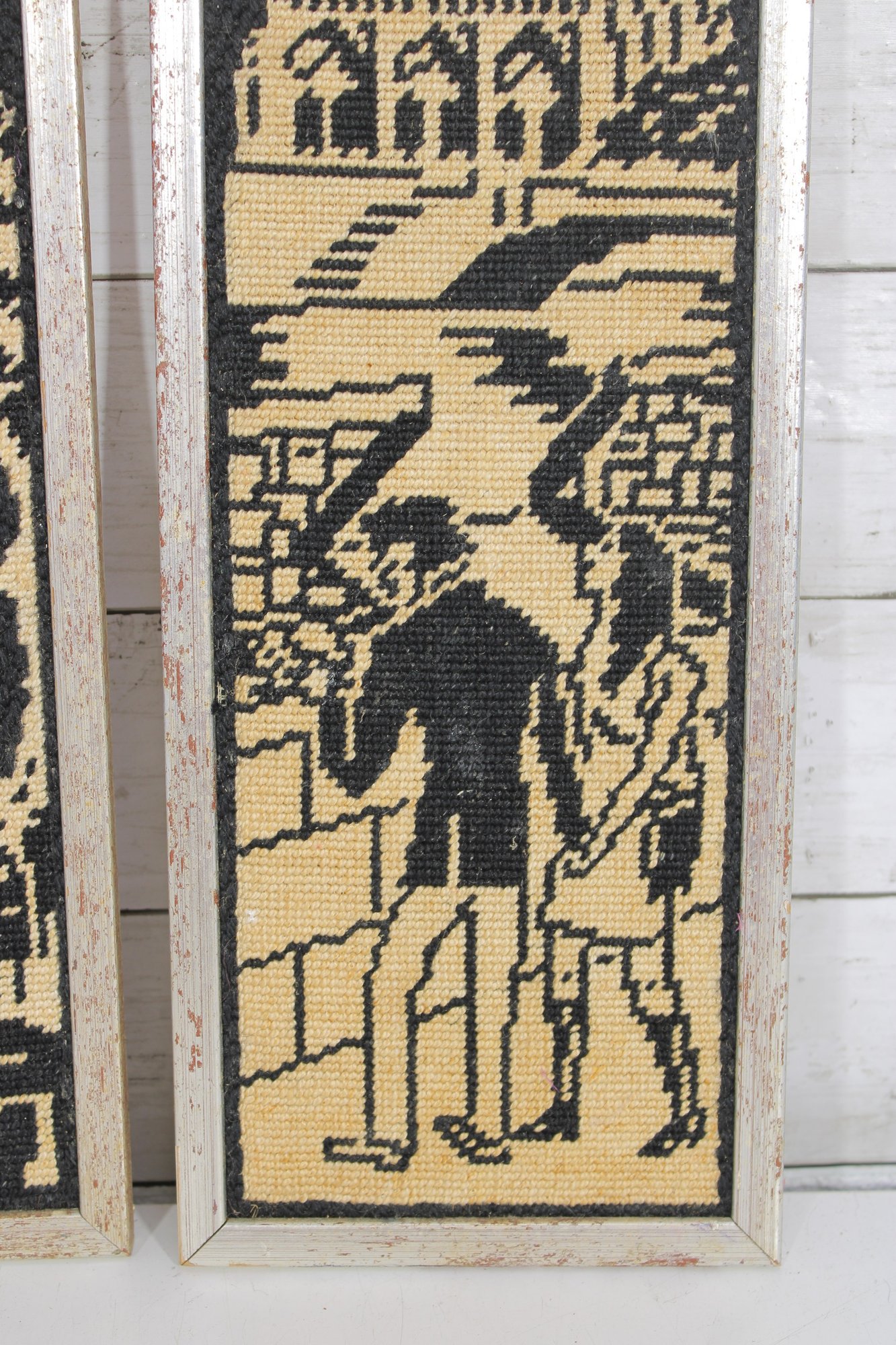The needlework is mounted and housed in slim frames, making them ideal for vertical display as a set or individually.