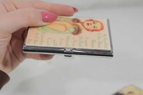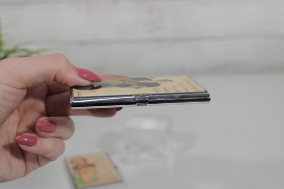 These compact cases open to hold business cards, calling cards, credit cards, or small papers, making them both functional and collectible. Their playful retro graphics make them great conversation pieces for a desk, purse, or vintage accessory collection.
