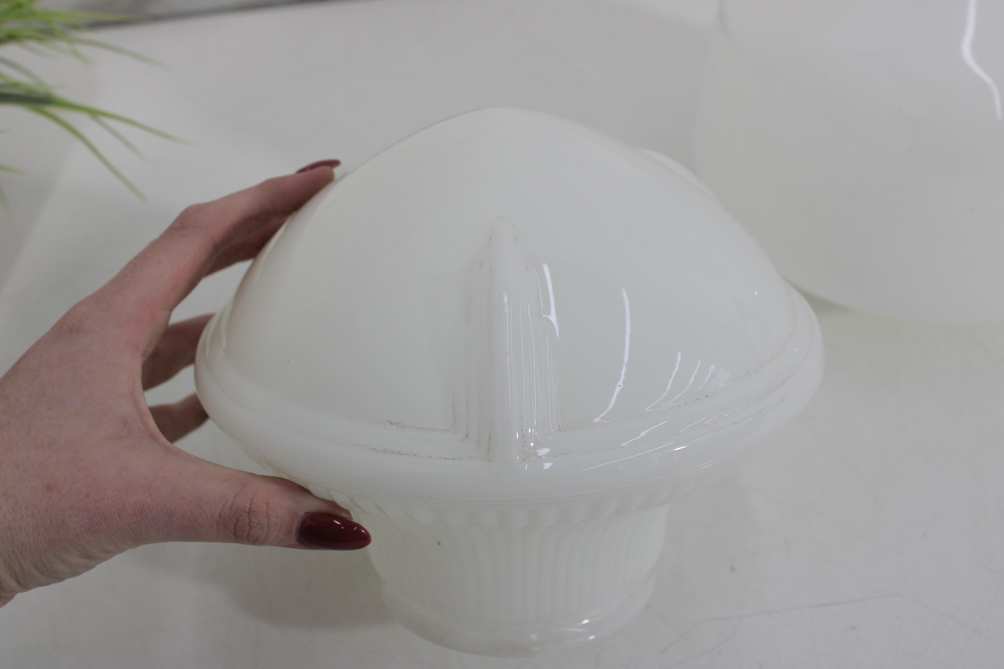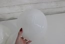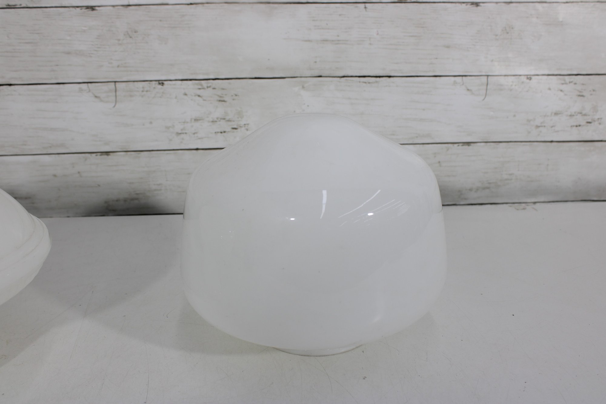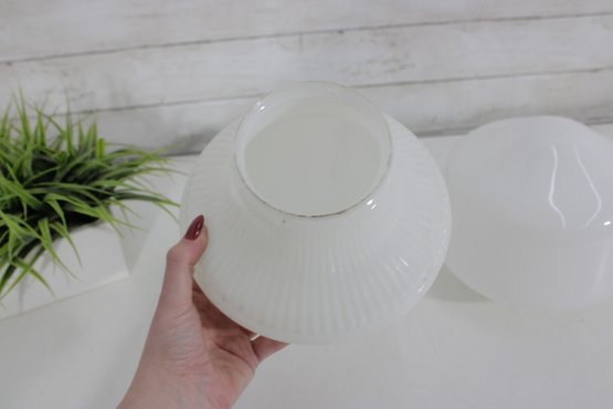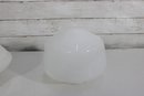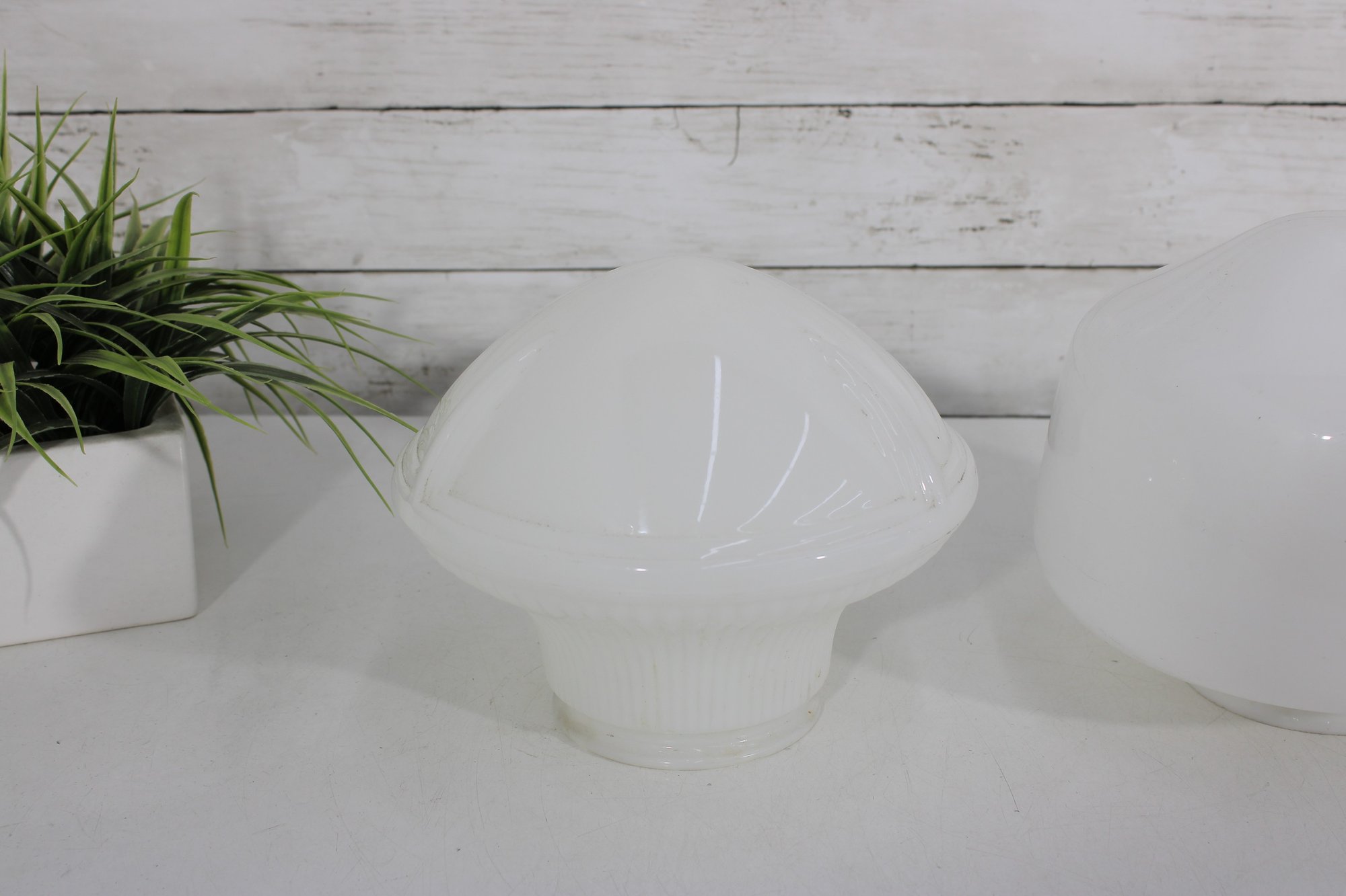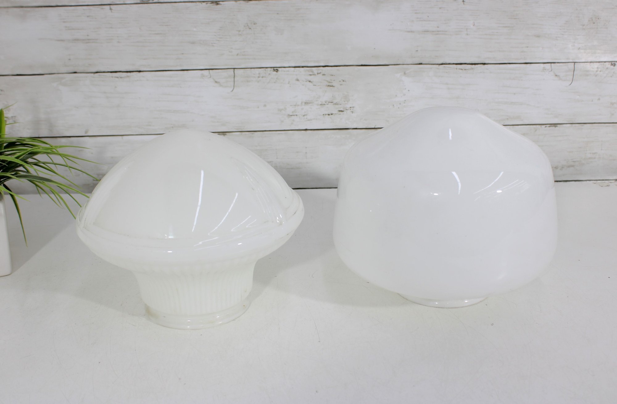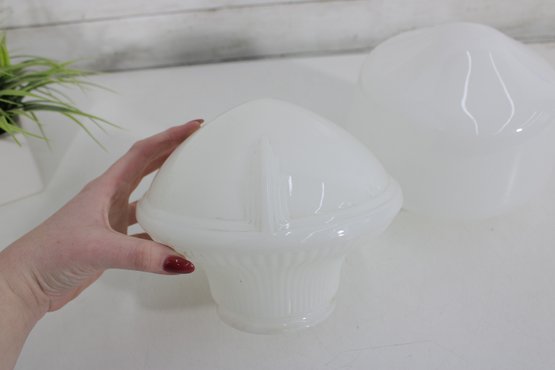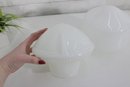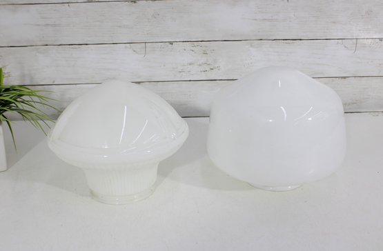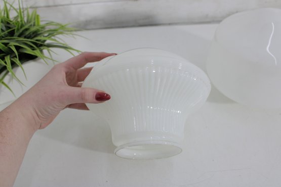 pair of vintage white milk glass lamp shades featuring two complementary designs. One shade showcases a ribbed, fluted base with a softly domed top, while the other features a smooth, rounded dome form for a clean, classic look.