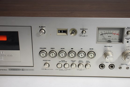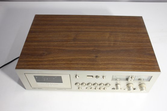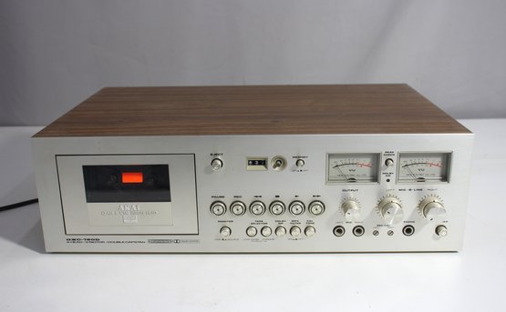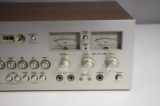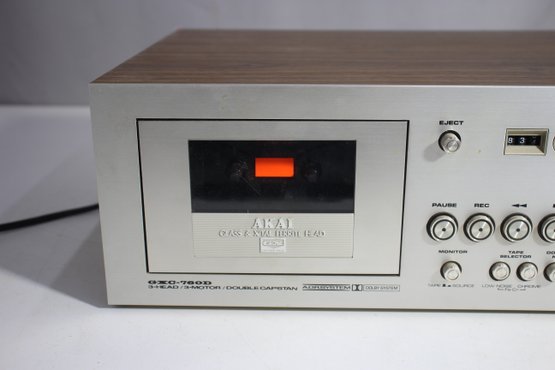 vintage Akai GXC-750D Stereo Cassette Deck, a high-quality audio recorder known for its iconic VU meters and premium build. This unit features a classic silver faceplate with a wood grain casing, dual analog VU meters, and multiple audio input/output options, making it a favorite among vintage audio collectors and recording enthusiasts.