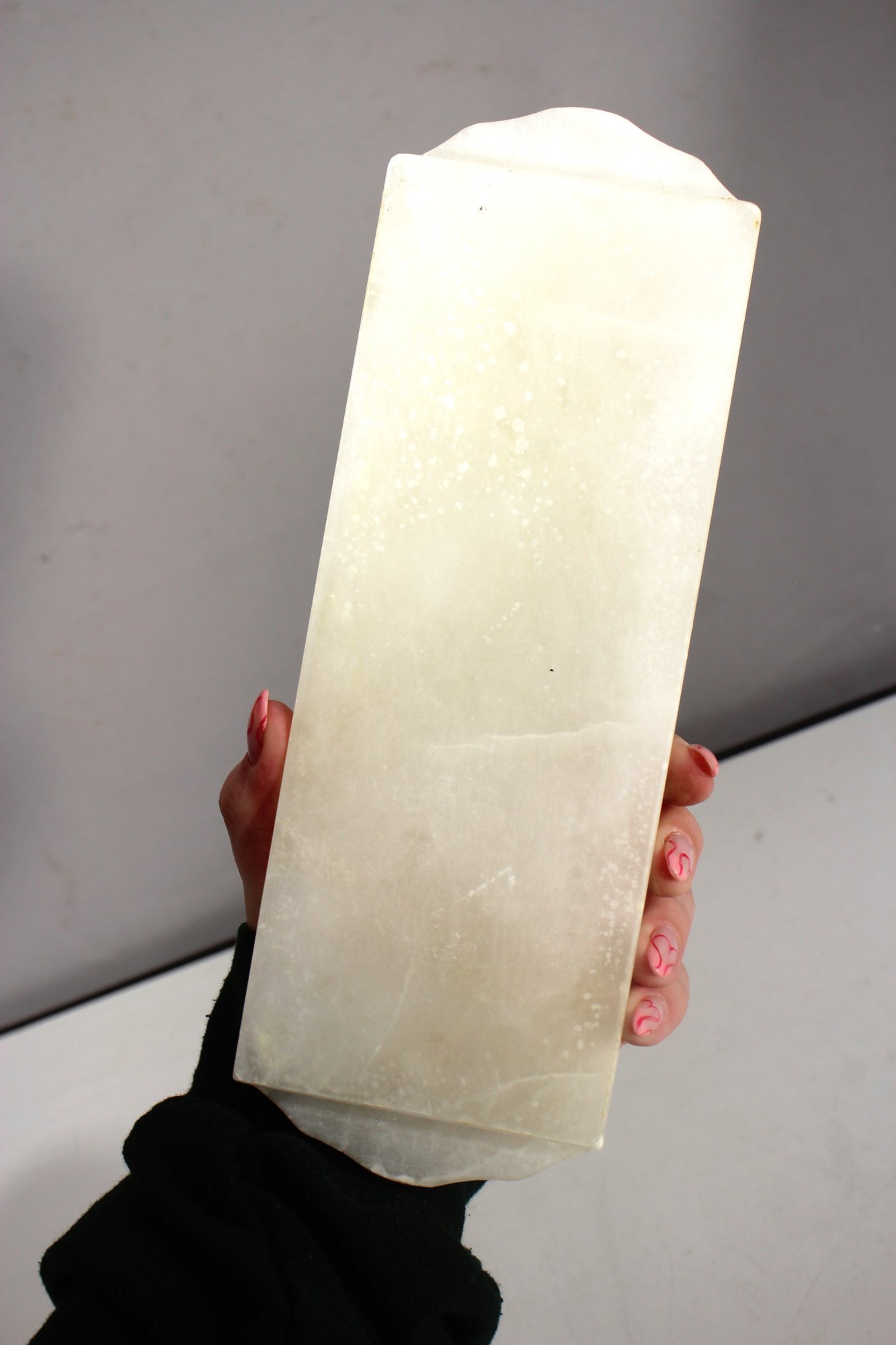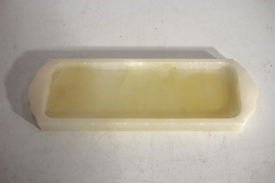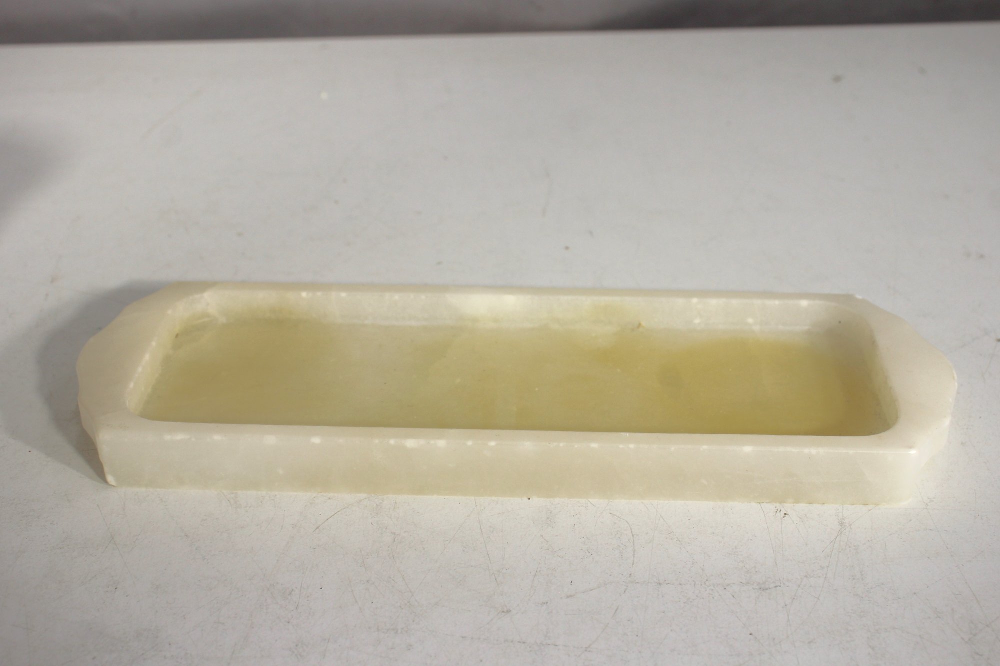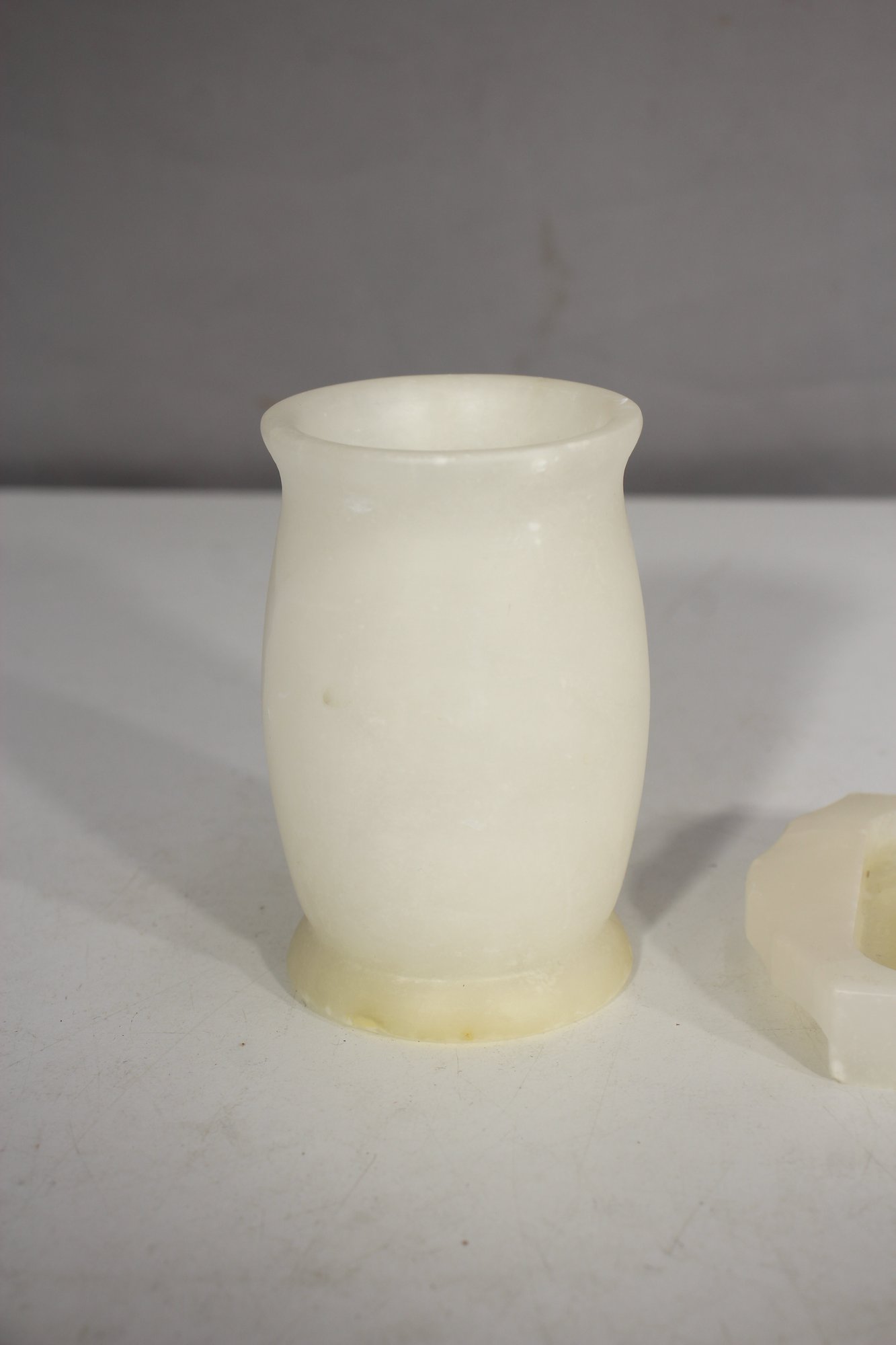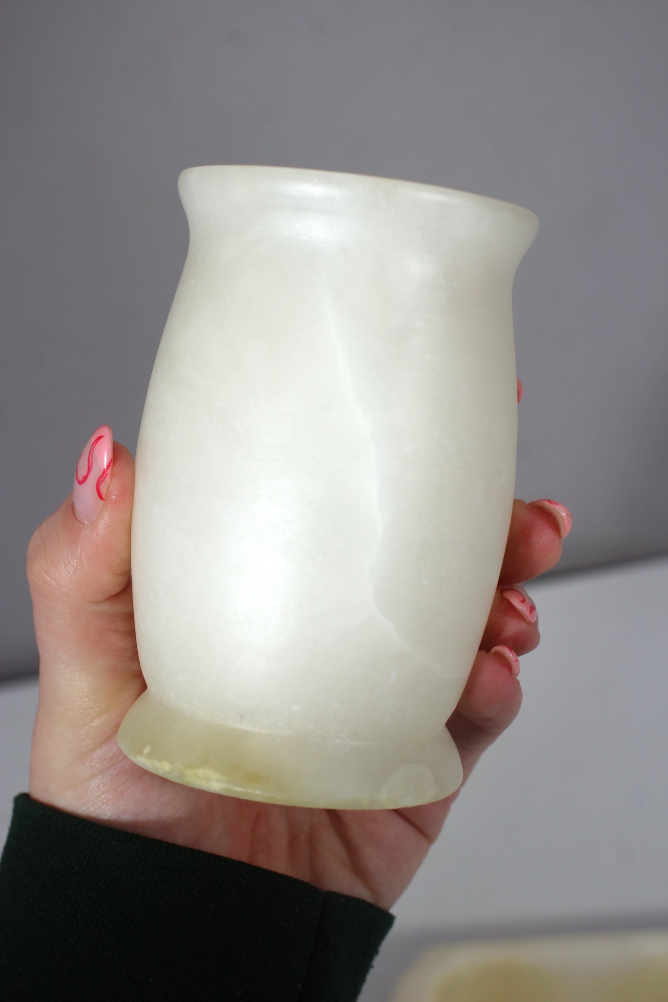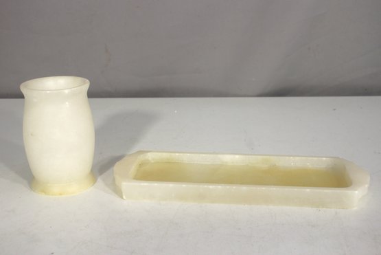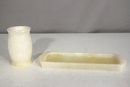 Hand-carved alabaster cup and matching tray. Smooth polished finish with subtle natural veining. Great for vanity or decorative use. See photos for condition.