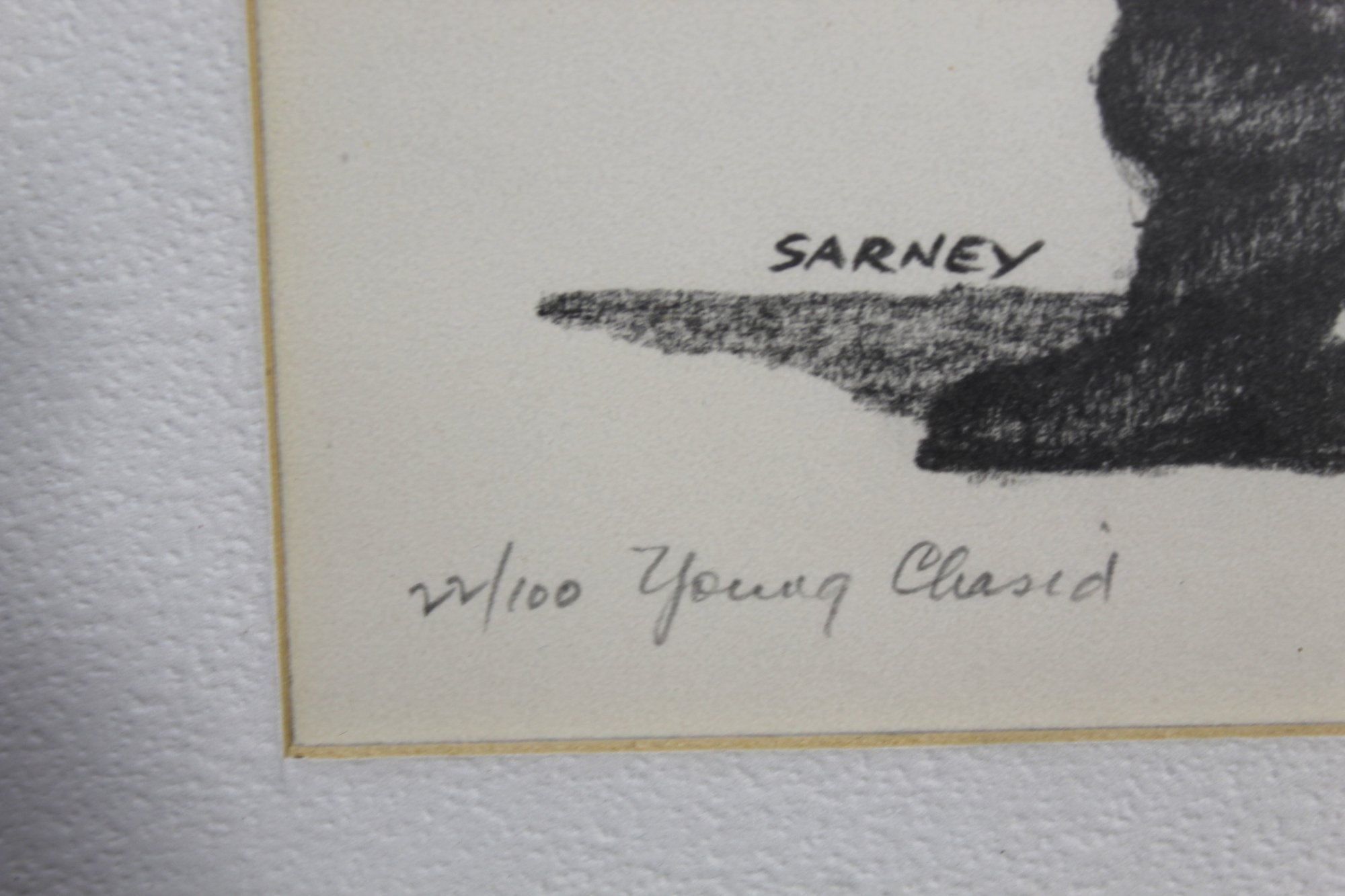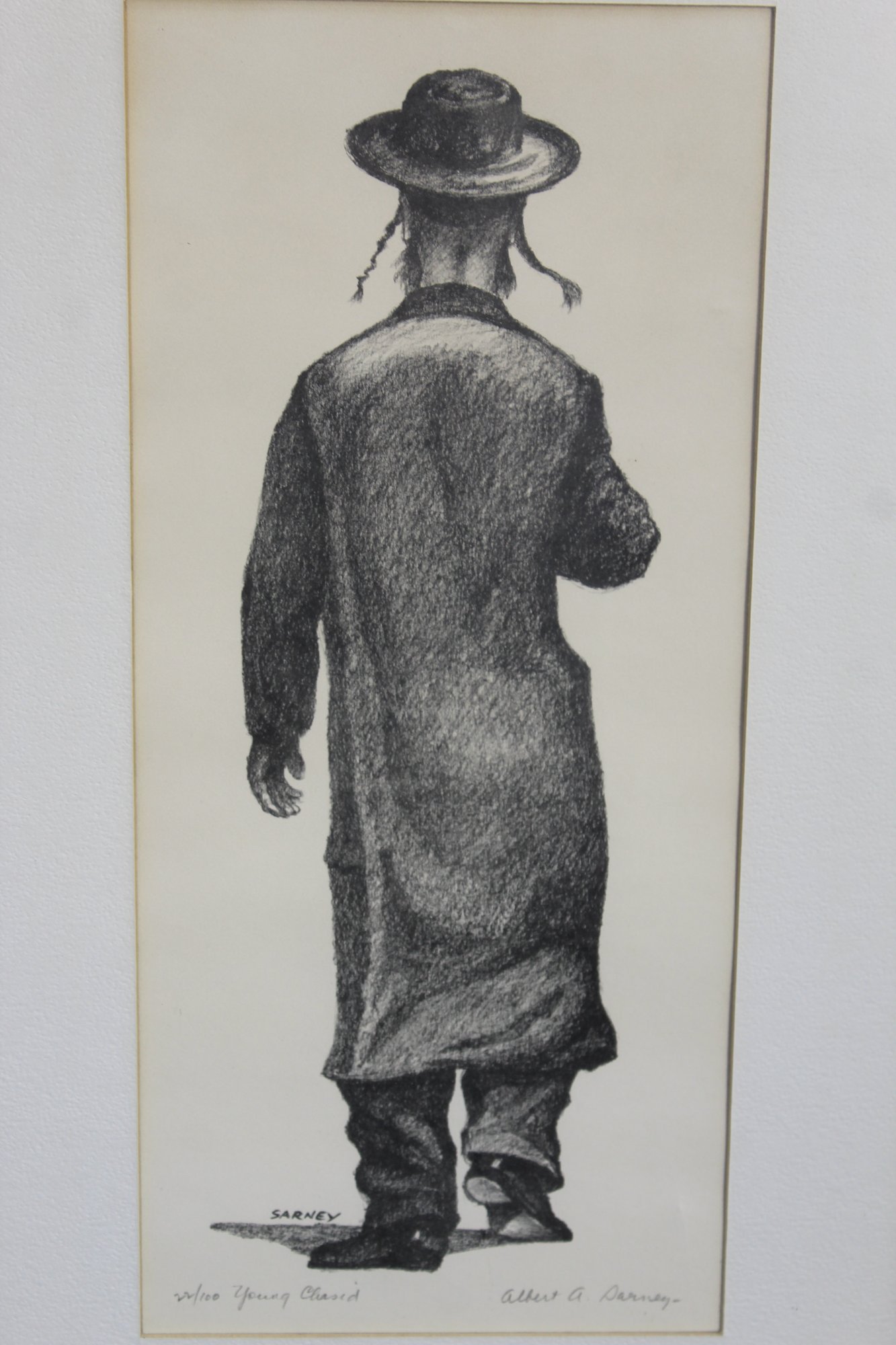 Presenting a captivating lithograph titled "Young Chasid" by artist Albert A. Sarney. This limited edition piece, numbered 22/100, beautifully portrays a rear view of a young Chasidic figure, emphasizing detailed textures and contemplative expression.