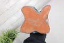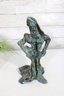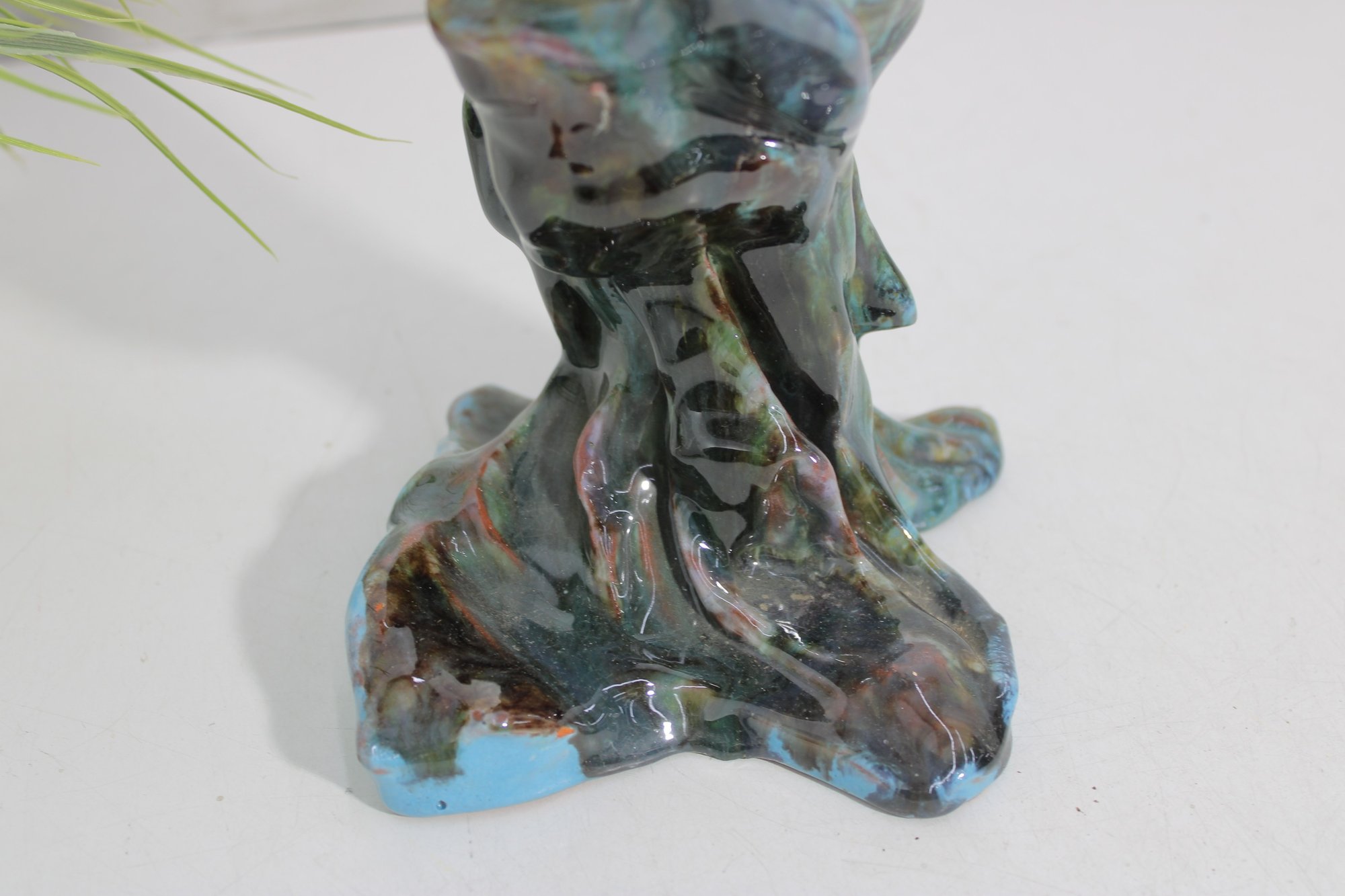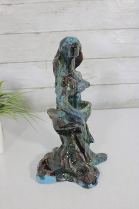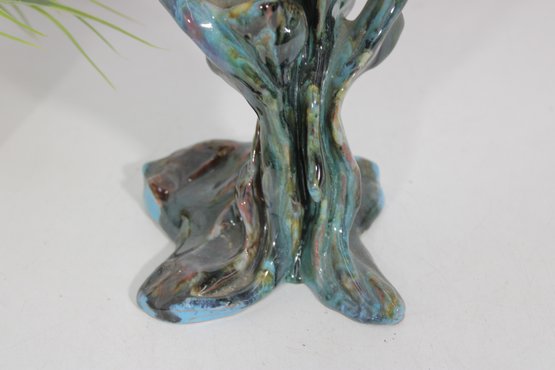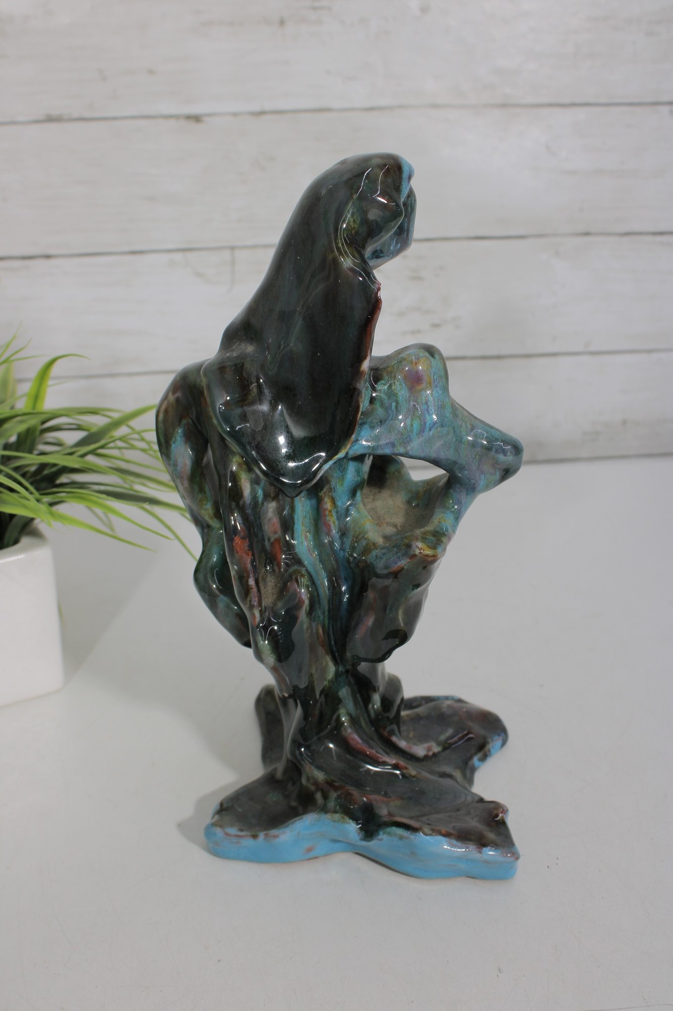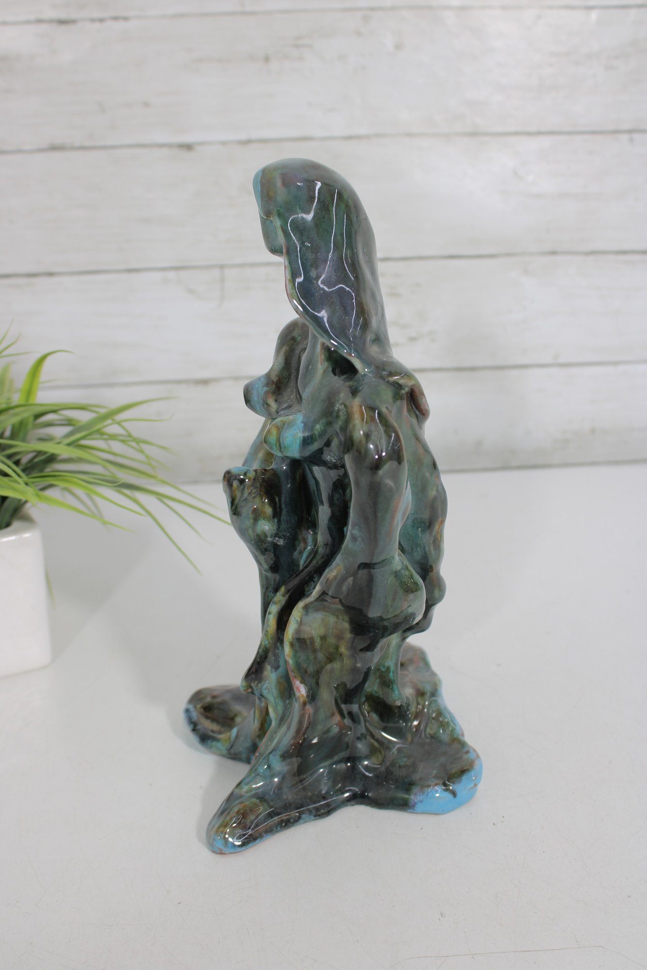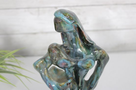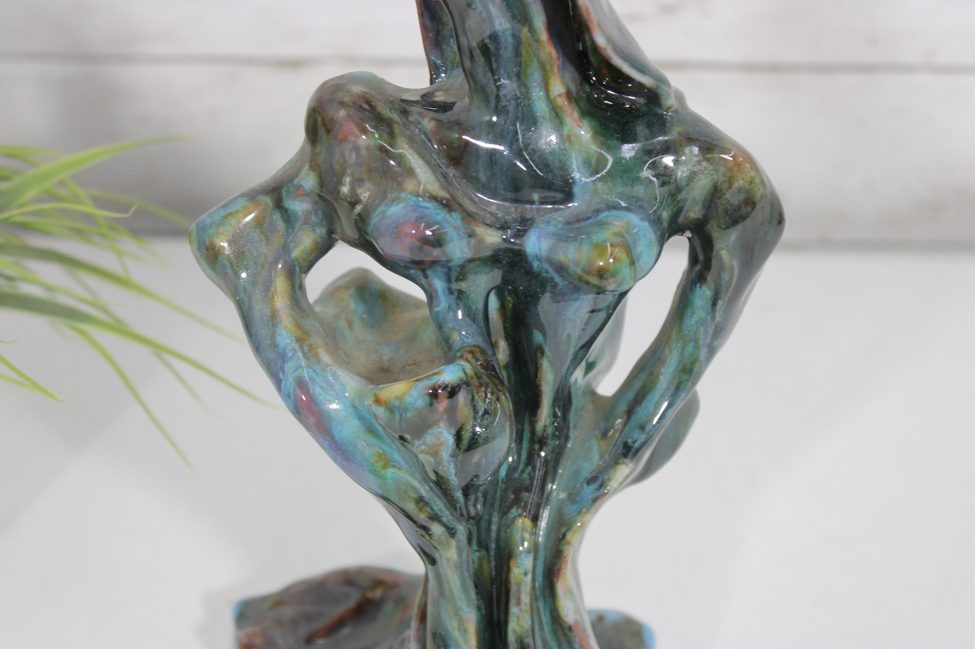 The sculpture is finished in a rich, iridescent glaze with tones of teal, green, bronze, and hints of violet, creating a dynamic surface that shifts beautifully under light. The elongated form and openwork design give the piece a sense of movement and elegance, making it a compelling focal point for any art collection or interior space.