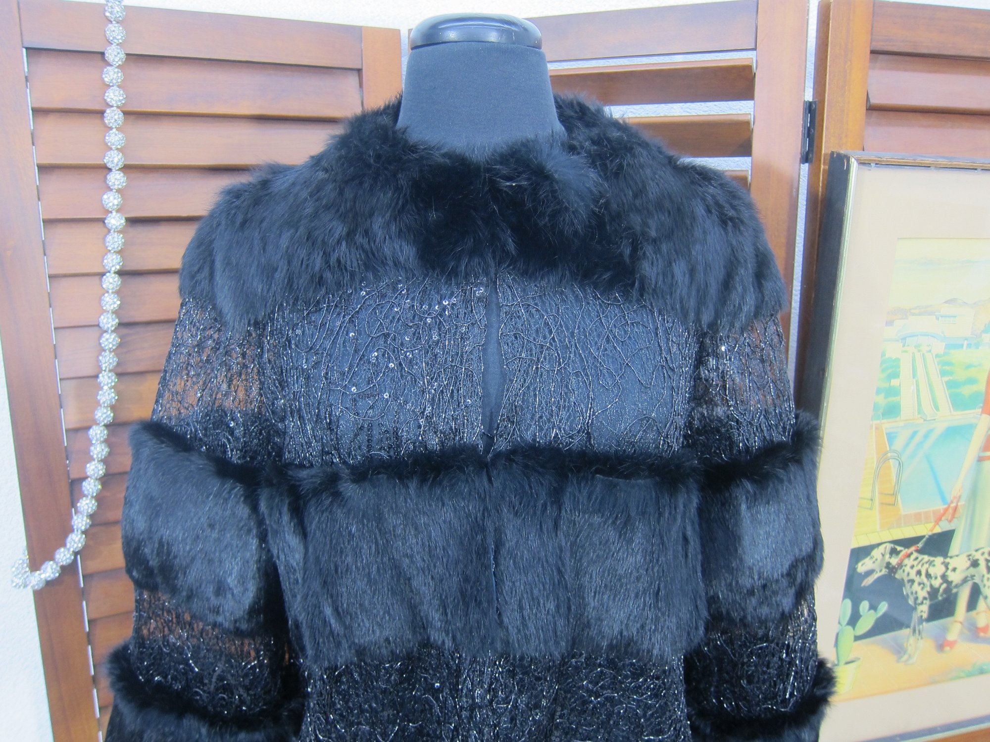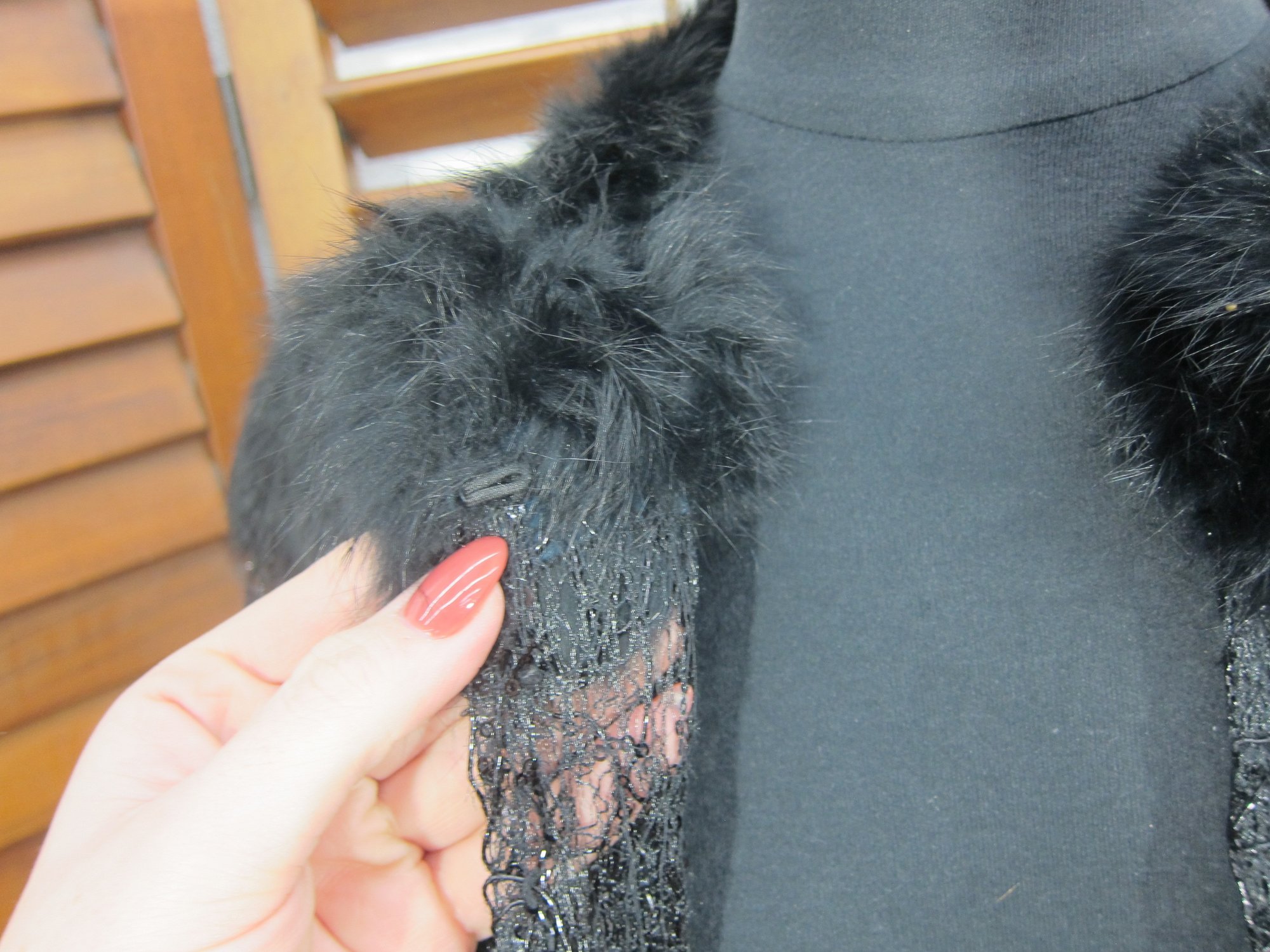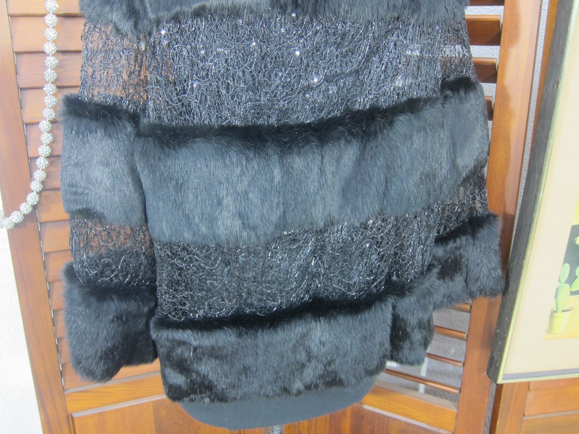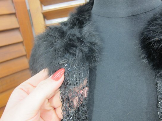 Dramatic and glamorous black statement jacket by Alberto Makali New York, featuring plush faux fur accents combined with textured lace panels and subtle sequin detailing. This eye-catching piece has a rich layered design, soft fur collar and trim, and a flattering, slightly cropped silhouette that adds instant impact to any outfit.