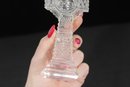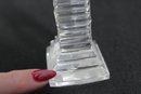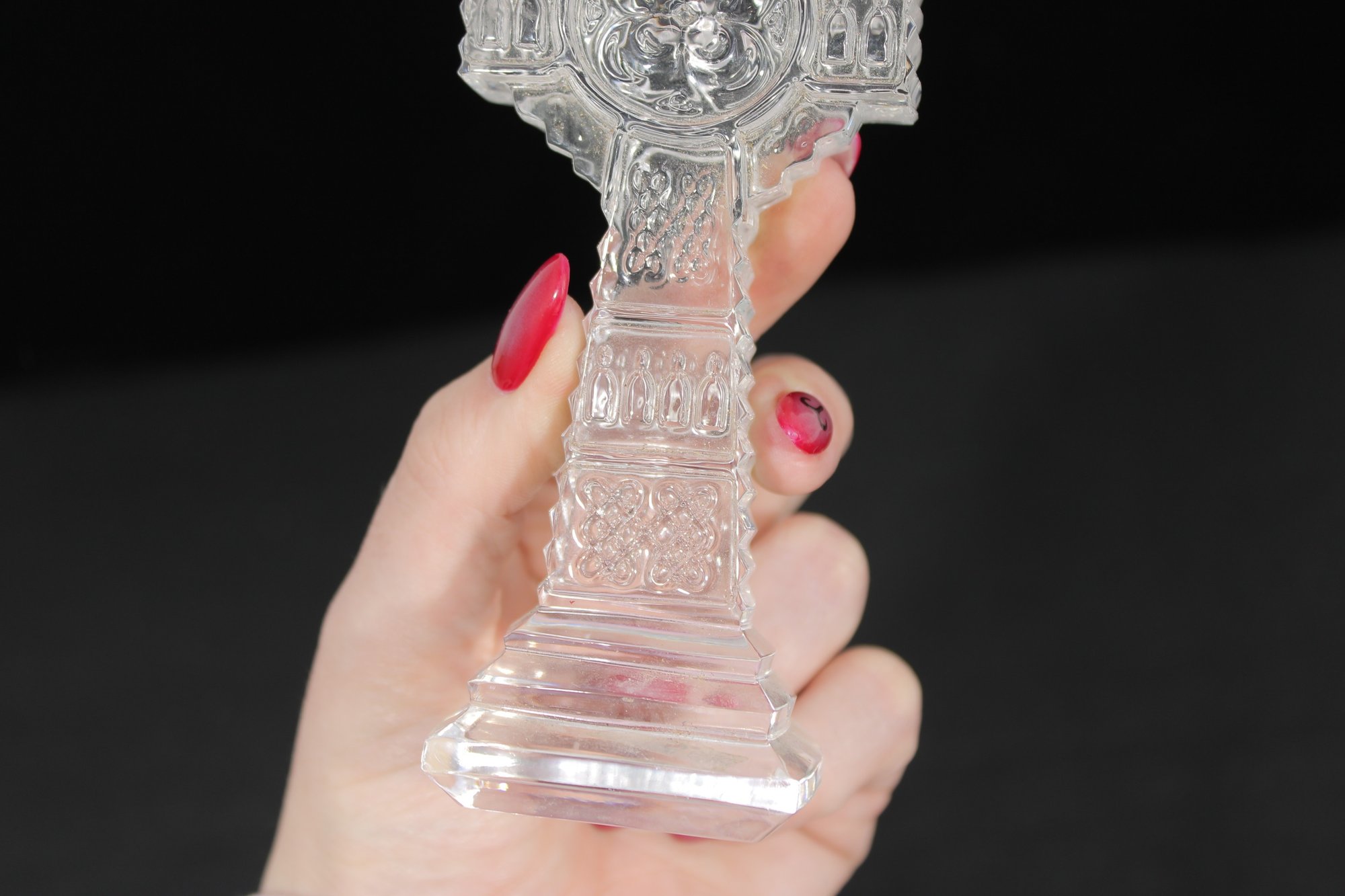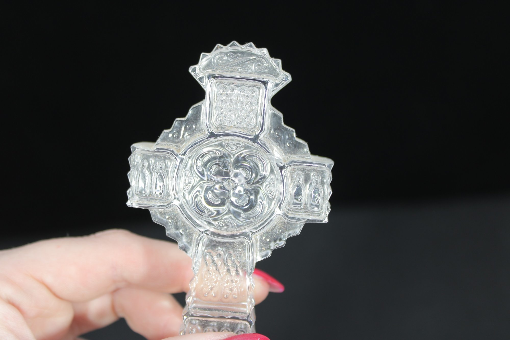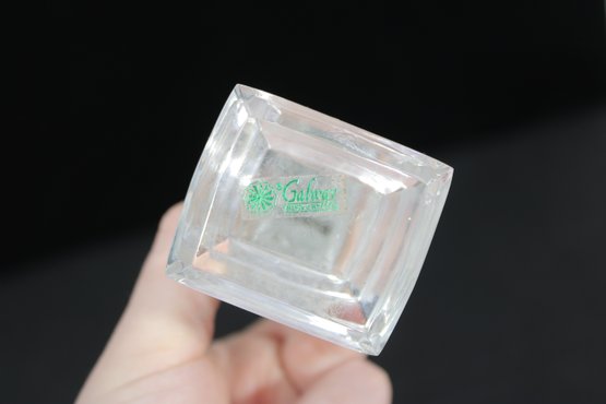 The clear crystal construction catches and reflects light beautifully, making it a striking devotional or decorative display piece. The base retains the original Galway Crystal mark/sticker, confirming authenticity.