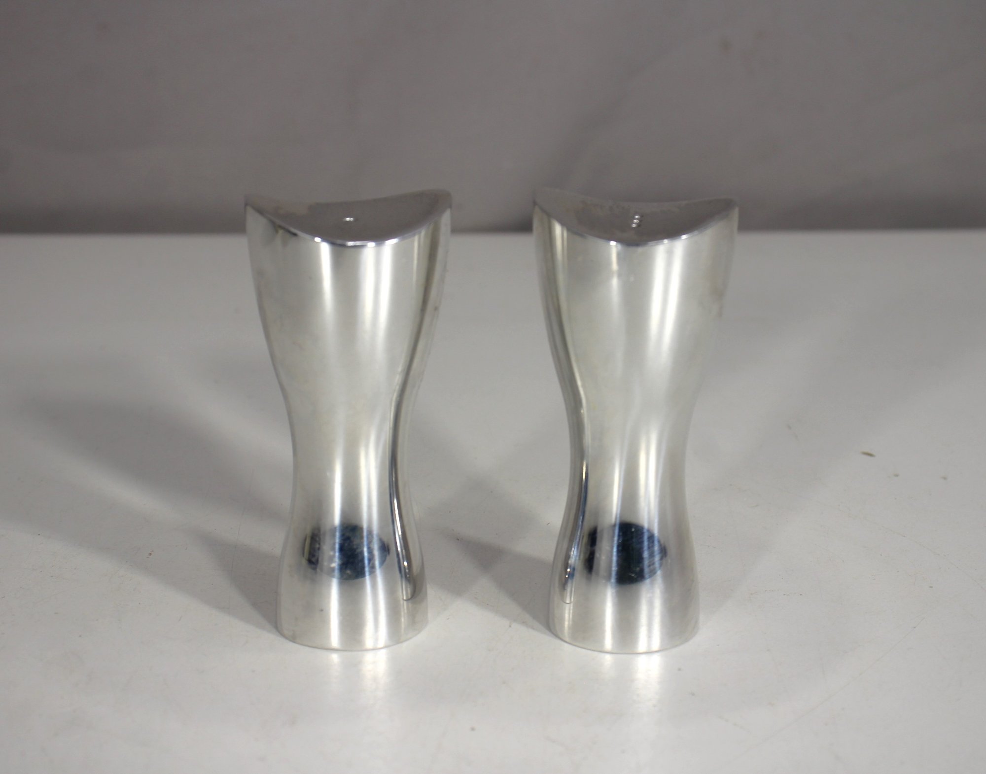 this elegant Nambe Studio 6088 salt and pepper shaker set, a classic of mid-century modern design. Crafted from Nambe's signature polished metal alloy, these sleek shakers feature an organic, sculptural hourglass silhouette that’s both ergonomic and eye-catching.
