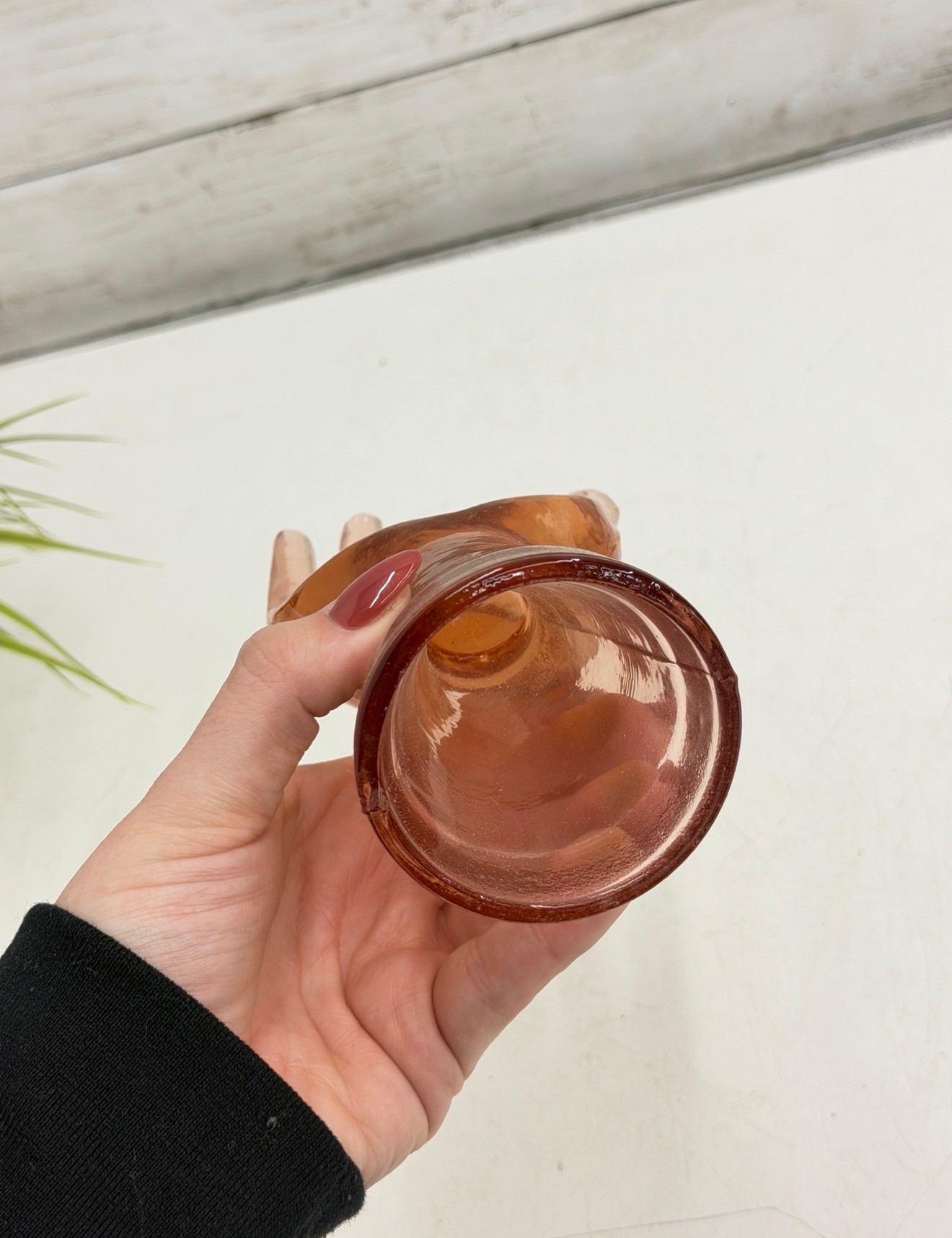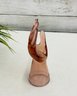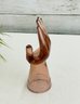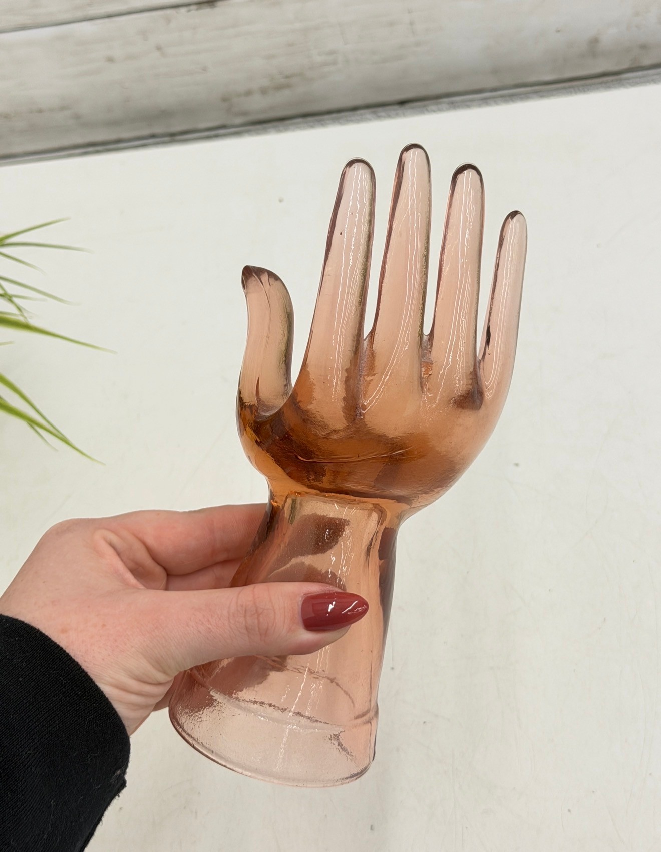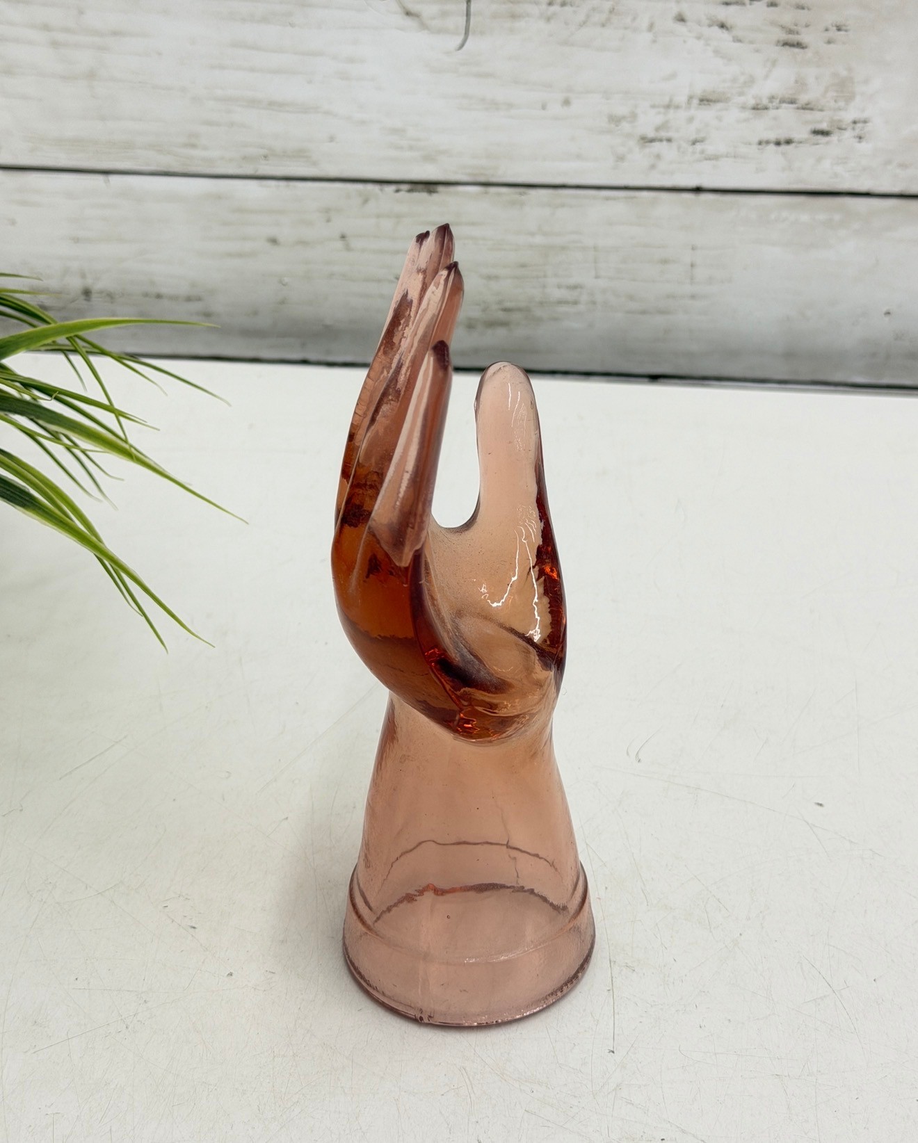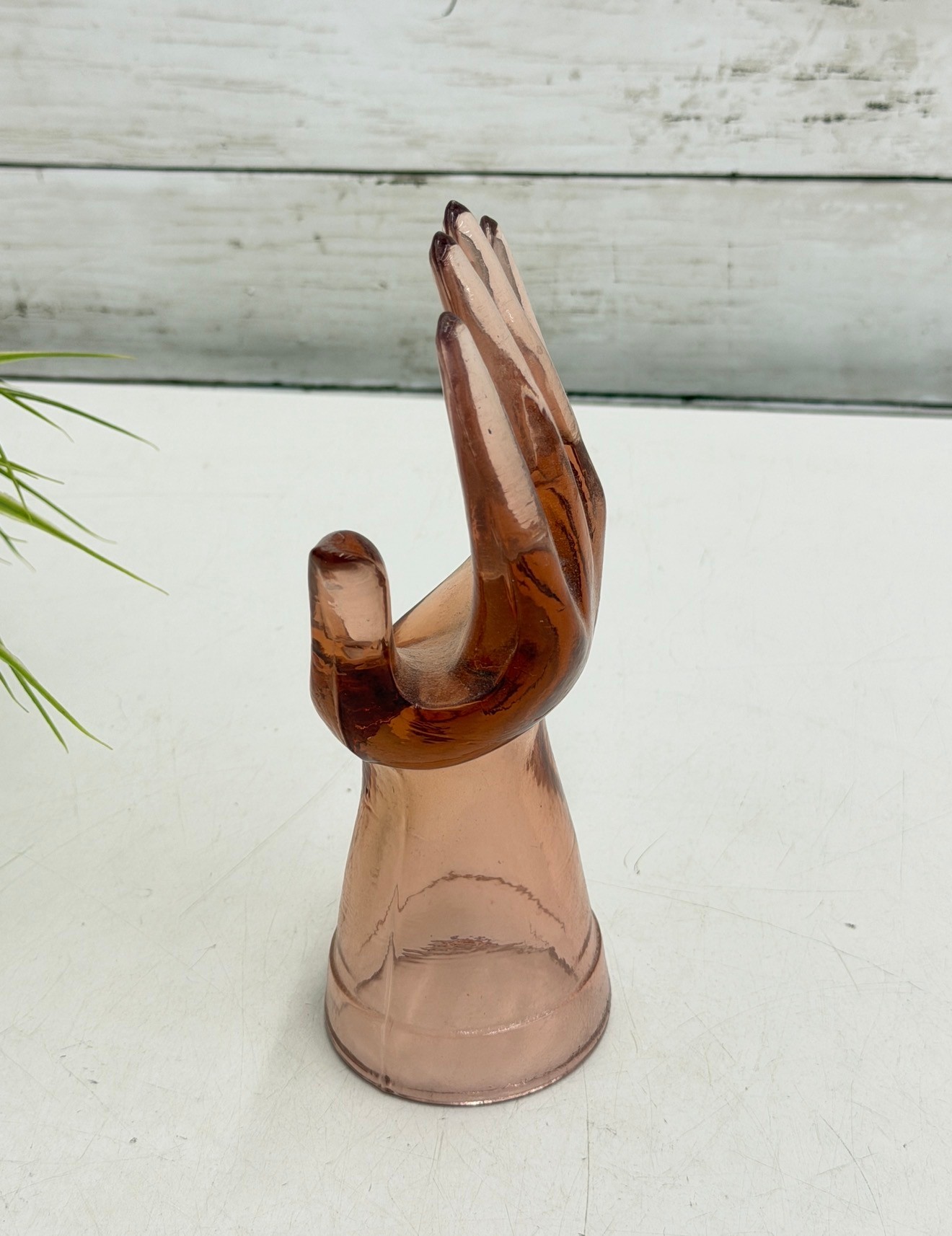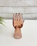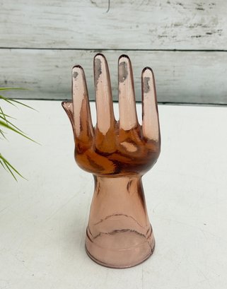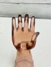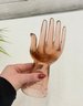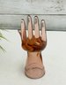 Decorative amber-toned glass hand sculpture featuring an open palm form with gently curved fingers. Made of translucent glass with warm honey hues, this piece serves beautifully as a jewelry or ring holder while also functioning as a striking sculptural display object.