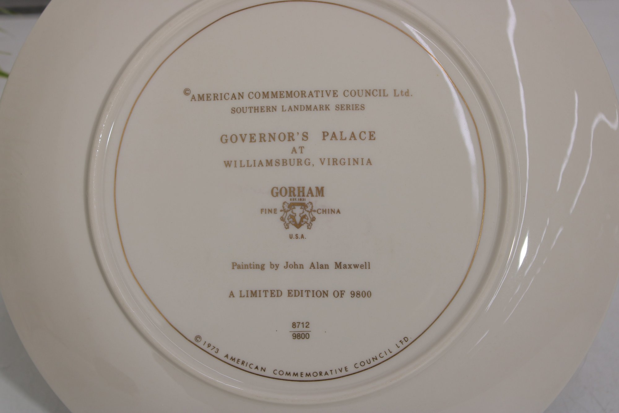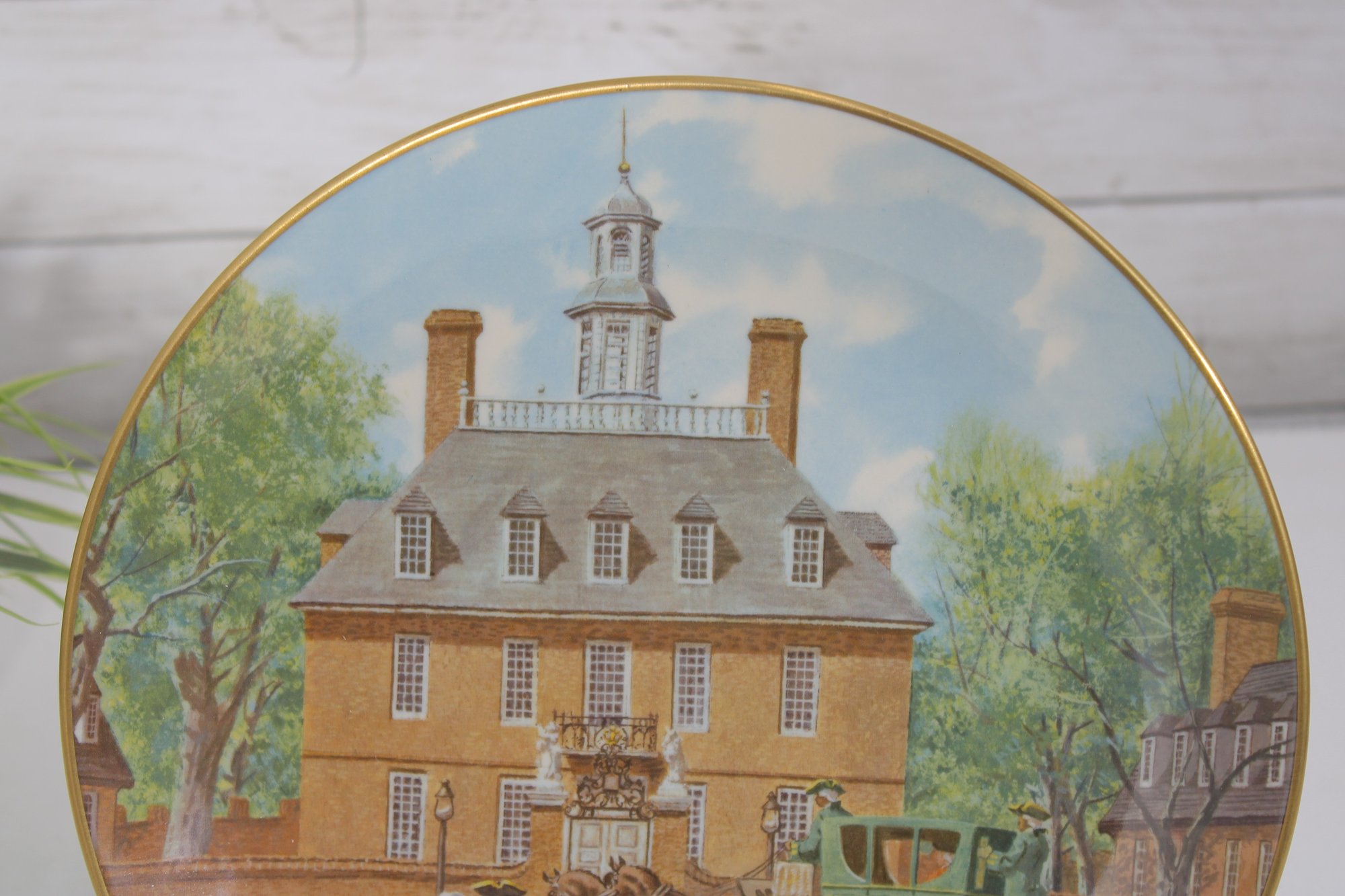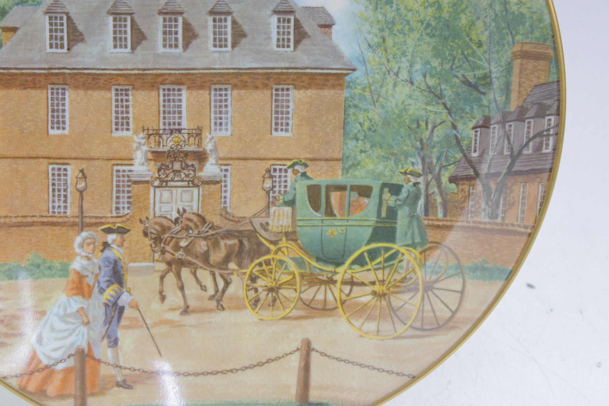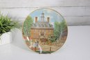 a decorative commemorative plate produced by the American Commemorative Council, Ltd., featuring Governors Palace, Williamsburg, Virginia. The artwork depicts a colonial-era scene with figures, horse-drawn carriage, and the historic palace in the background, finished with a classic gold-tone rim.