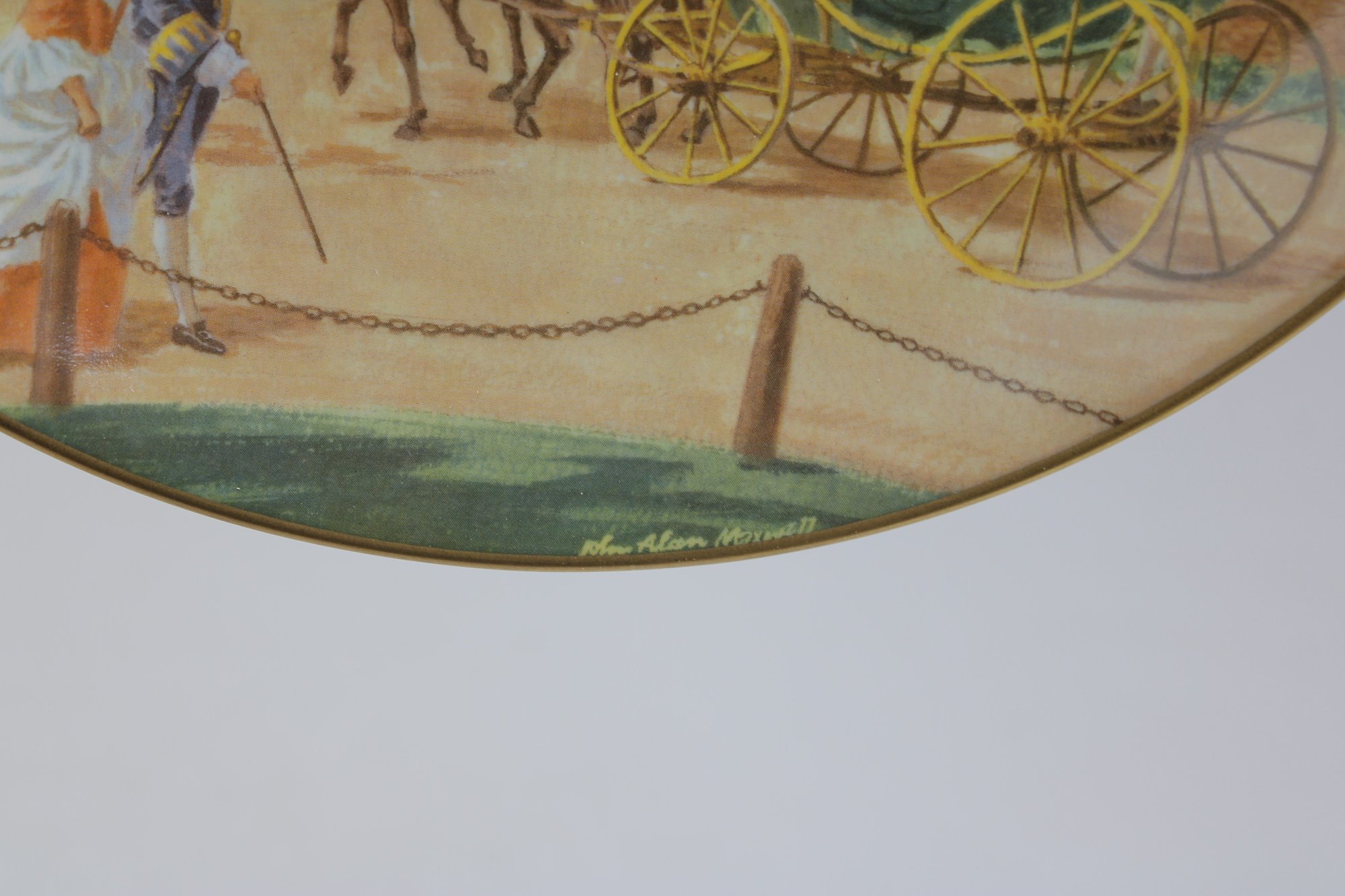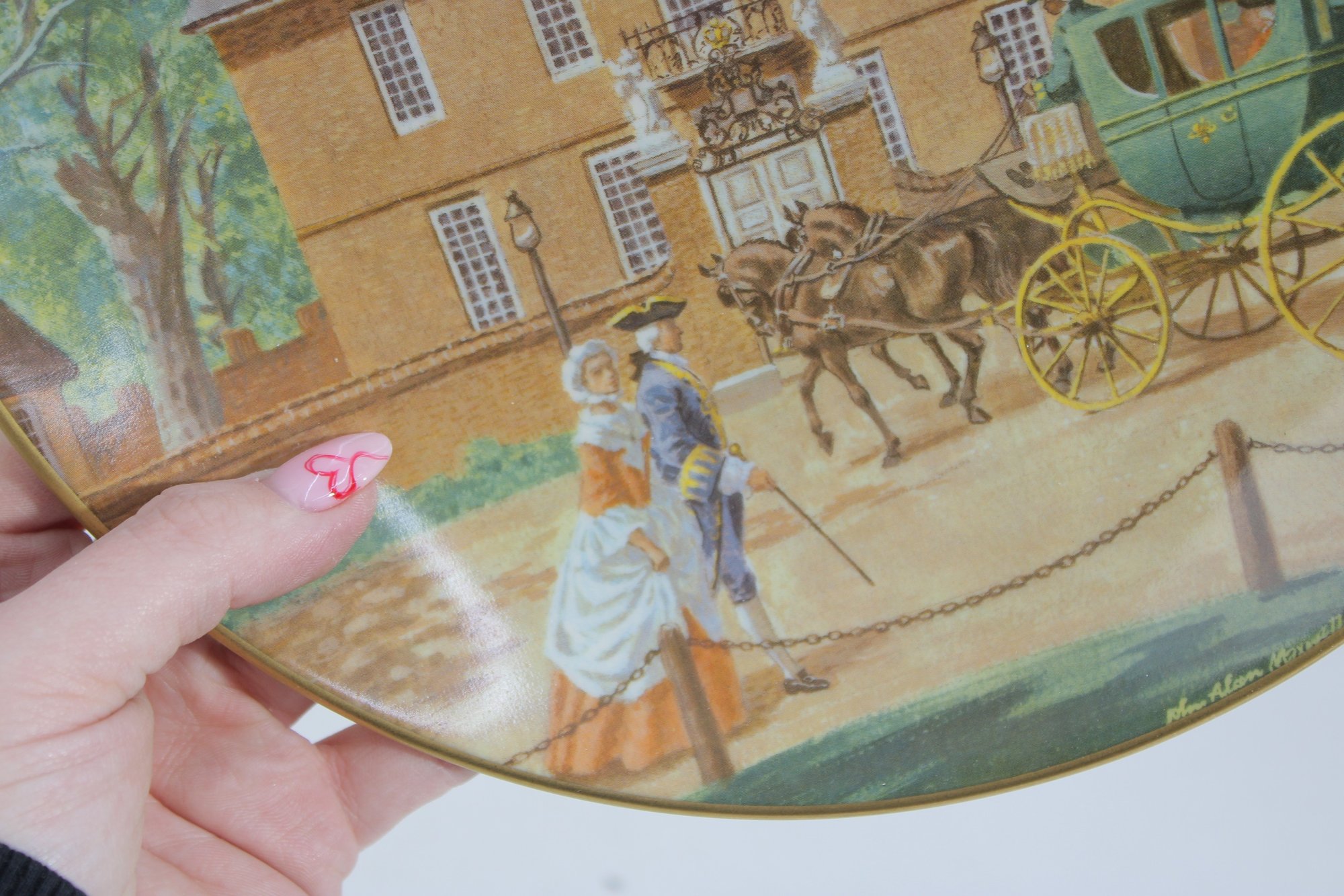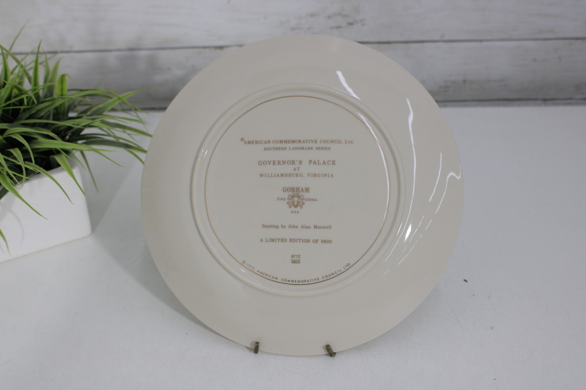 a decorative commemorative plate produced by the American Commemorative Council, Ltd., featuring Governors Palace, Williamsburg, Virginia. The artwork depicts a colonial-era scene with figures, horse-drawn carriage, and the historic palace in the background, finished with a classic gold-tone rim.