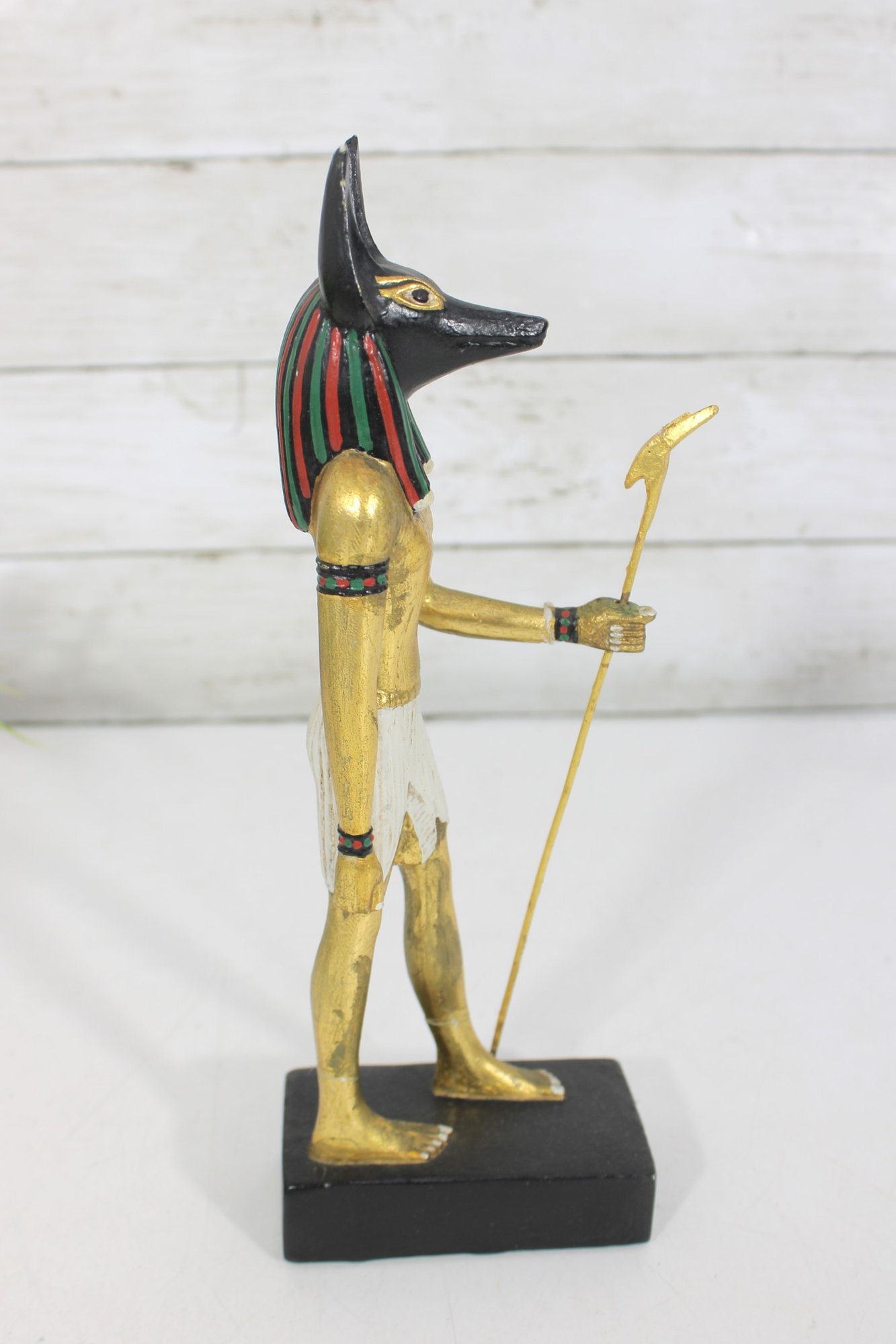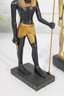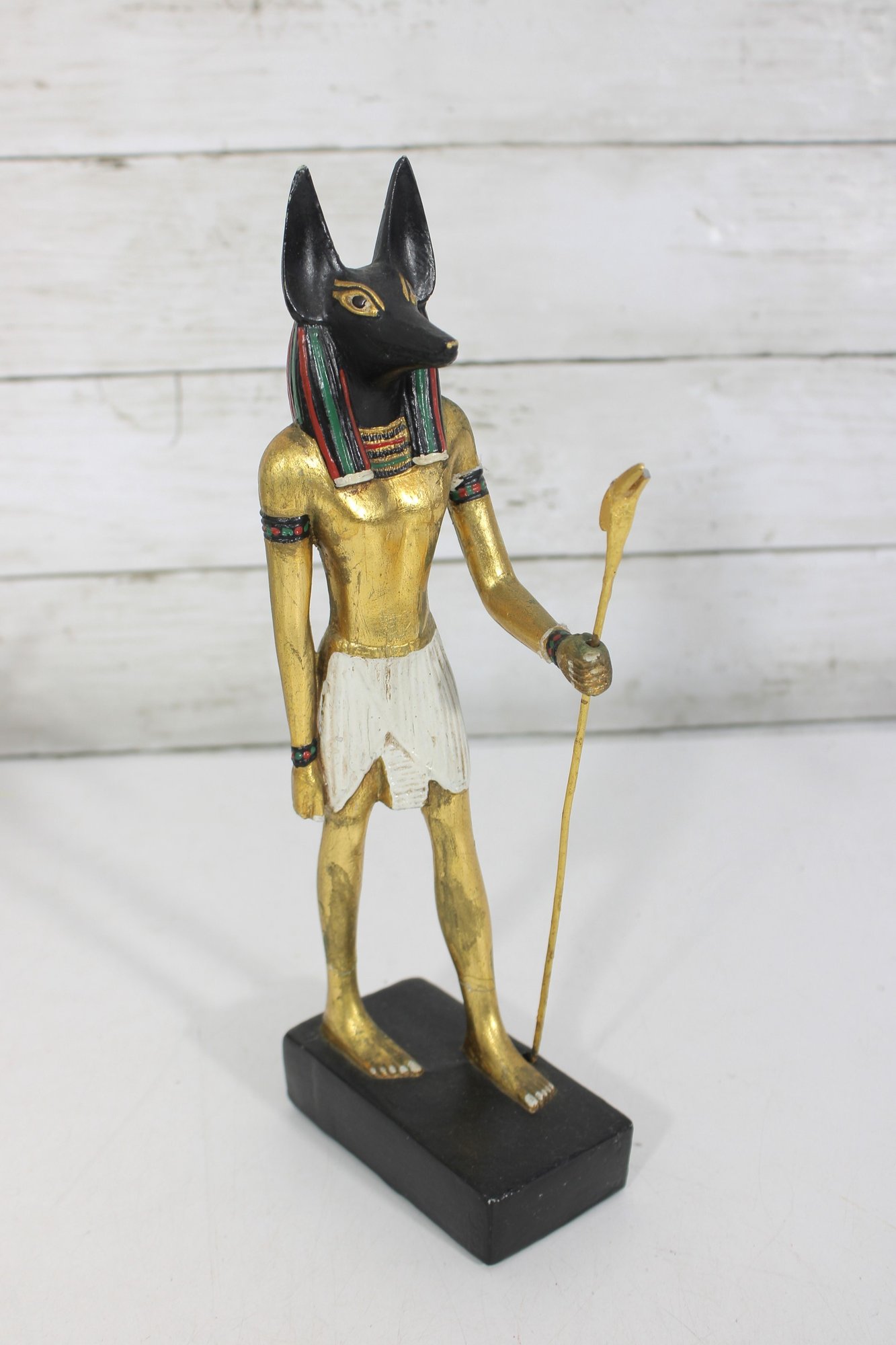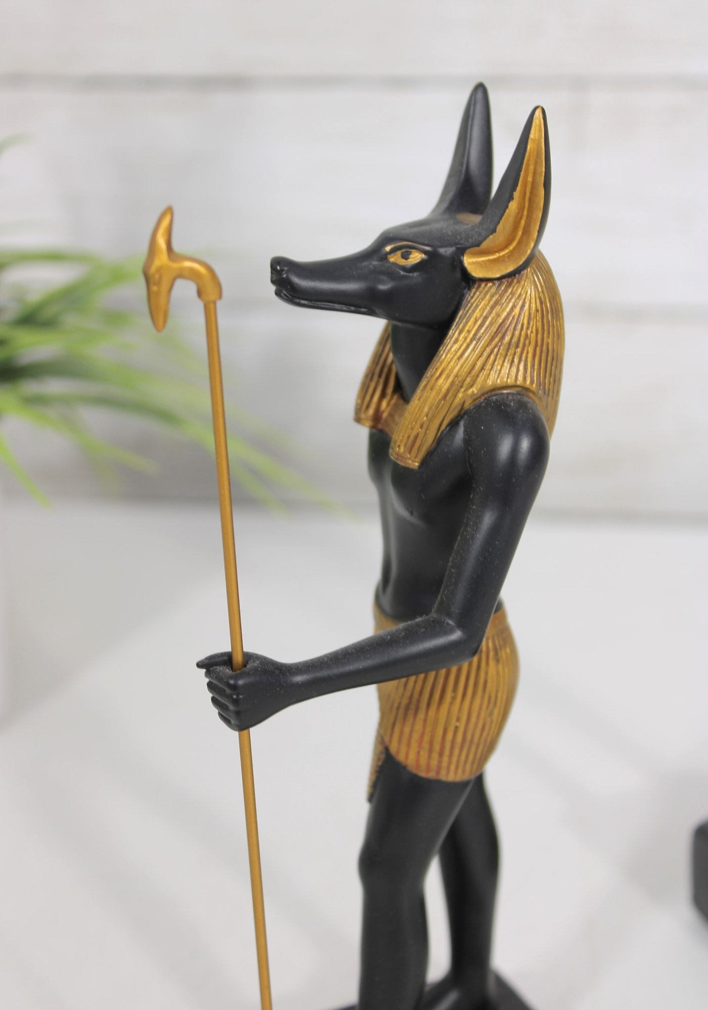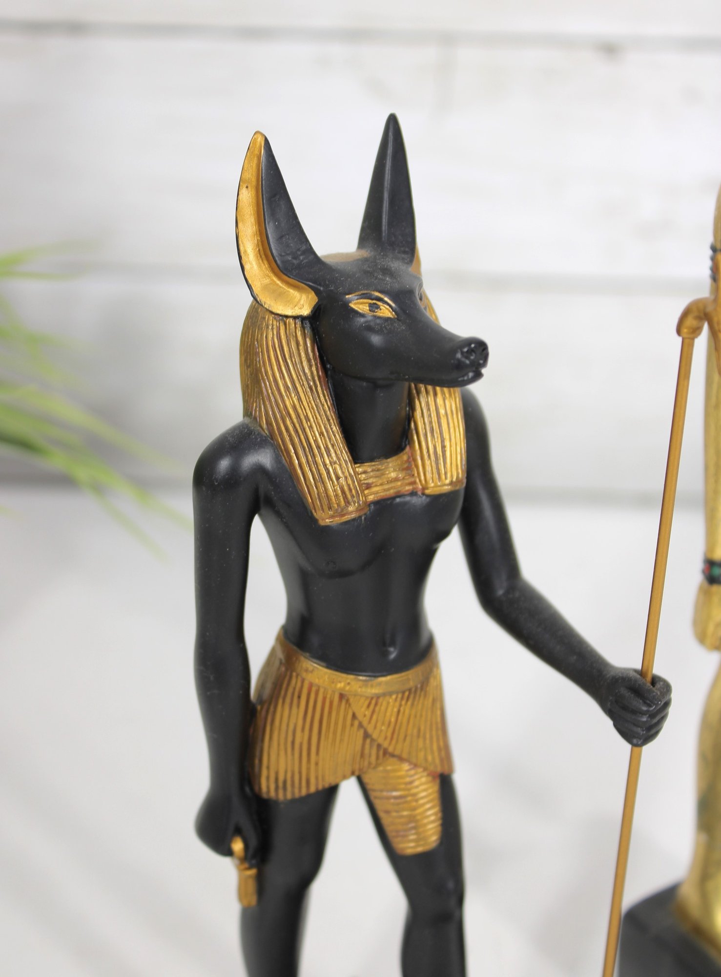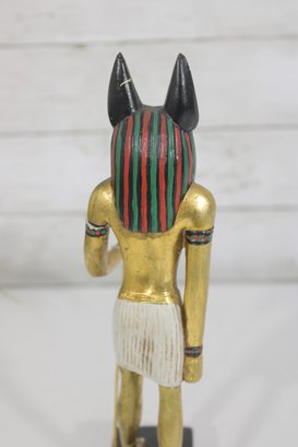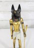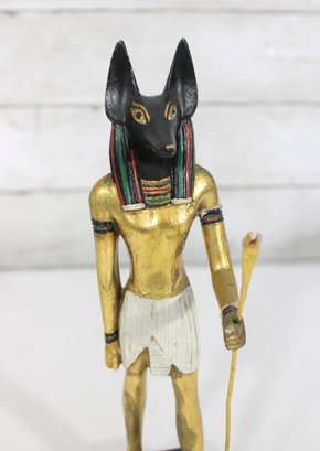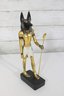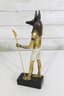 Striking pair of Ancient Egyptian-style Anubis figurines, representing the jackal-headed god associated with the afterlife and protection. These statues feature classic Egyptian design elements, including traditional headdresses, staffs, and detailed body forms.