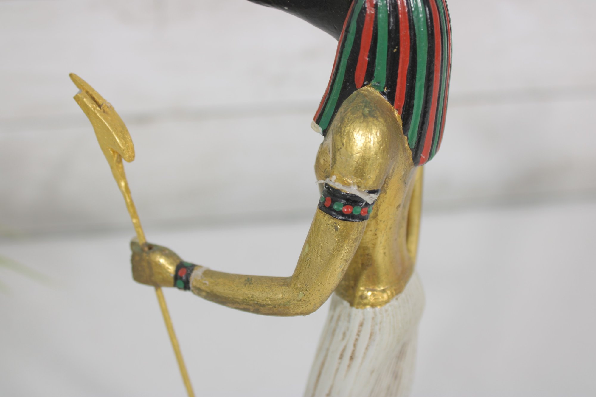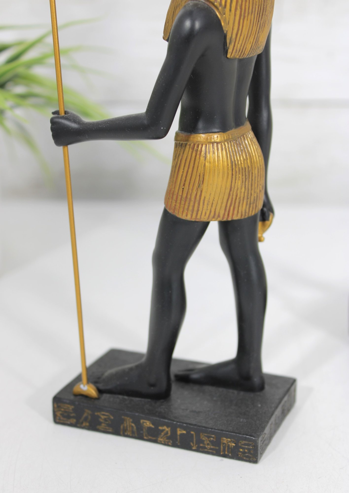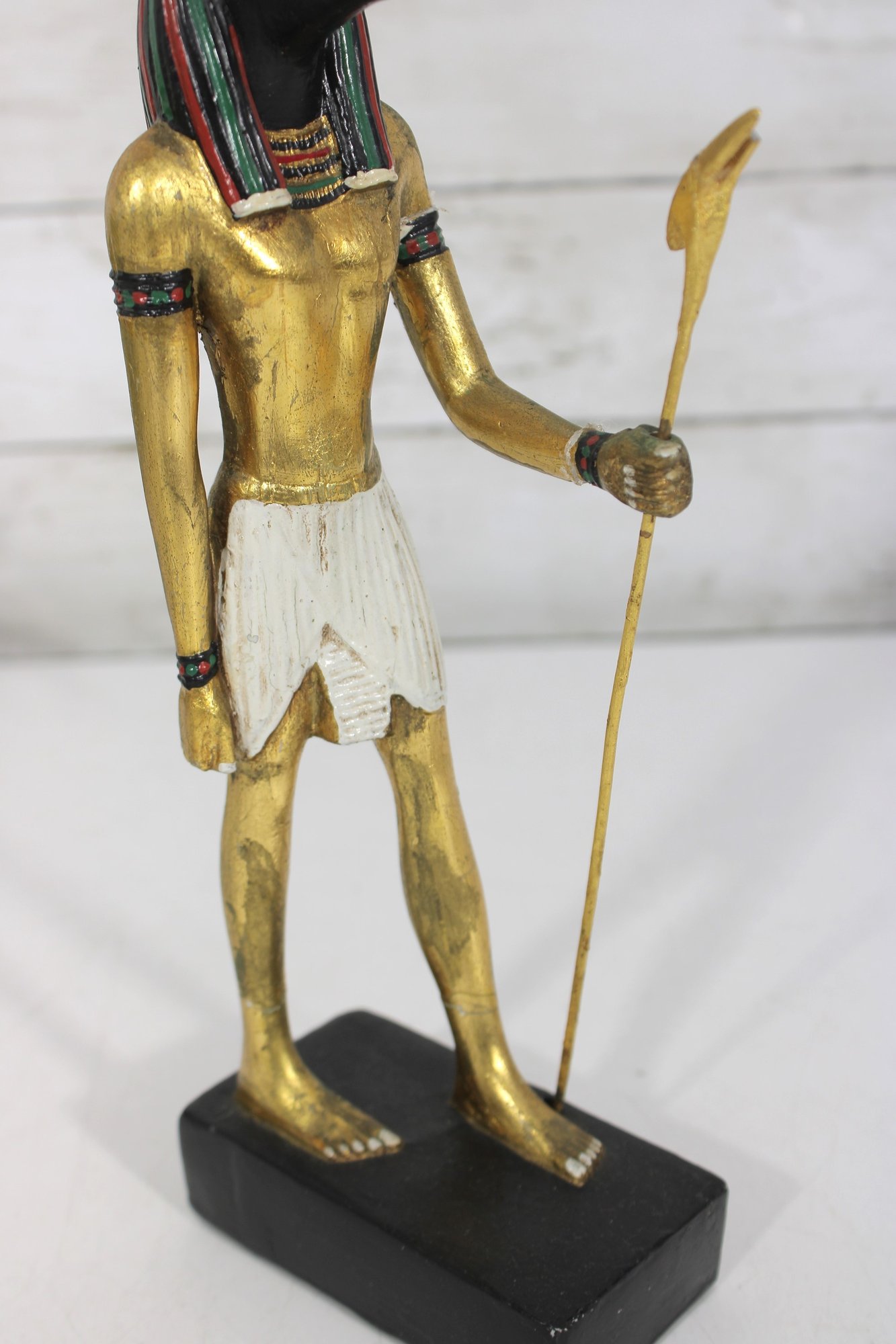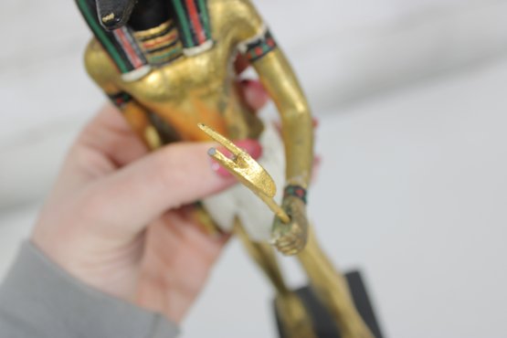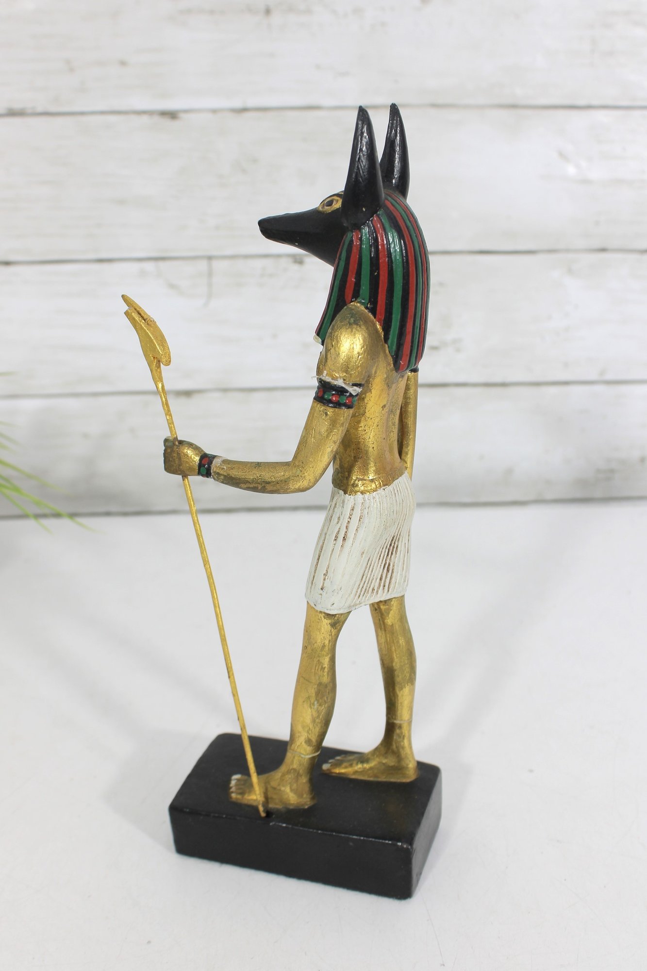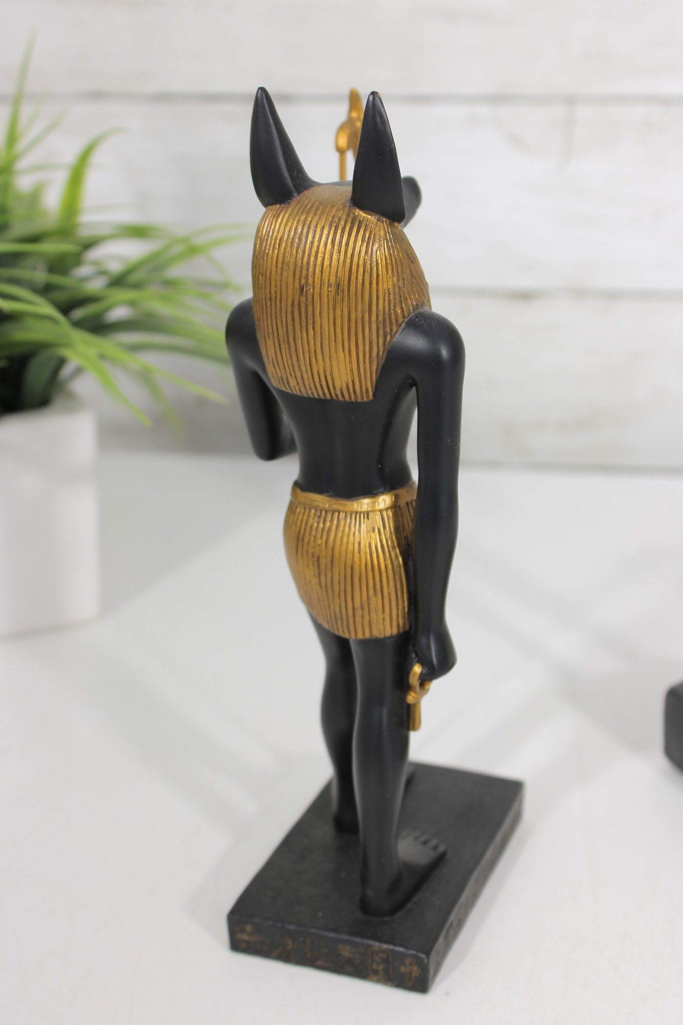 Striking pair of Ancient Egyptian-style Anubis figurines, representing the jackal-headed god associated with the afterlife and protection. These statues feature classic Egyptian design elements, including traditional headdresses, staffs, and detailed body forms.