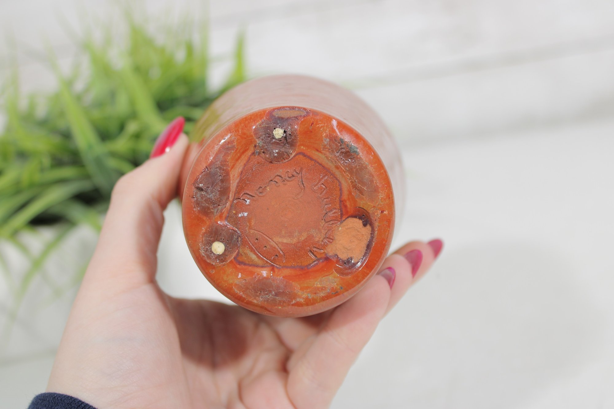 This piece has a timeless, understated elegance and works well as both a decorative accent or small flower vase. The base is signed “Nancy Hulbert,” confirming its handmade origin.