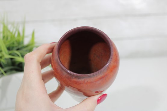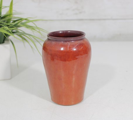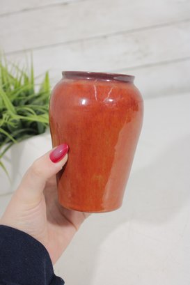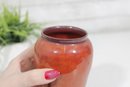 Beautiful signed Nancy Hulbert art pottery vase featuring a rich red-orange glaze with subtle tonal variations and a deeper, darker rim. The softly rounded form and smooth finish highlight the warmth and depth of the glaze, characteristic of studio pottery craftsmanship.