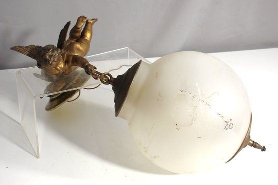 Enhance your space with this stunning antique brass cherub pendant light featuring a frosted glass globe. Perfect for adding a touch of vintage charm, this light showcases: