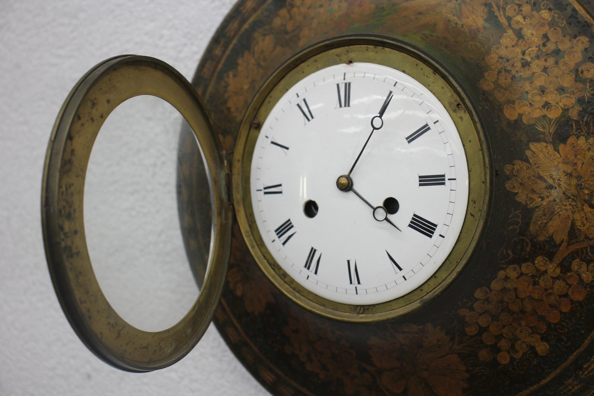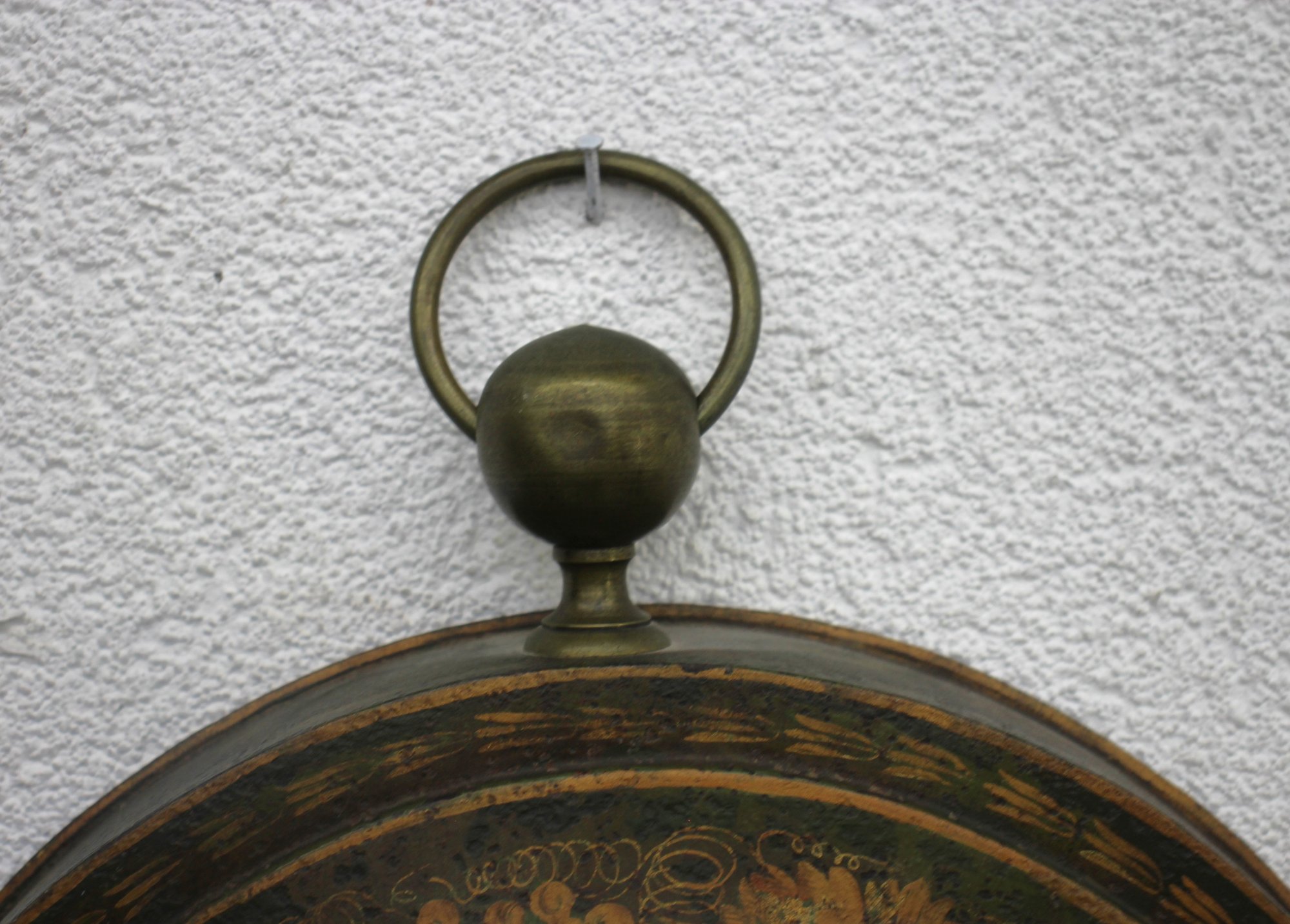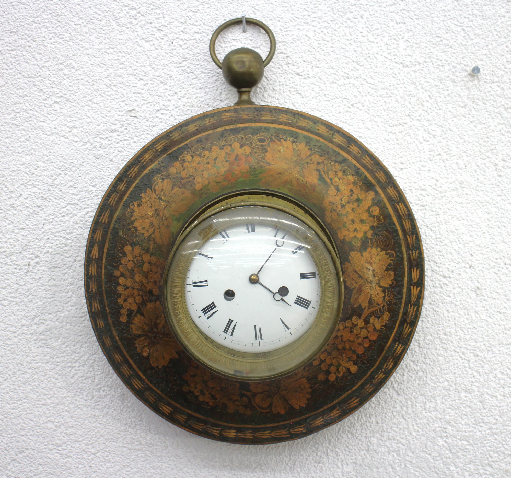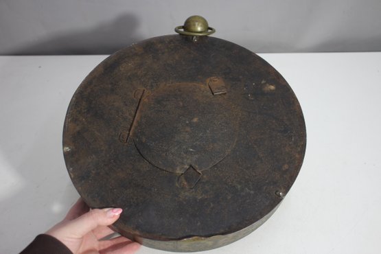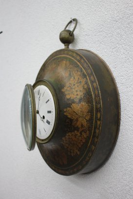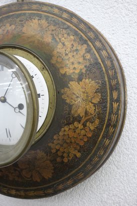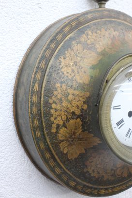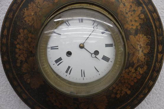 This stunning antique 15-inch round wall clock features a beautifully aged hand-painted floral design on a metal frame, adding a touch of vintage elegance to any space. The clock has a classic Roman numeral face with a domed glass cover, giving it an old-world charm.