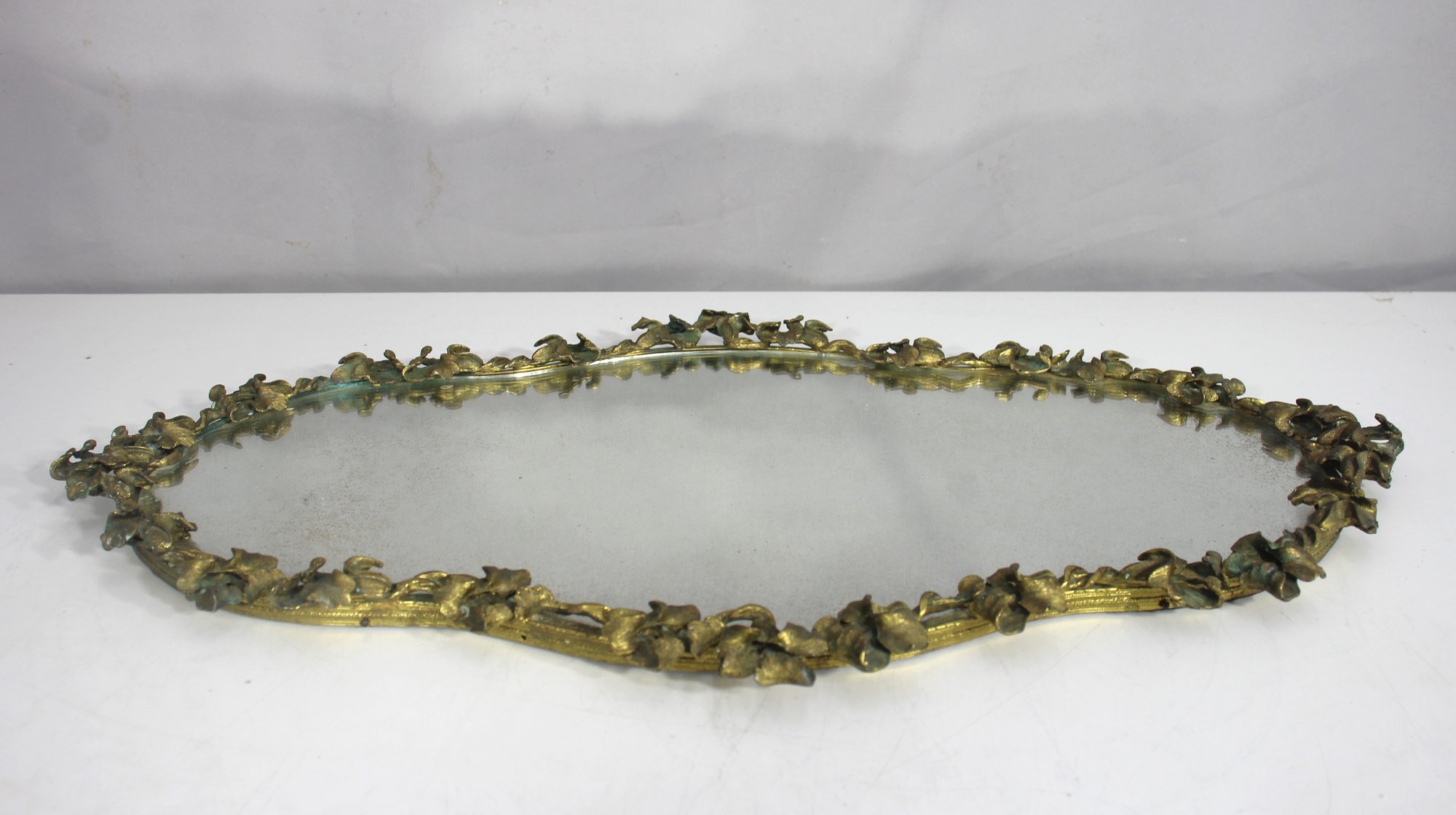 This stunning antique vanity mirror tray features an ornate gilded floral frame in a French Rococo style, perfect for displaying perfume bottles, jewelry, or as an elegant centerpiece.